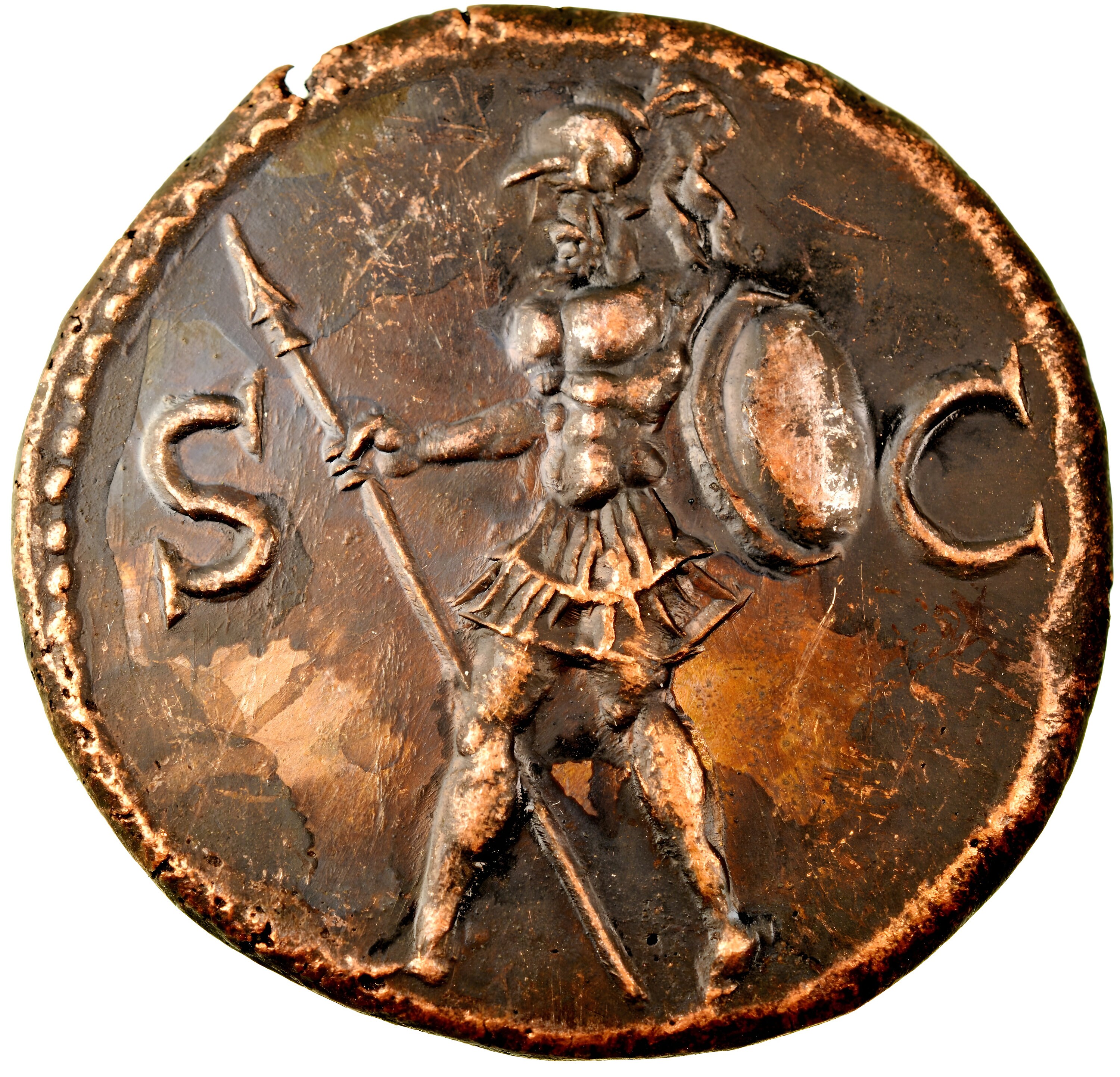 Reverse side: Mars, helmeted and cuirassed, advancing l., holding shield and spear