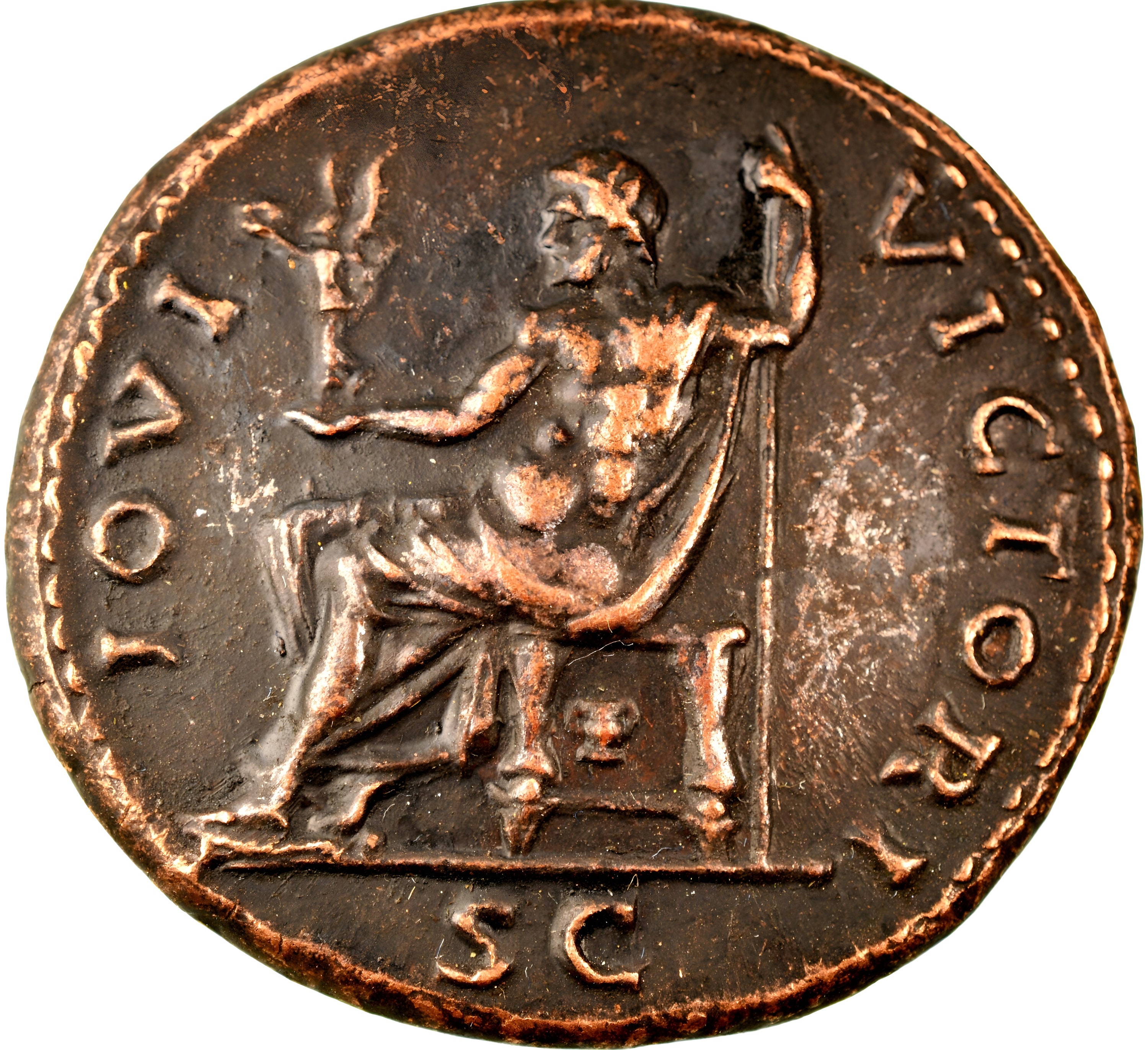 Inscription Reverse: Jupiter sitting to the left, holding Victoria on the right hand and sceptre in the left hand, IOVI VICTORI, bottom S C
