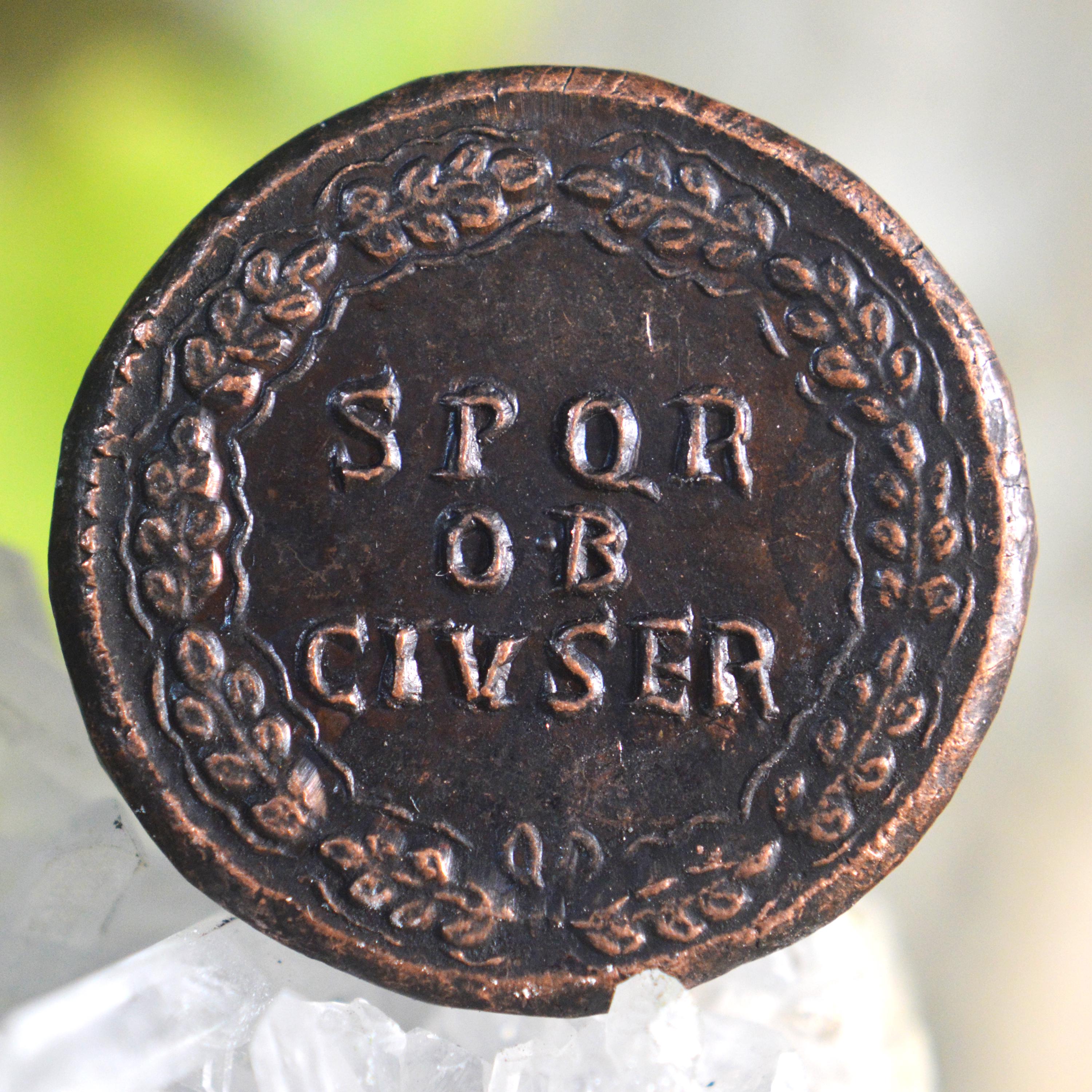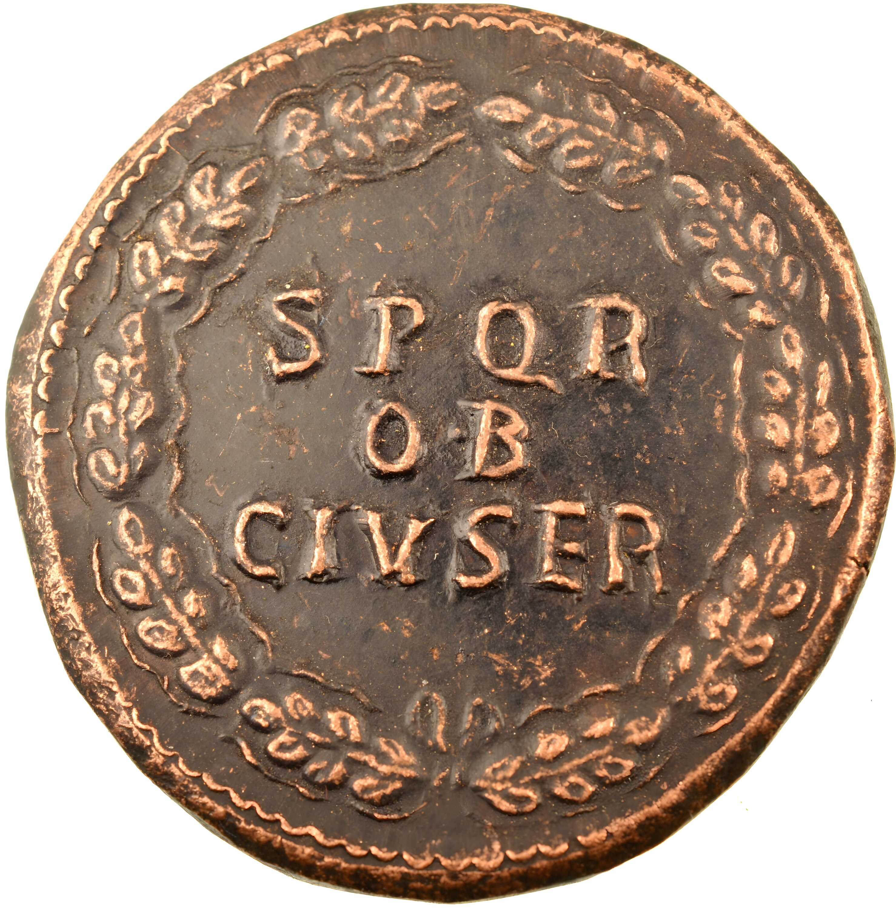 Reverse side: Legend in three lines within oak wreath, SPQR-OB-CIV SER