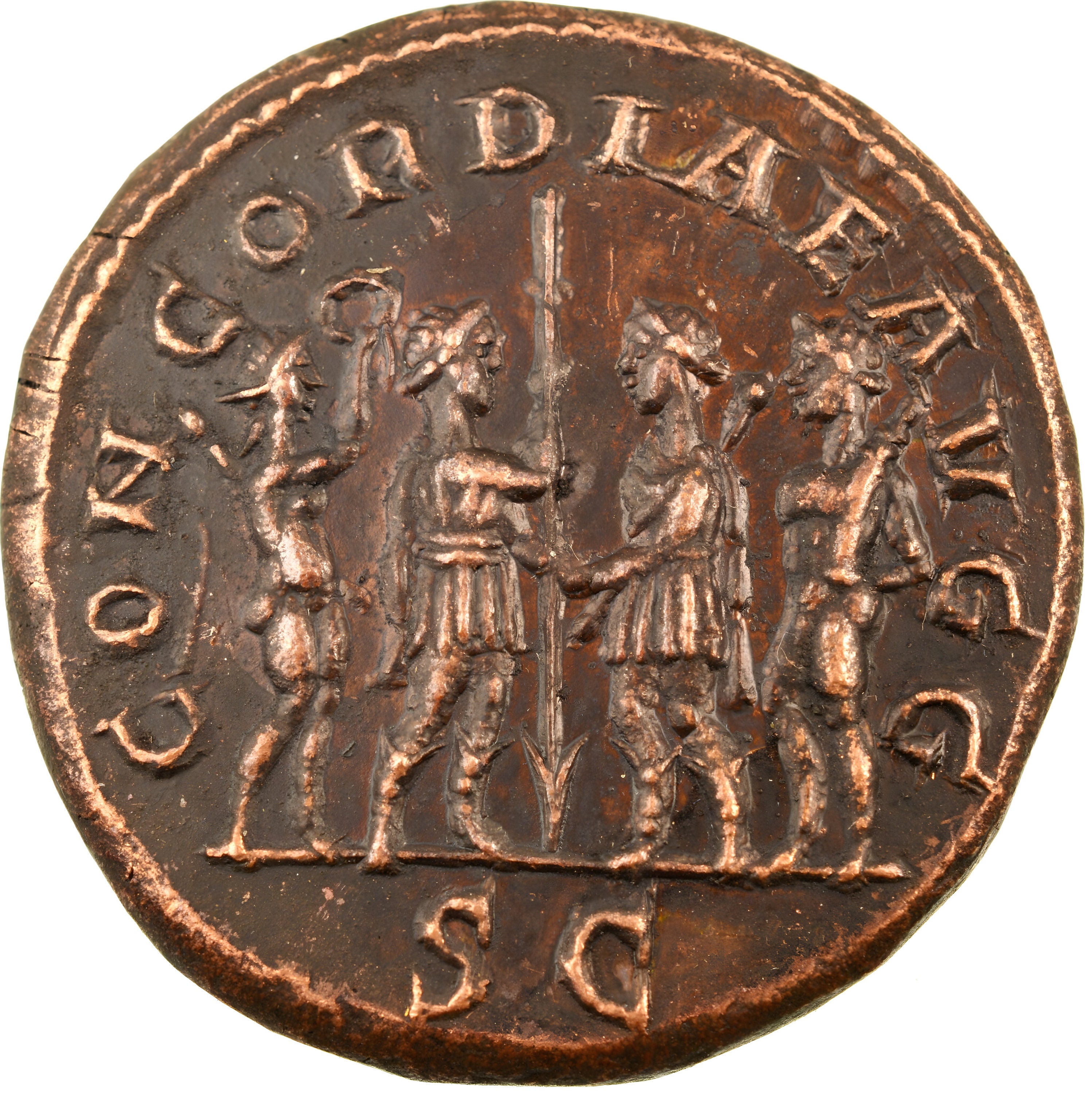 Reverse side: Caracalla and Geta, standing right and left facing each other, holding spears in left hands and clasping right hands, one crowned by Apollo, the other by Victory, CONCORDIAE AVGG S C
