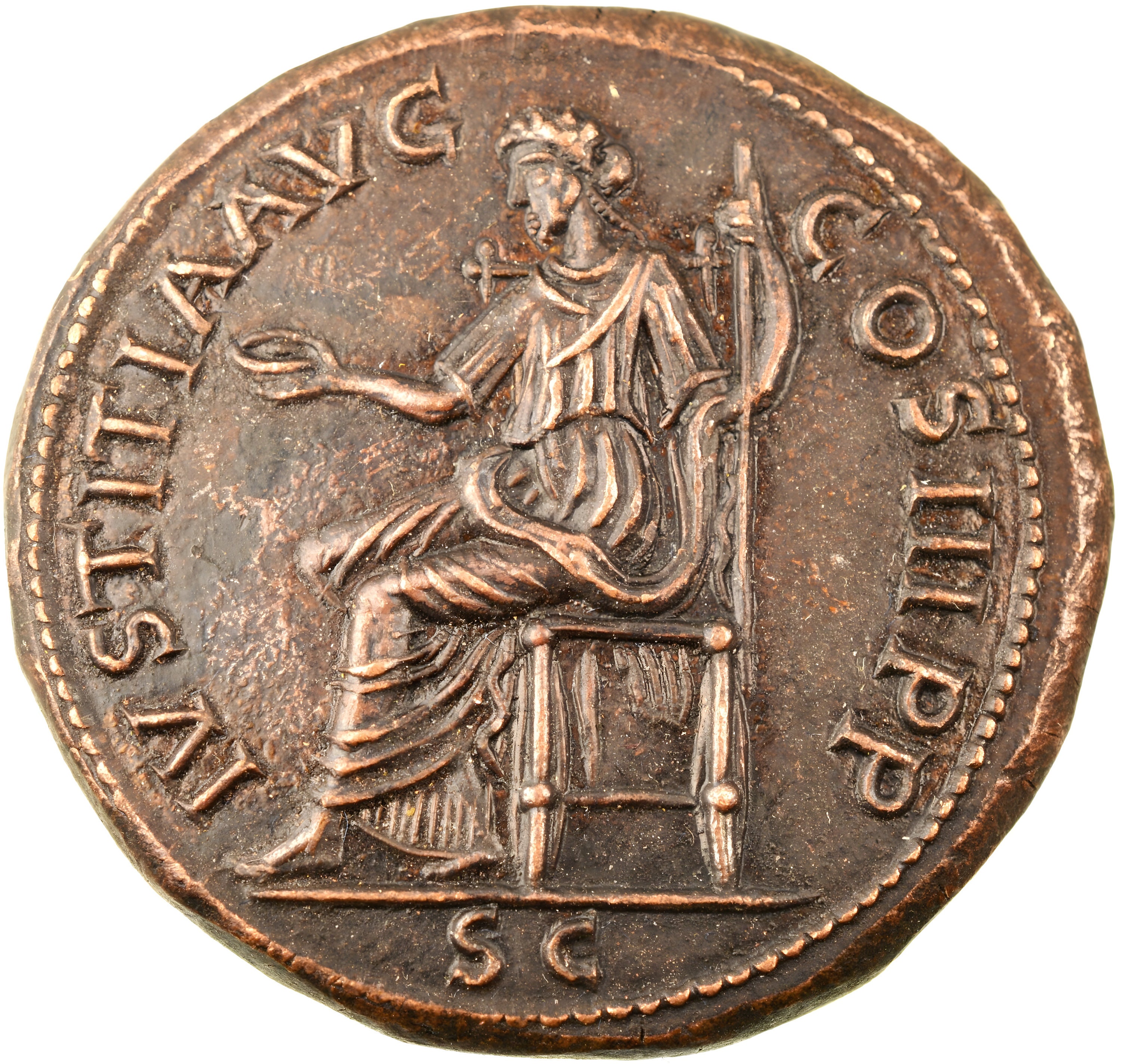 Roman Æ Sestertius of Hadrian and Justitia (Hadrianvs Avgvstvs - Ivstitia AVG) Bronze Coin