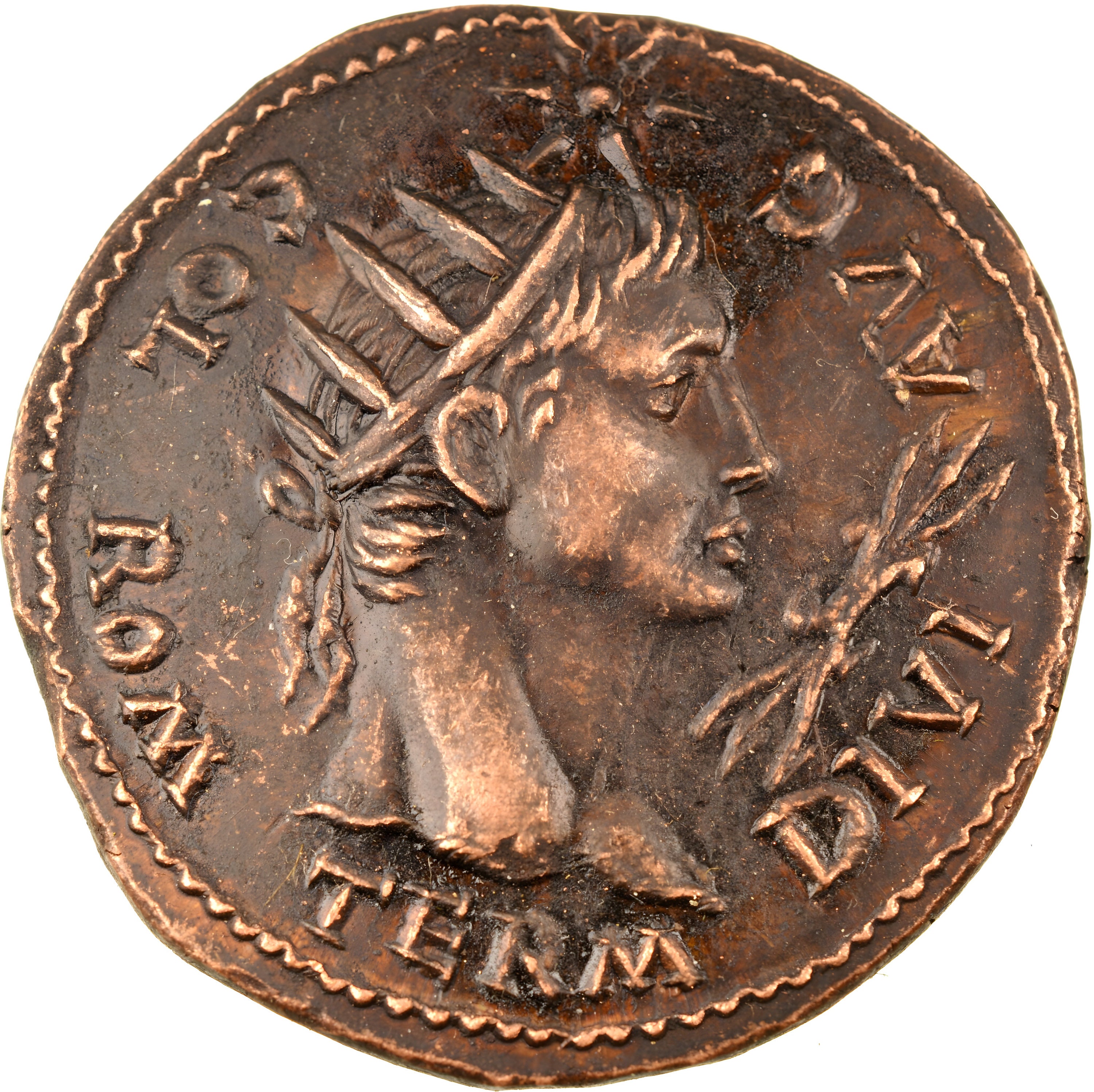 Obverse side: Radiate head of Divus Augustus right; six-rayed star above, thunderbolt to right, PERM DIVI AVG COL ROM