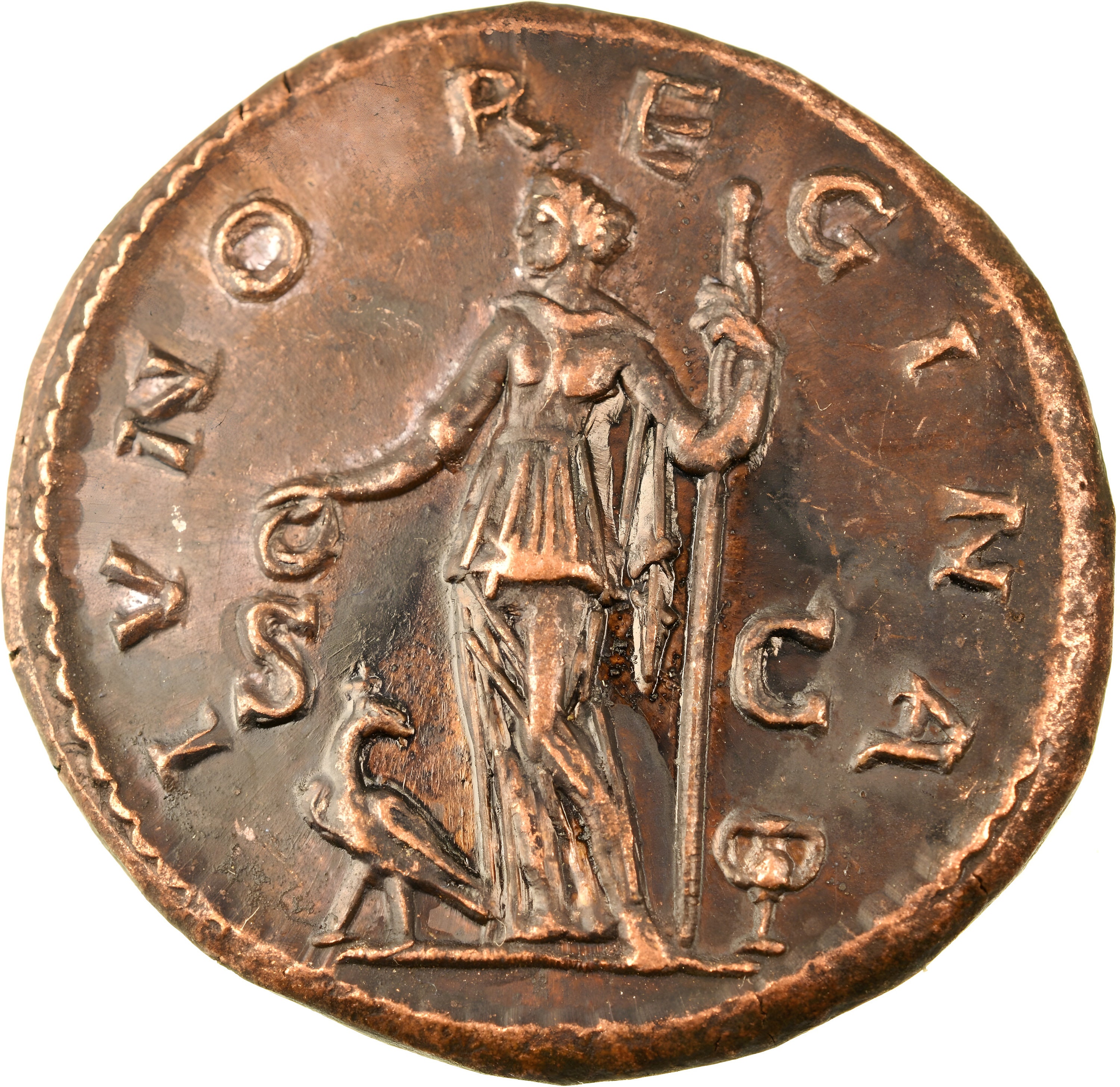 Rev.: IVNO REGINA SC, Juno standing left, holding patera, peahen below