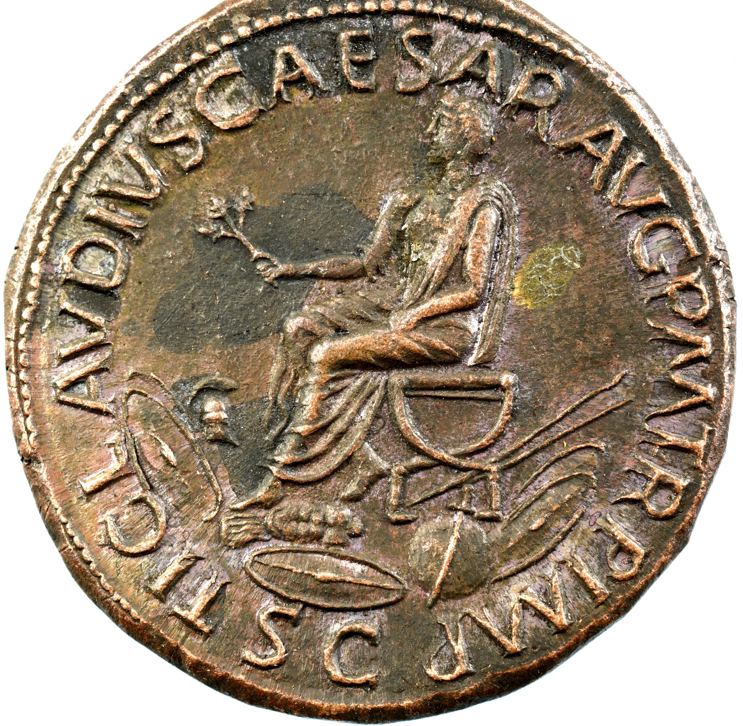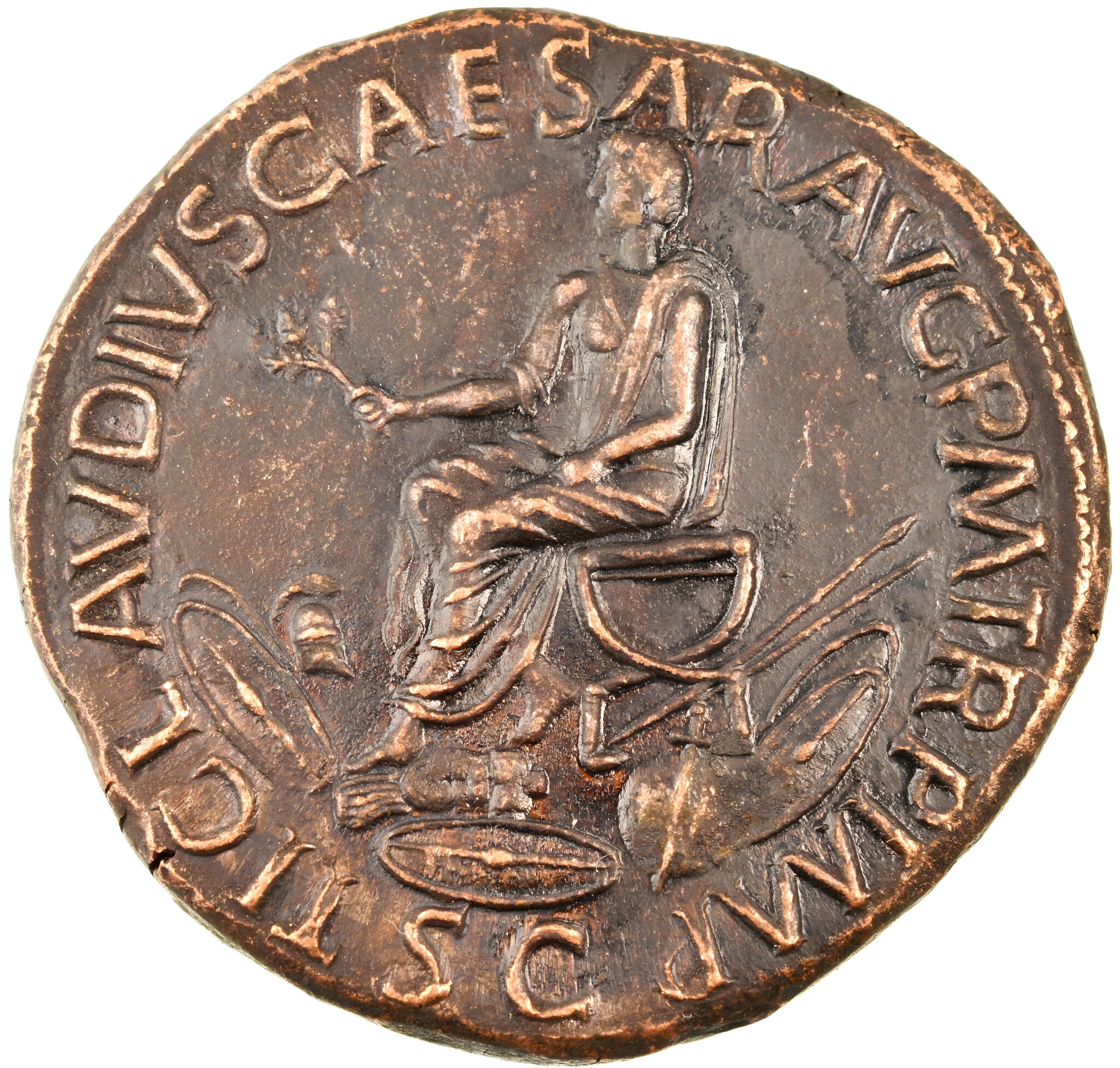 Claudius, bare-headed and togate, seated left on curule chair, holding branch in his right hand and resting his left on his lap around the chair, spears, shields, cuirass, and a helmet