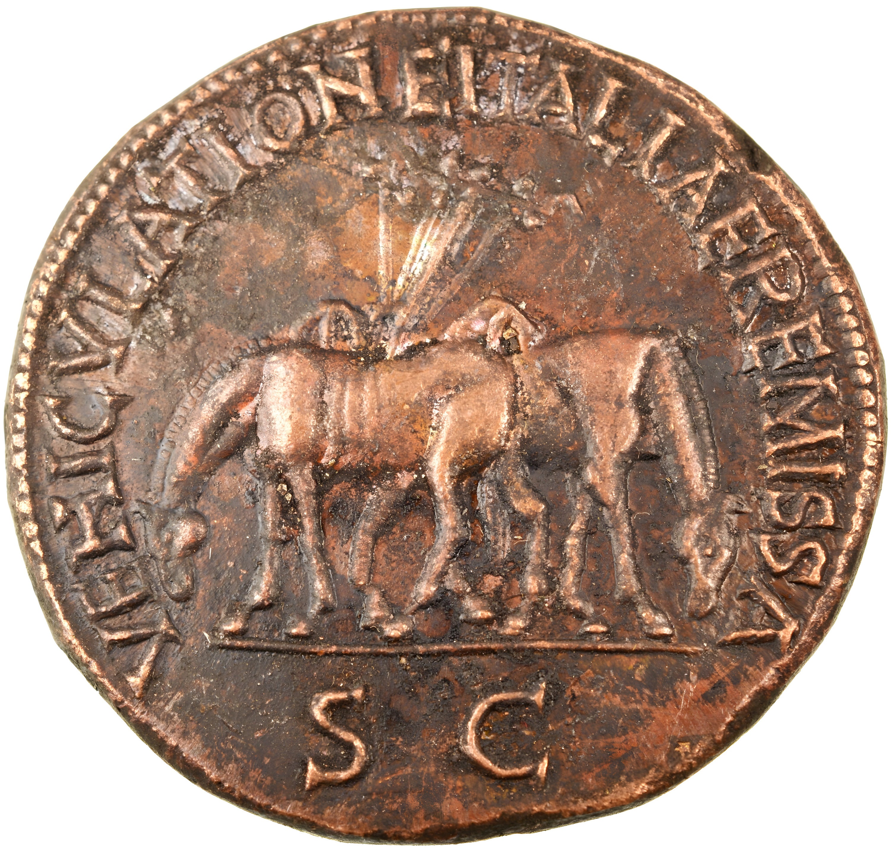 On this spectacular sestertius we see the mules and their accoutrements in rare detail. Most interesting, perhaps, is the high-wheeled cart behind the mules with its pole-and-harnesses trapping resting upright. The scene is placid, with the horses grazing and the vehicle out of commission. The decision to depict a rather idyllic scene, as opposed to showing a mule-cart on the move, is a perfect reflection of the inscription, which itself refers to the remission of the burden. (NAC 46, 551 note).