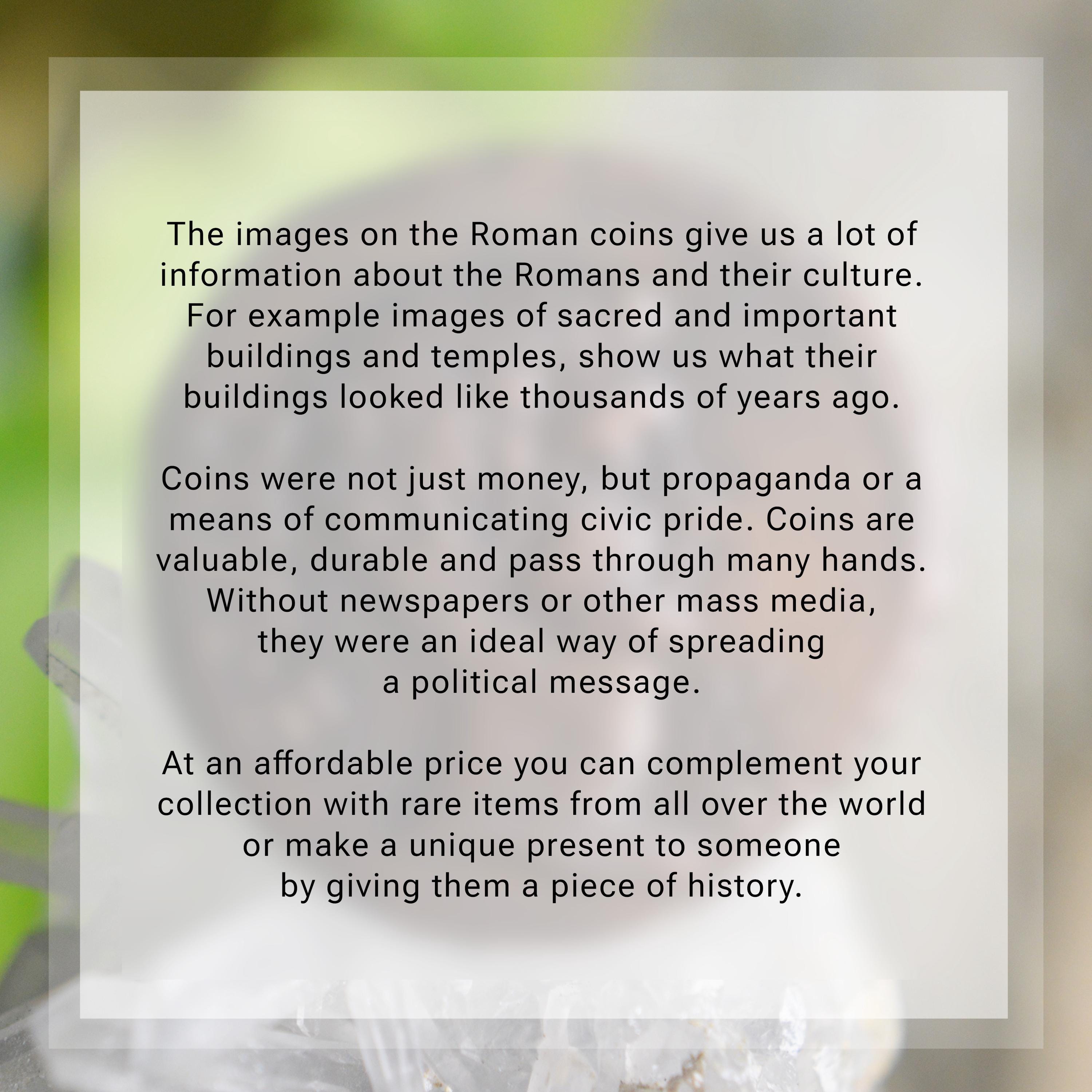 The images on the Roman Coins give us a lot of information about the Romans and their culture. For example images of sacred and important buildings and temples, show us what their buildings looked like thousands of years ago. Coins were not just money, but propaganda or a means of communicating civic pride. Coins are valuable, durable and pass through many hands. Without newspapers or other mass media, they were an ideal way of spreading a political message.