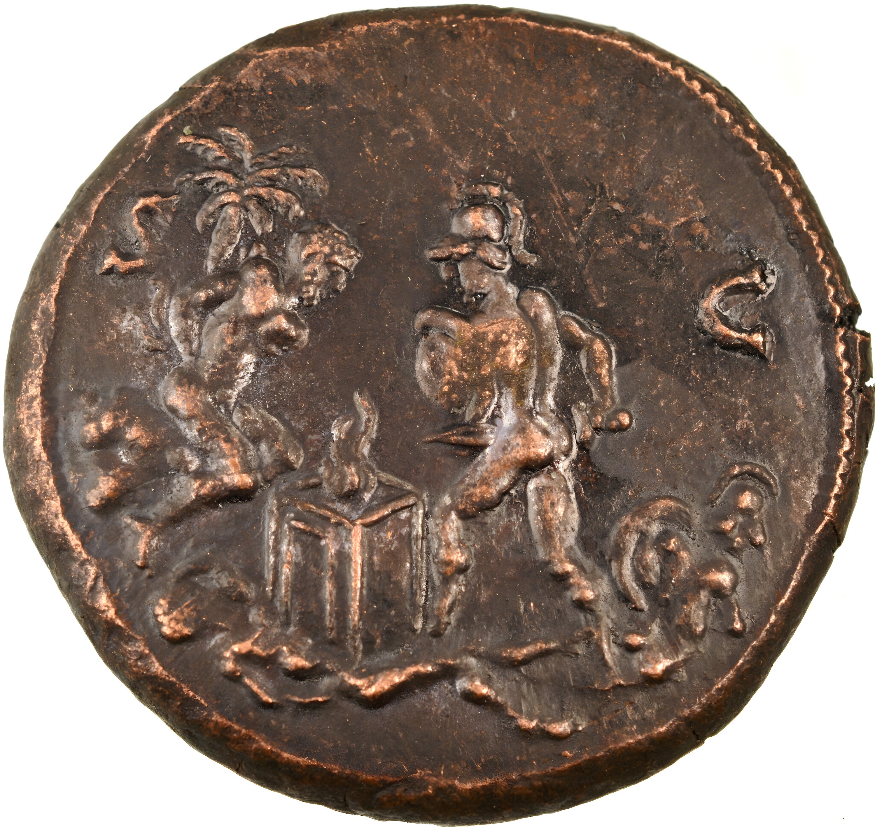 Reverse side: Nude helmeted Mars (?) right with shield and sword advancing towards altar and captive nude figure bound to palm tree left; supine nude male figure below, S-C at sides