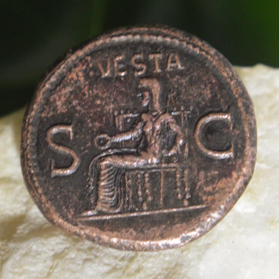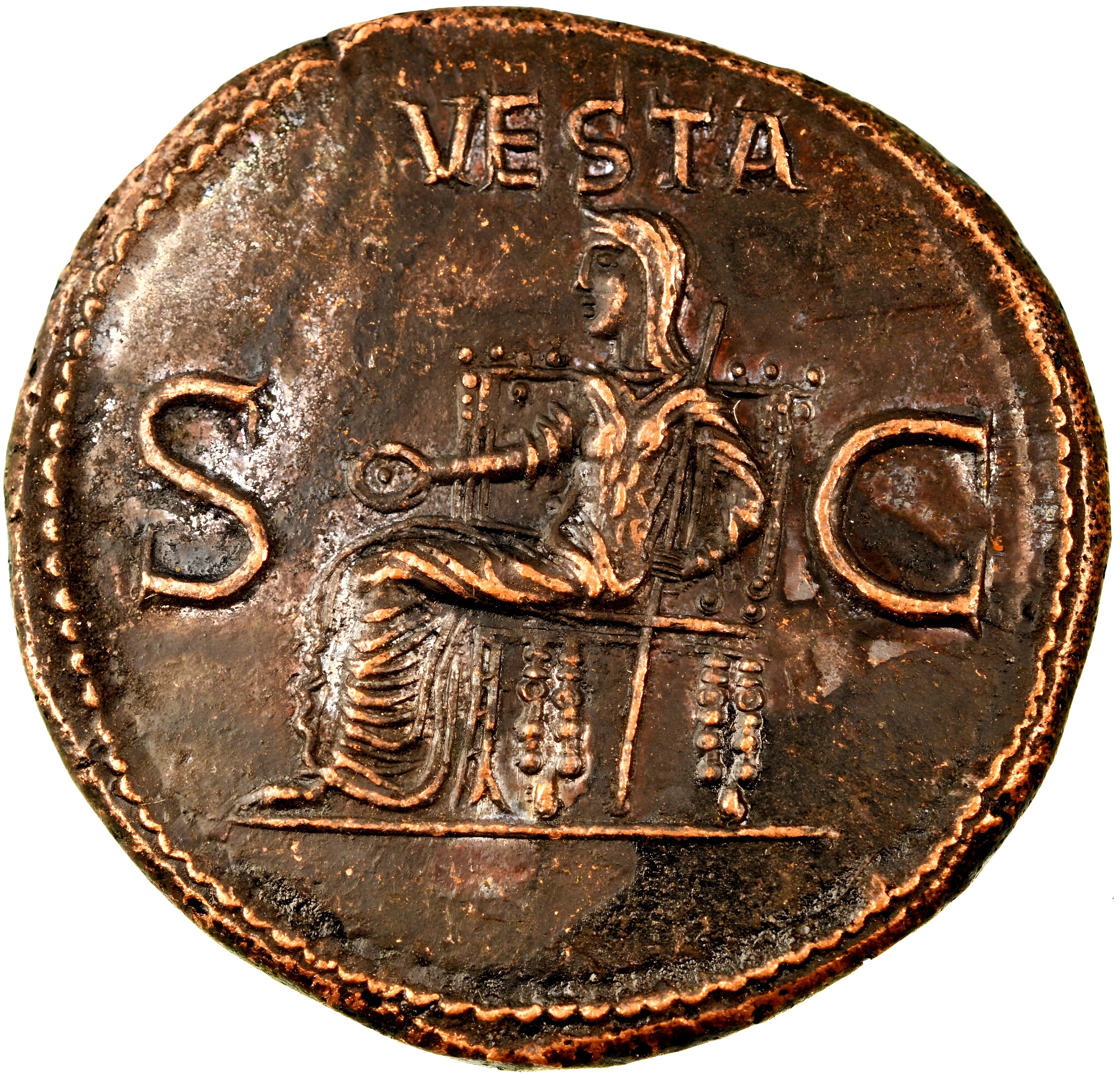 Reverse: Vesta, veiled and draped, seated left on throne with ornamented back and legs, holding patera in right hand and long transverse sceptre in left. The Inscription reads: VESTA S C for Vesta, Senatus Consultum (Vesta, by the decree of the senate).