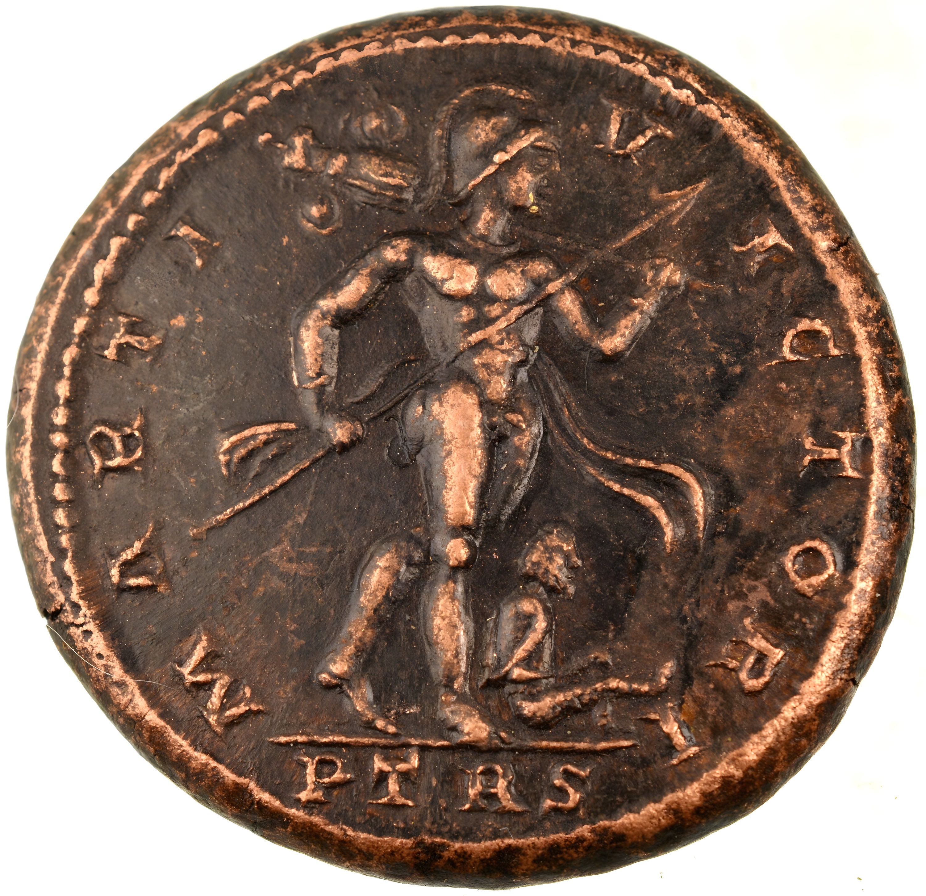 Obv.: VIRTVS AVGG ET CAESS N N, Mars advancing right, holding spear and trophy; P T in exergue.