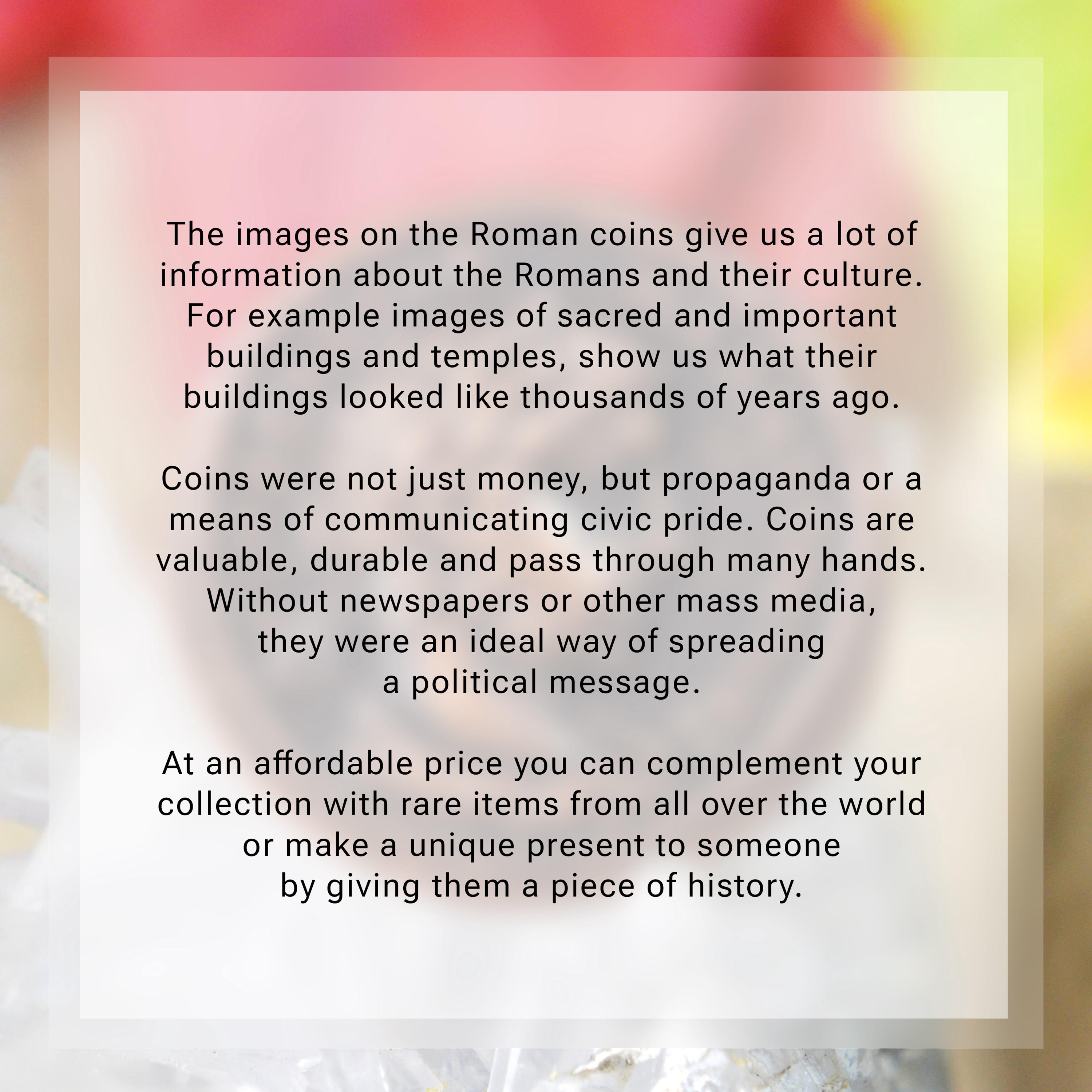 The images on the Roman Coins give us a lot of information about the Romans and their culture. For example images of sacred and important buildings and temples, show us what their buildings looked like thousands of years ago. Coins were not just money, but propaganda or a means of communicating civic pride. Coins are valuable, durable and pass through many hands. Without newspapers or other mass media, they were an ideal way of spreading a political message.