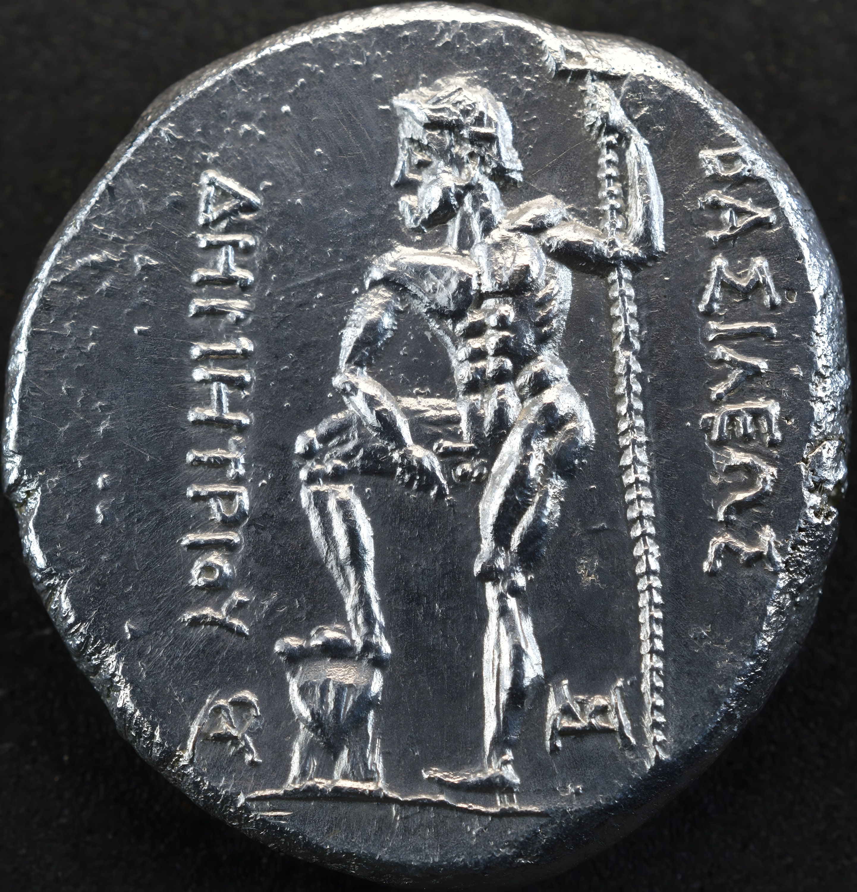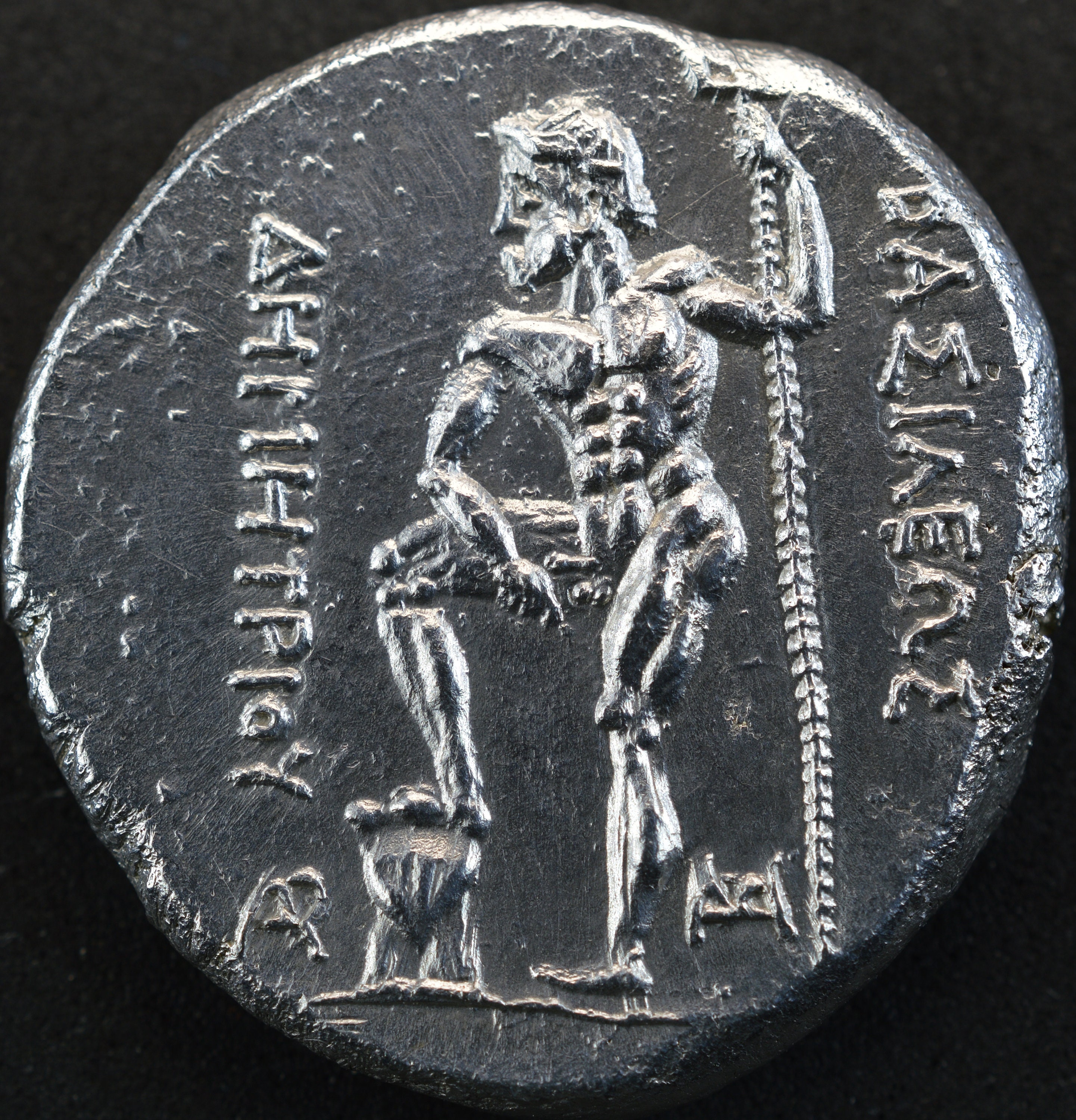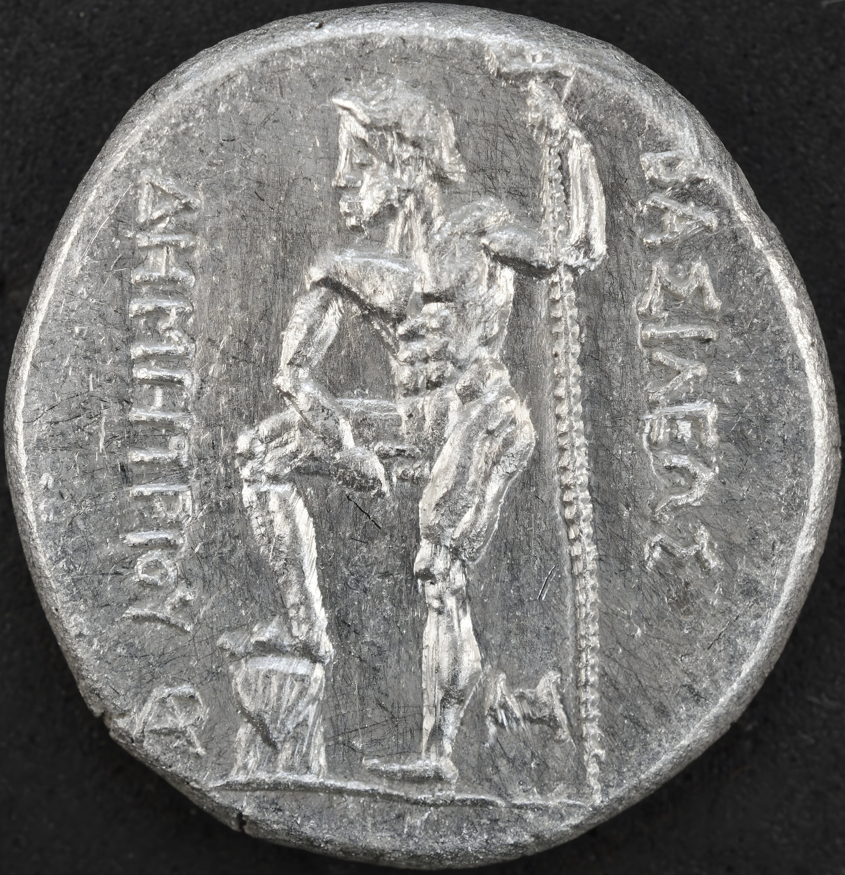 Demetrios was the son of Antigonos Monophthalmos (the One-eyed), who assumed control of Asia after the death of Alexander the Great. Demetrios earned his nickname Poliorketes (Besieger) from his extensive use of siege machines in an unsuccessful attempt to take the island of Rhodes in 305 BC After their forces were defeated and Antigonos was killed at the Battle of Ipsos in 301 BC, Demetrios fled with a large fleet and attempted to establish a base for his power first in Cilicia and then in Greece and Macedonia. Like other successors of Alexander, Demetrios at first issued coins with Alexander′s types, although he quickly replaced Alexander′s name with his own and added the royal title of basileus that both he and his father had assumed in 306 BC Soon he established a number of his own types, culminating in the types for these tetradrachms, which were issued in large numbers from c. 290 BC in preparation for Demetrios′ invasion of Asia Minor. The invasion ended disastrously and Demetrios was imprisoned by Seleukos he died in captivity in 283 BC