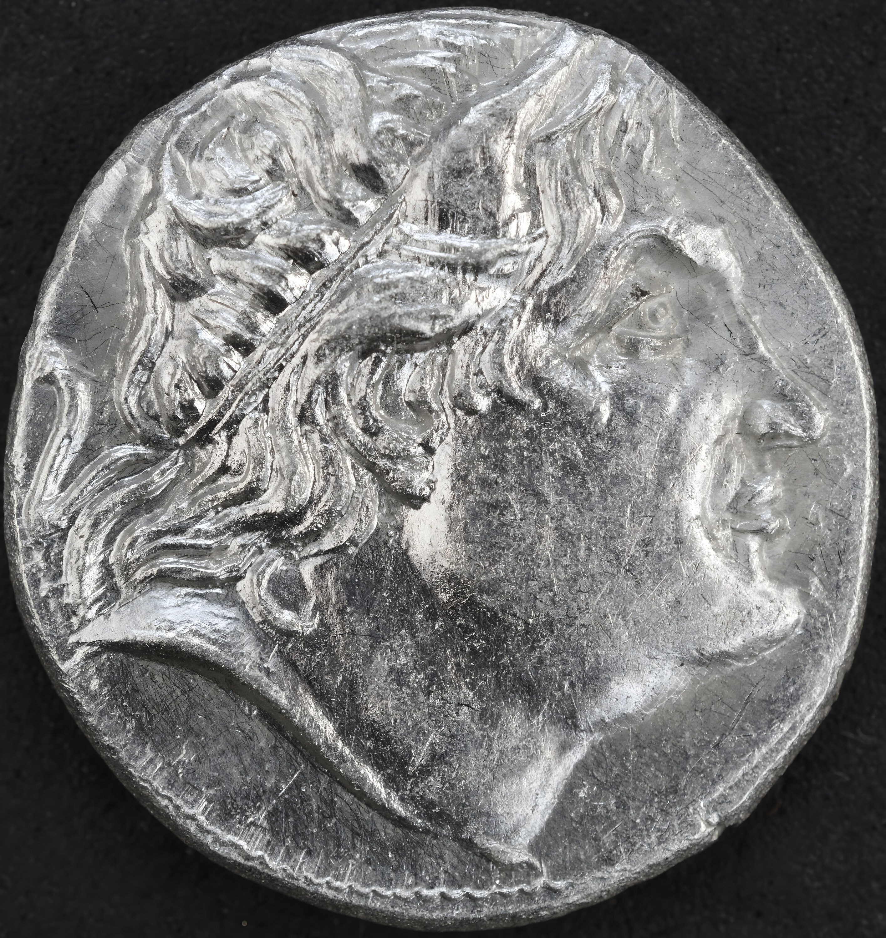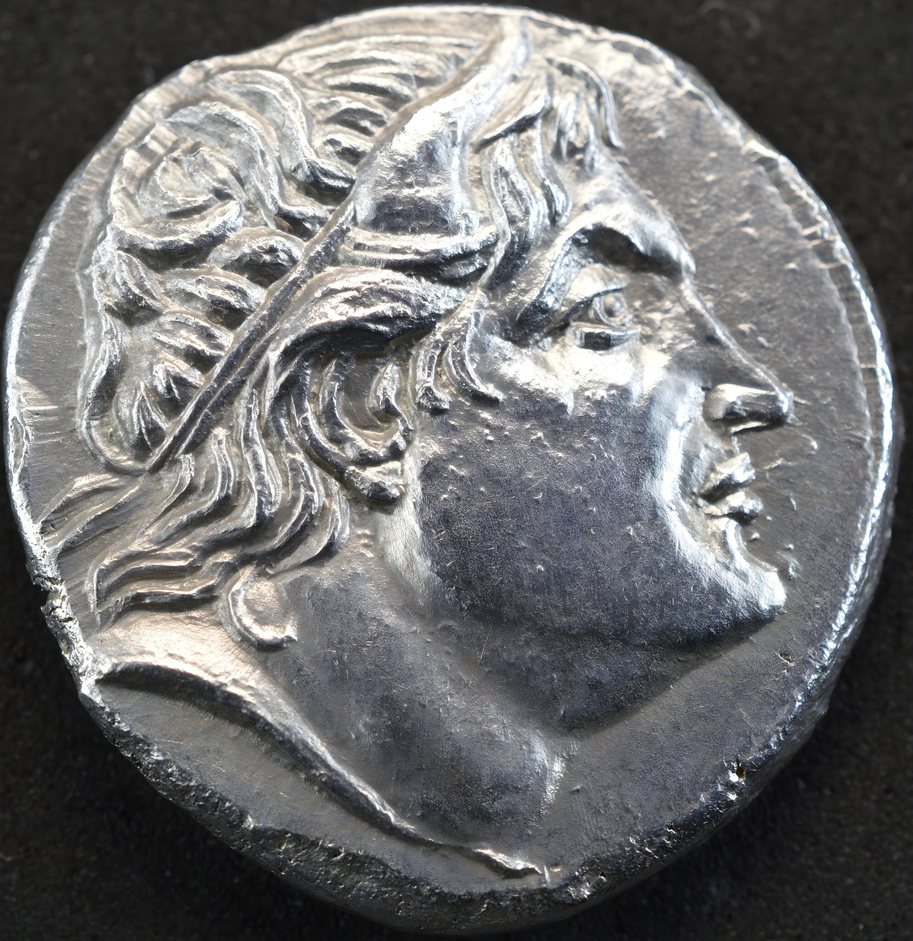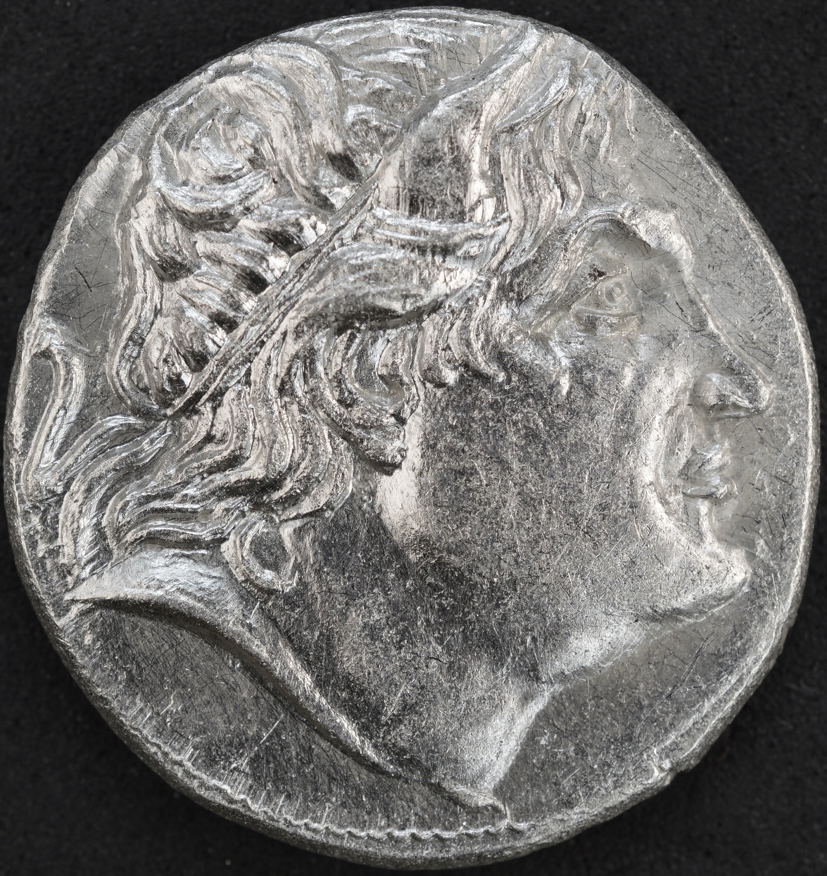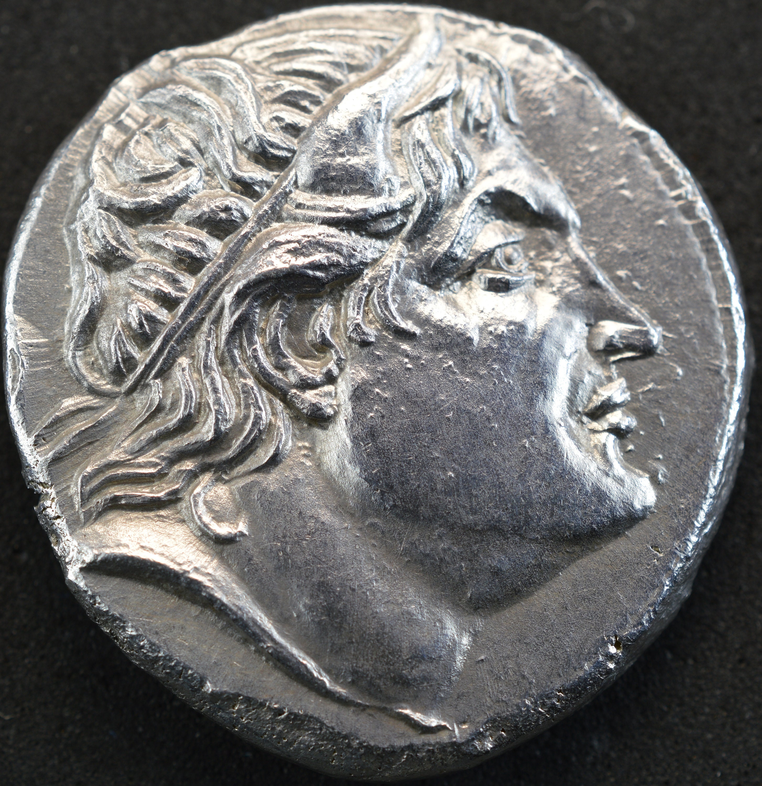 Demetrios was the son of Antigonos Monophthalmos (the One-eyed), who assumed control of Asia after the death of Alexander the Great. Demetrios earned his nickname Poliorketes (Besieger) from his extensive use of siege machines in an unsuccessful attempt to take the island of Rhodes in 305 BC After their forces were defeated and Antigonos was killed at the Battle of Ipsos in 301 BC, Demetrios fled with a large fleet and attempted to establish a base for his power first in Cilicia and then in Greece and Macedonia. Like other successors of Alexander, Demetrios at first issued coins with Alexander′s types, although he quickly replaced Alexander′s name with his own and added the royal title of basileus that both he and his father had assumed in 306 BC Soon he established a number of his own types, culminating in the types for these tetradrachms, which were issued in large numbers from c. 290 BC in preparation for Demetrios′ invasion of Asia Minor. The invasion ended disastrously and Demetrios was imprisoned by Seleukos he died in captivity in 283 BC