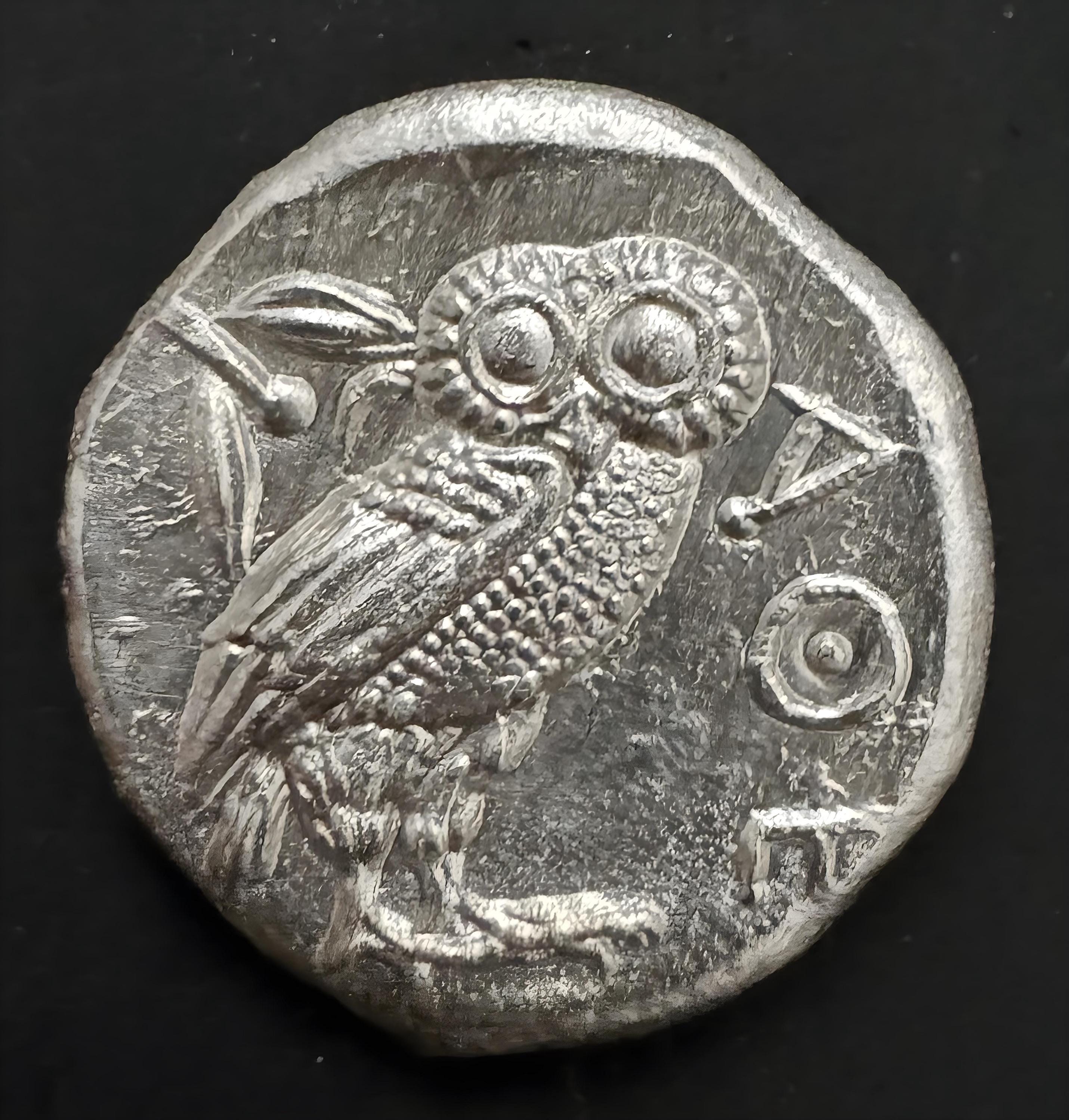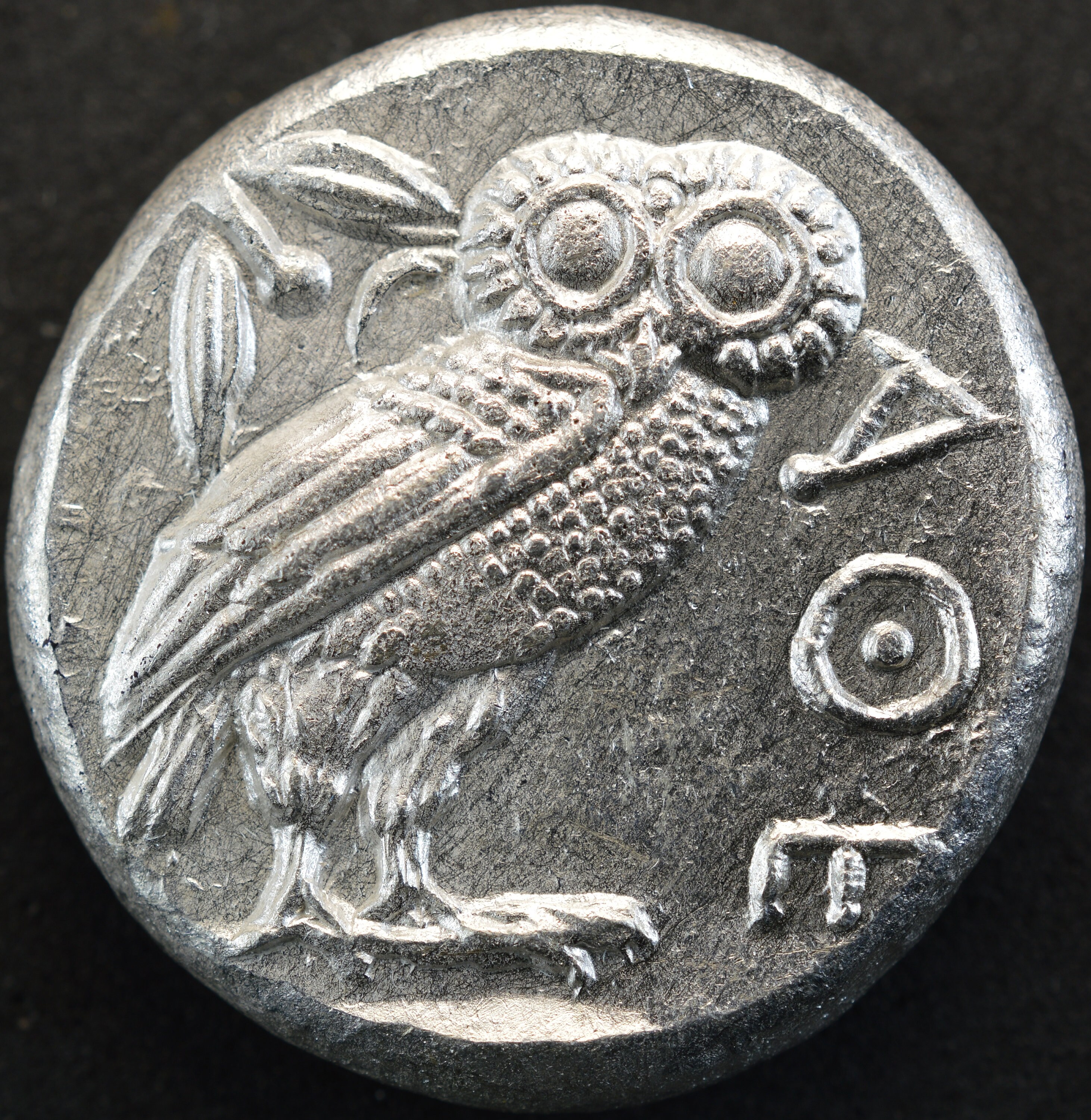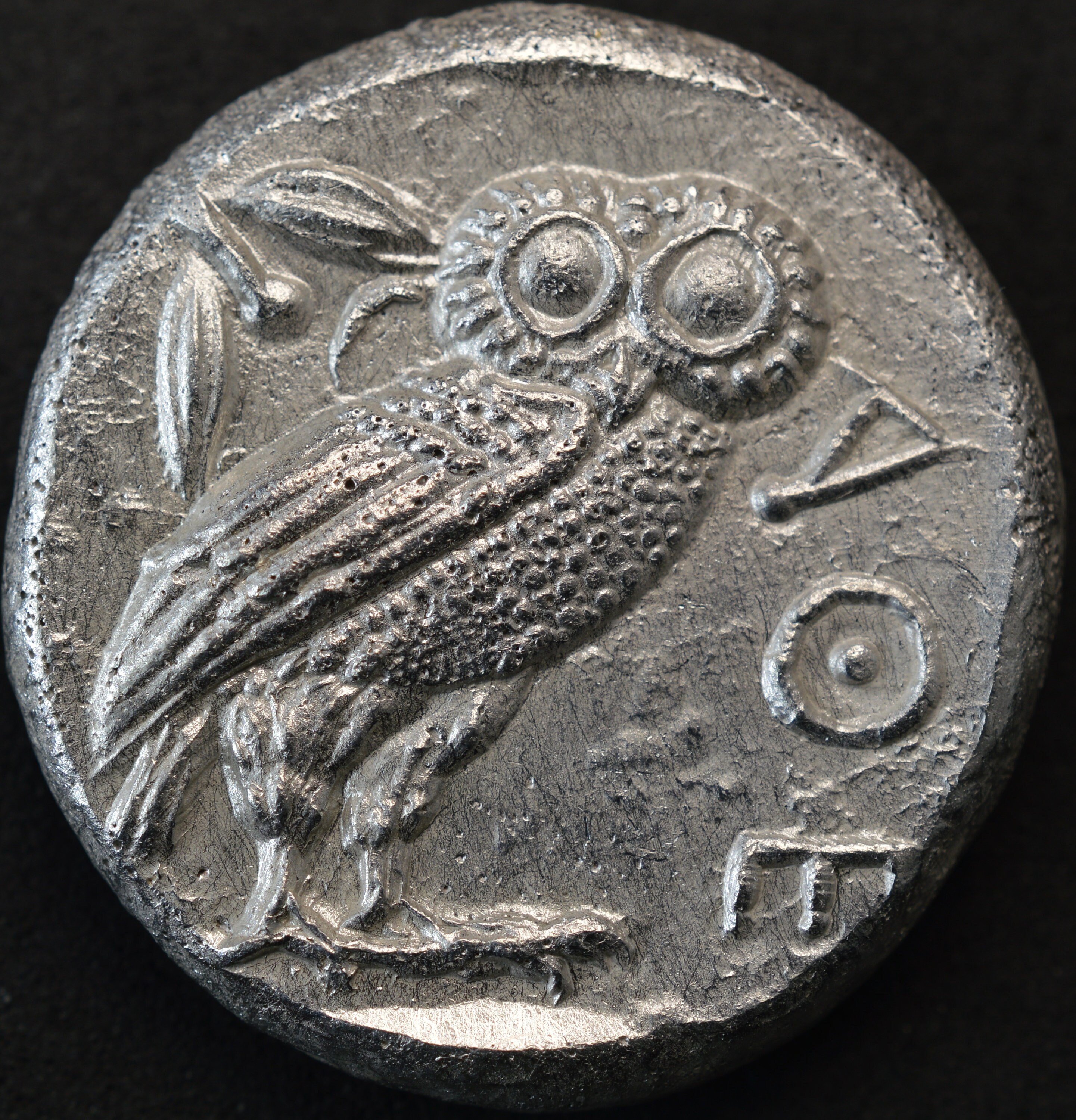 Athenian coins, bearing the helmeted head of Athena on the obverse and an owl on the reverse, became extremely popular throughout the ancient Greek world. Their success was due in part to quality of the silver used, from the Athenian mines at Laurion, and to Athens' military and political supremacy throughout much of the 5th century BC. The coins, known as « owls », were widely used in the 5th century and were copied by other regions, such as Egypt and southern Italy.