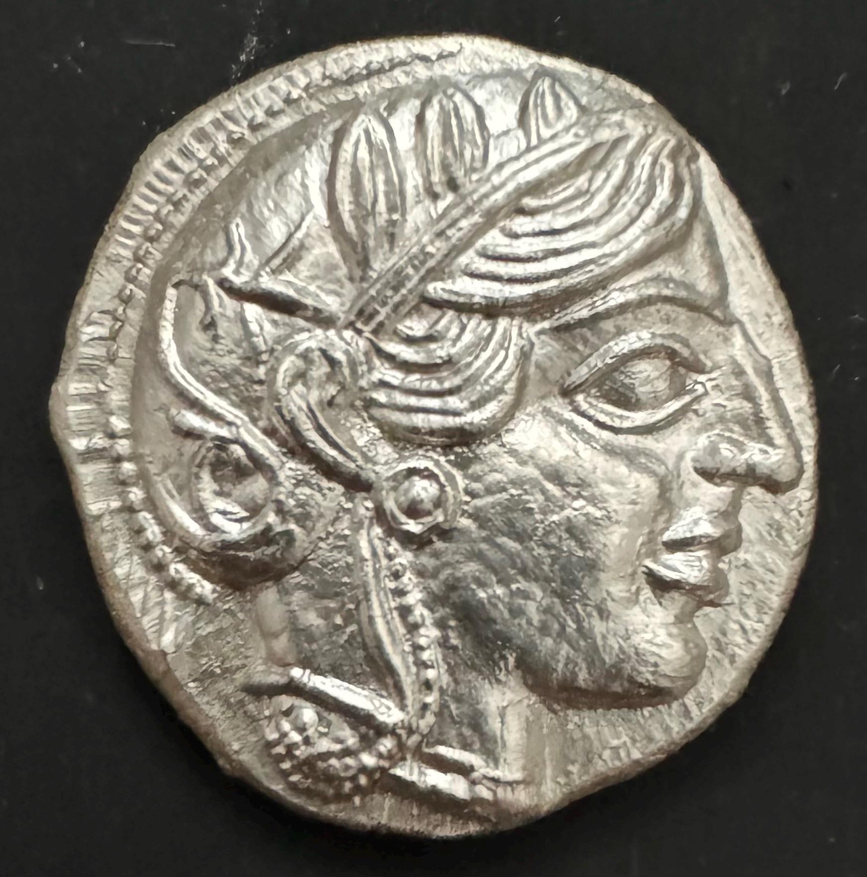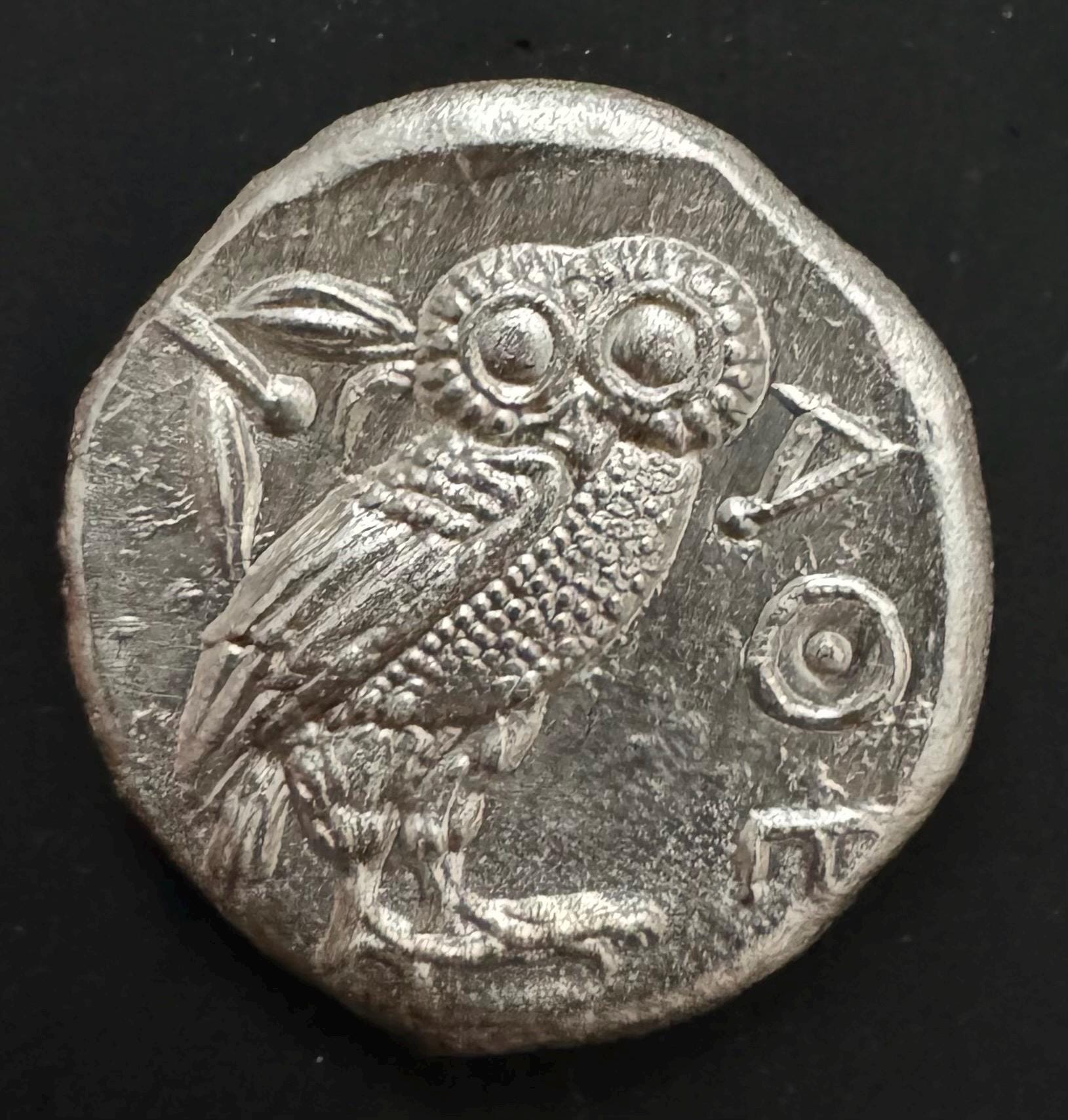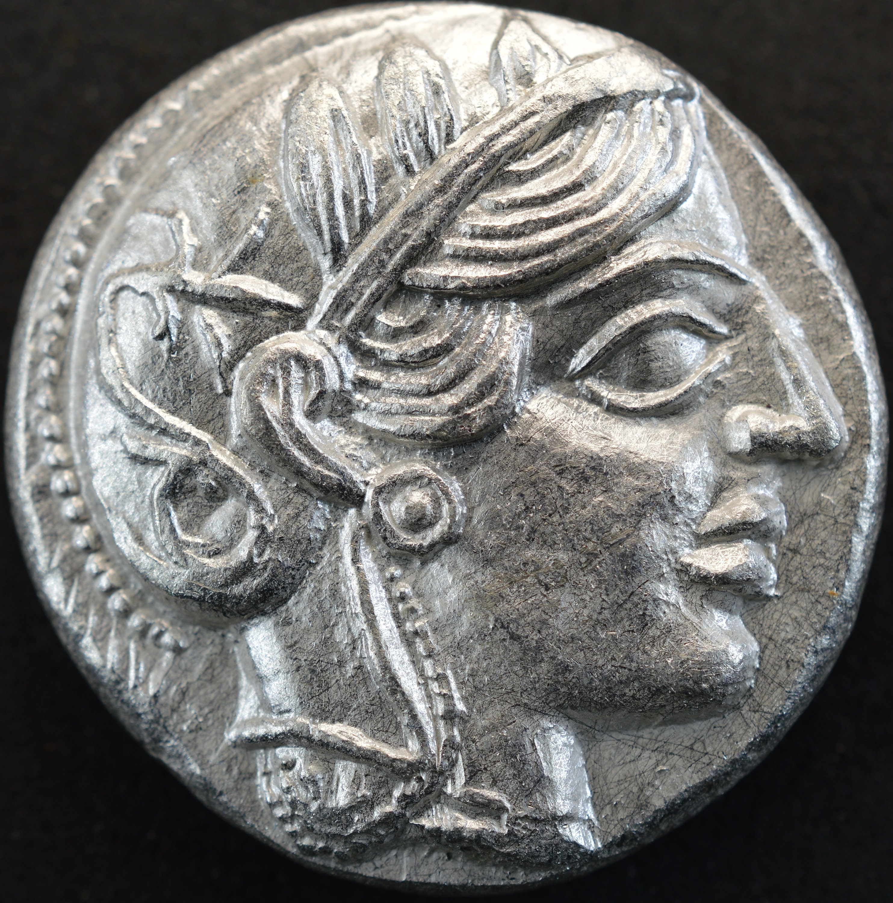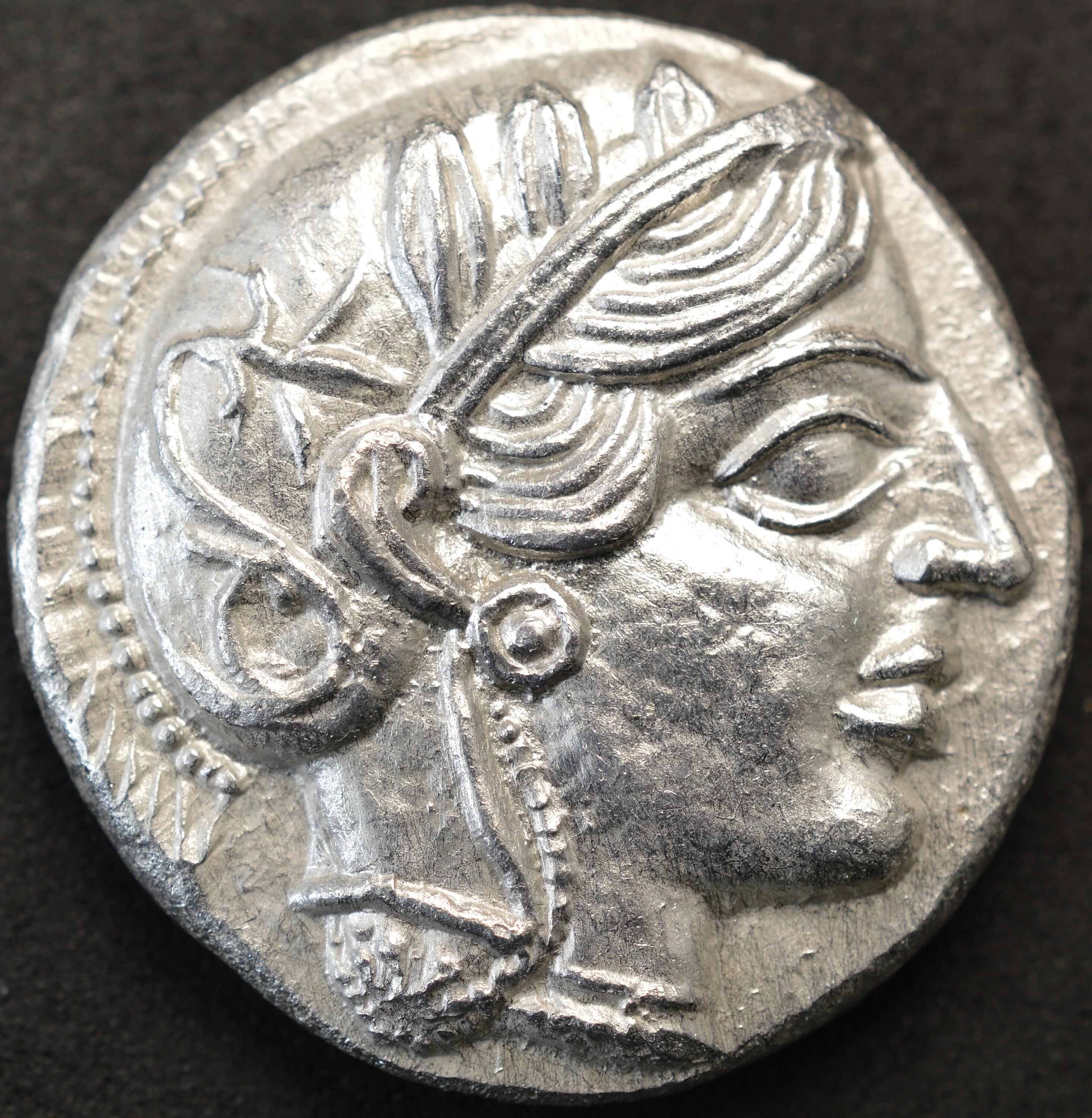 The silver tetradrachms of Athens, which pair the helmeted head of the goddess Athena with the standing figure of her owl, were produced on a very large scale from the mid- to late-5th Century B.C. So many were struck that scholars consider it fruitless to conduct a die study on the series (a problem which, one day, might be resolved with the aid of technology).