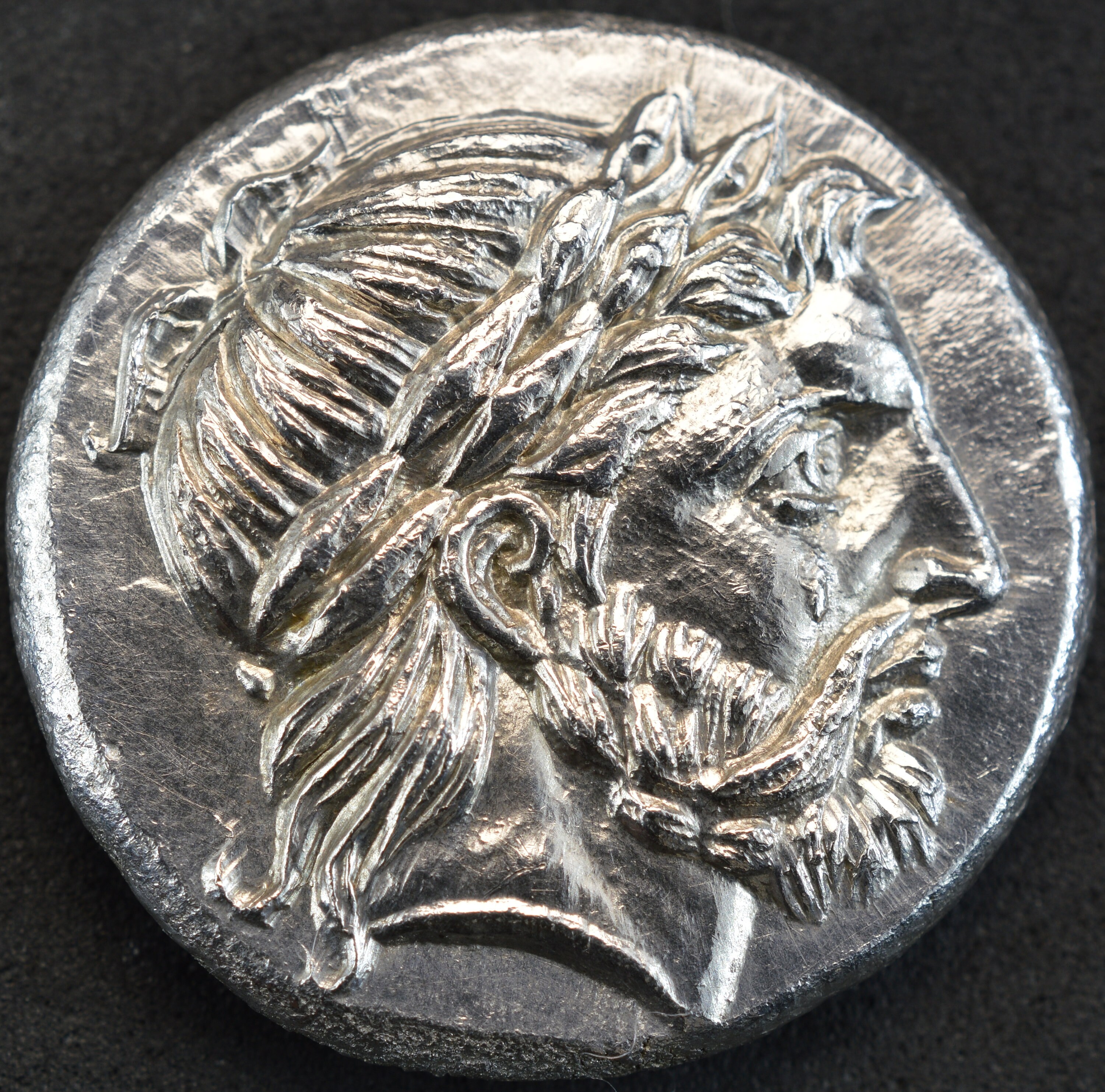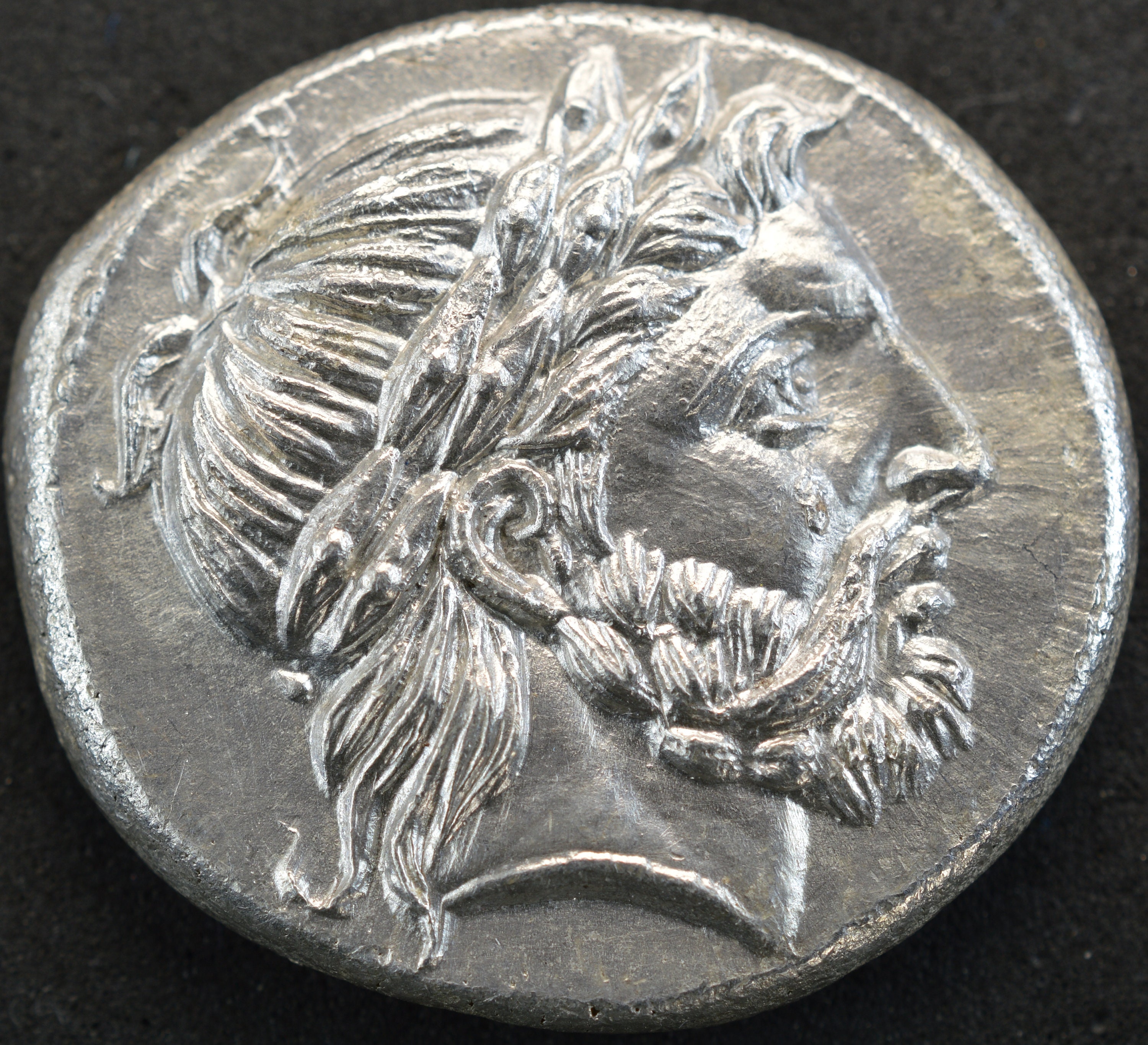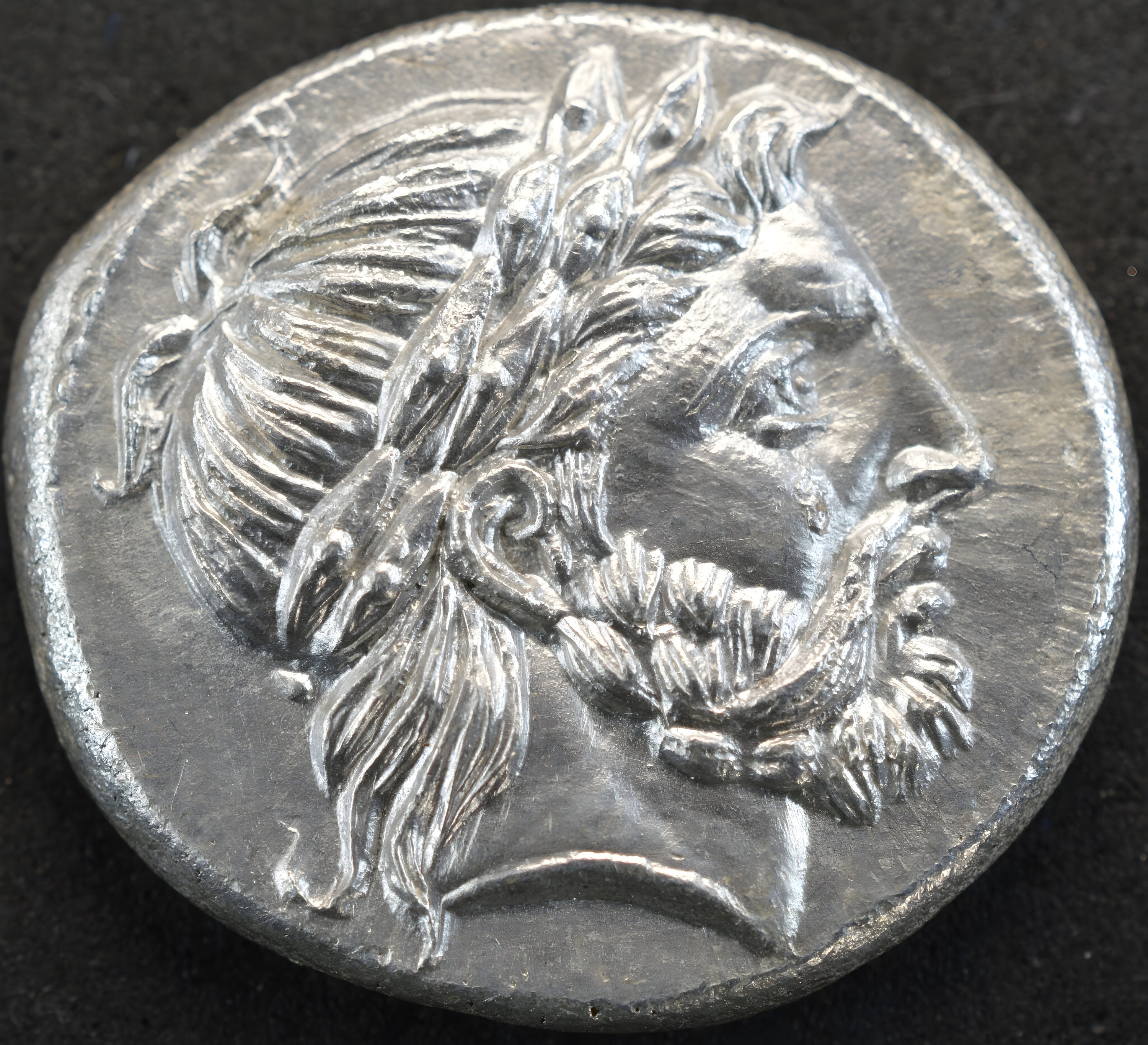 From sculptures uncovered in the excavation of Philip’s tomb in 1977, it has become evident that there are some subtle but clearly intentional similarities between Philip’s actual appearance and that of Zeus on his tetradrachms. The artist adopted some of Philip’s facial attributes in the depiction of Zeus, likely intending to further assert Philip’s divinity and claim to the broader throne of Greece.