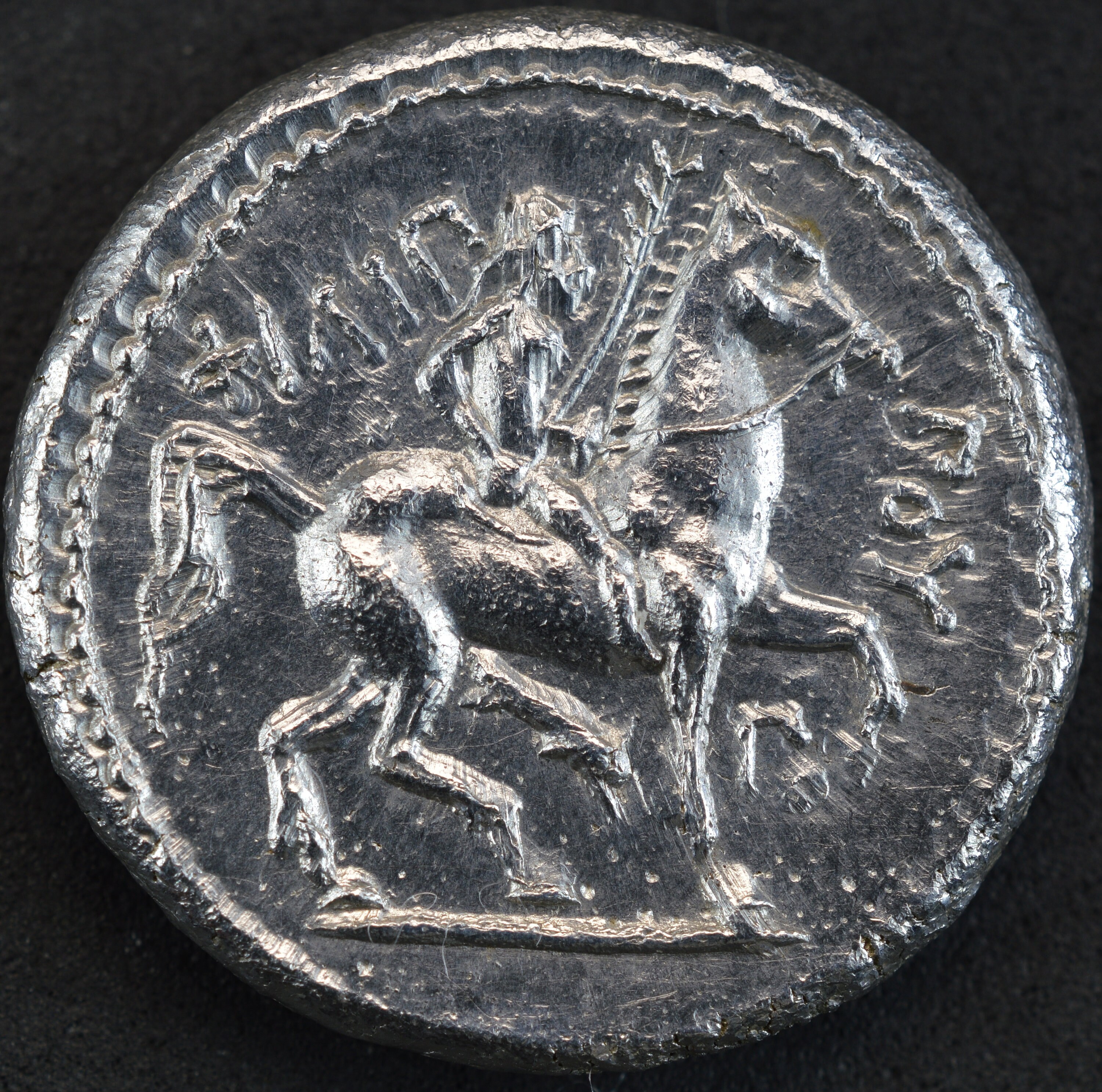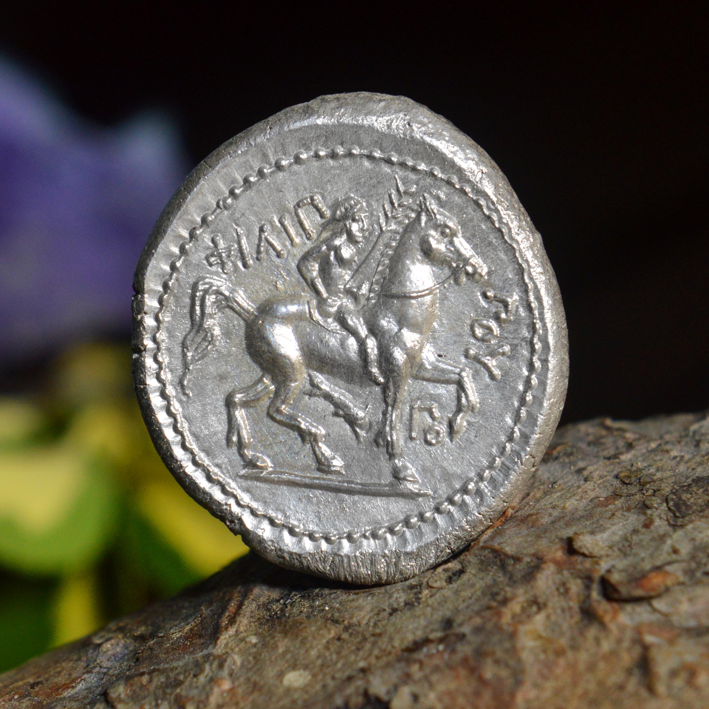 Philip’s primary issue of ancient greek coins was a series of tetradrachms bearing an obverse portrait of Zeus and on the reverse, a muscular horse ridden by a young, slim jockey shown running his victory lap and holding a palm branch, a symbol given to the victor.
