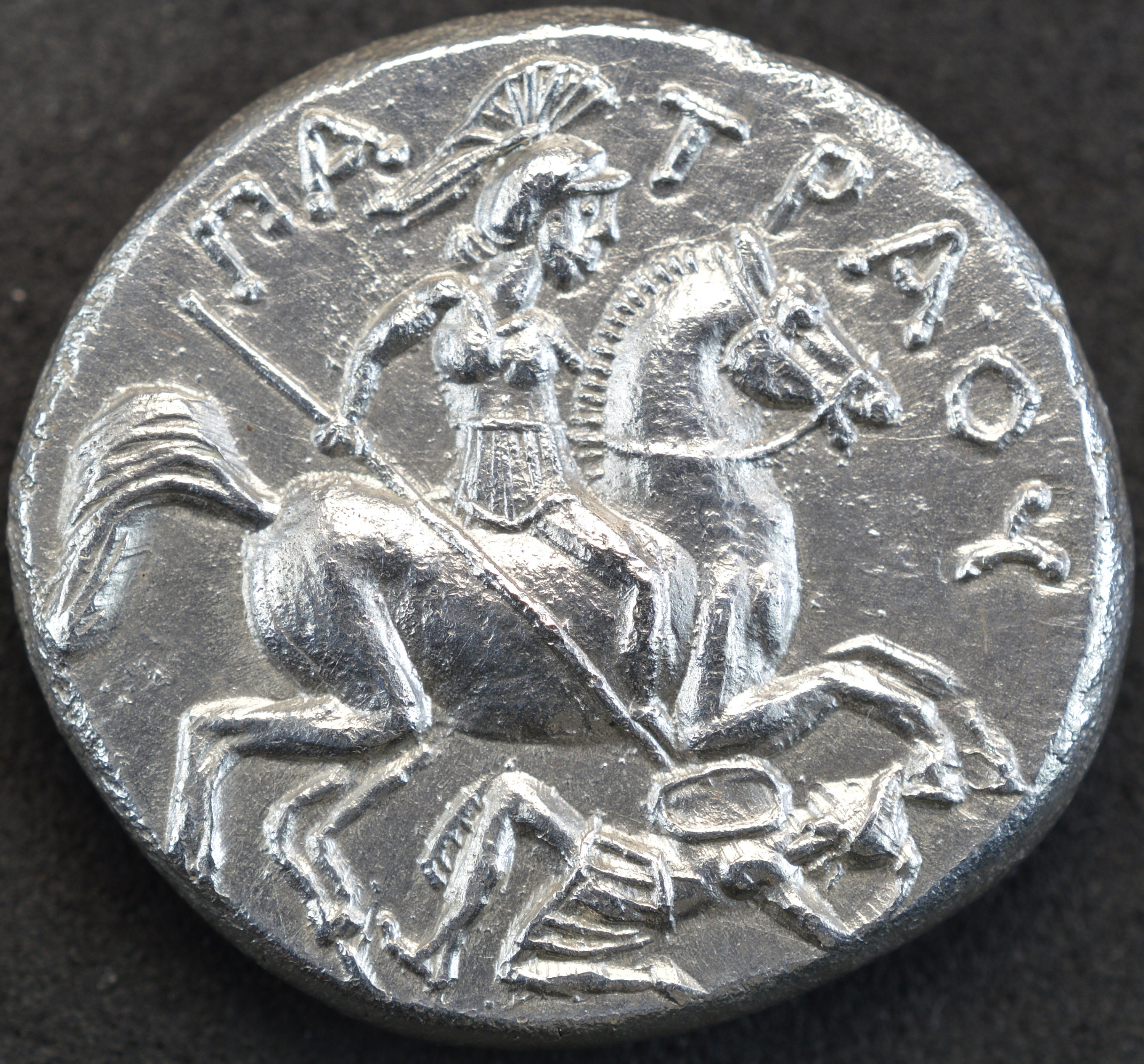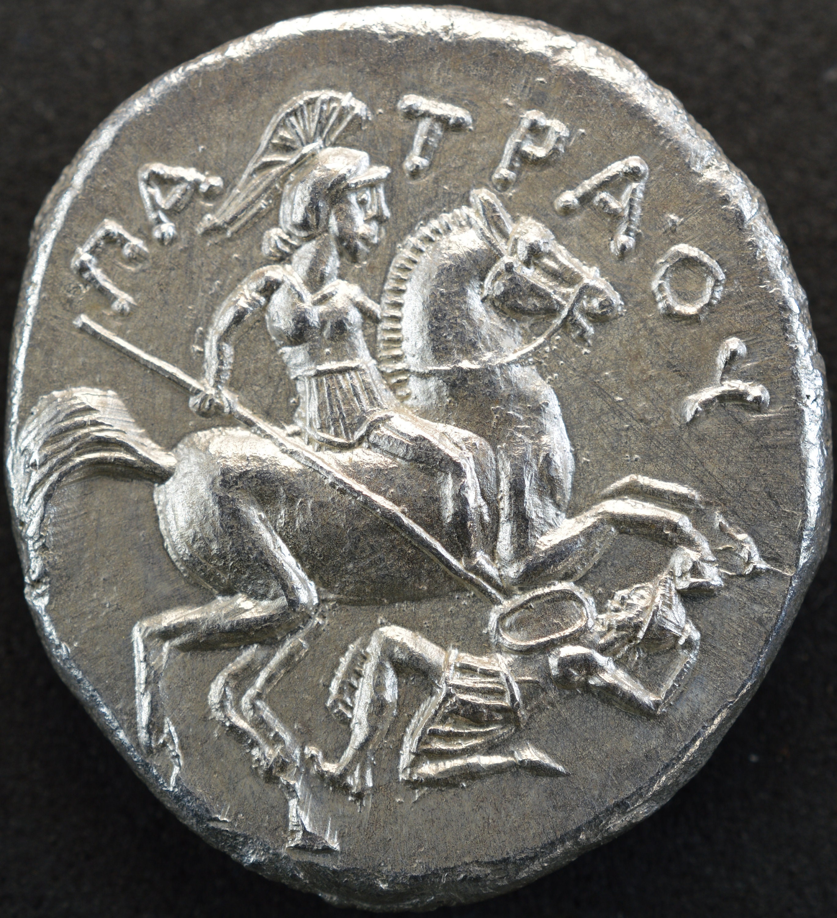 Reverse side: Paeonian horseman, wearing crested helmet and full armor, rearing right, spearing enemy who defends with shield and spear