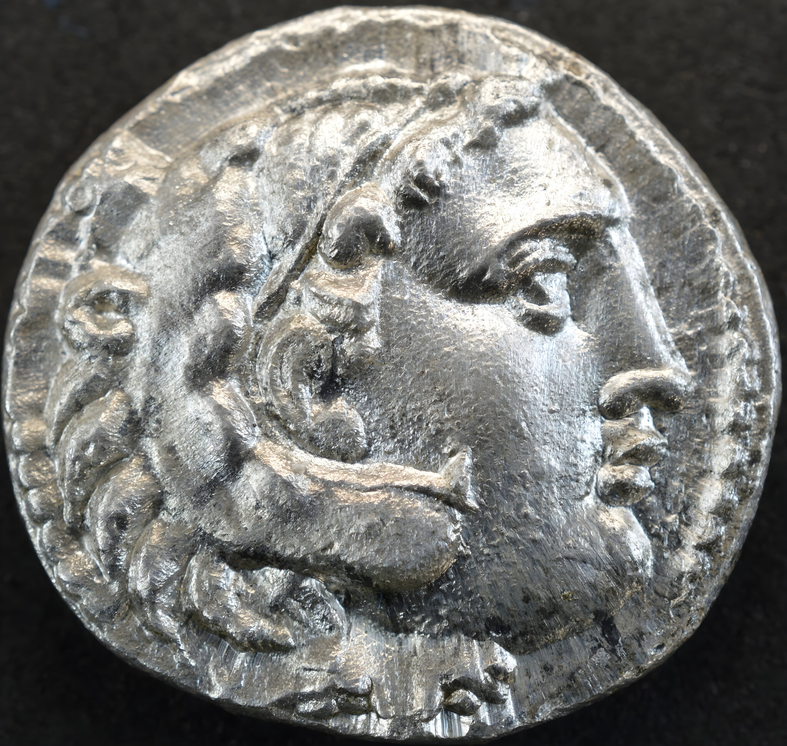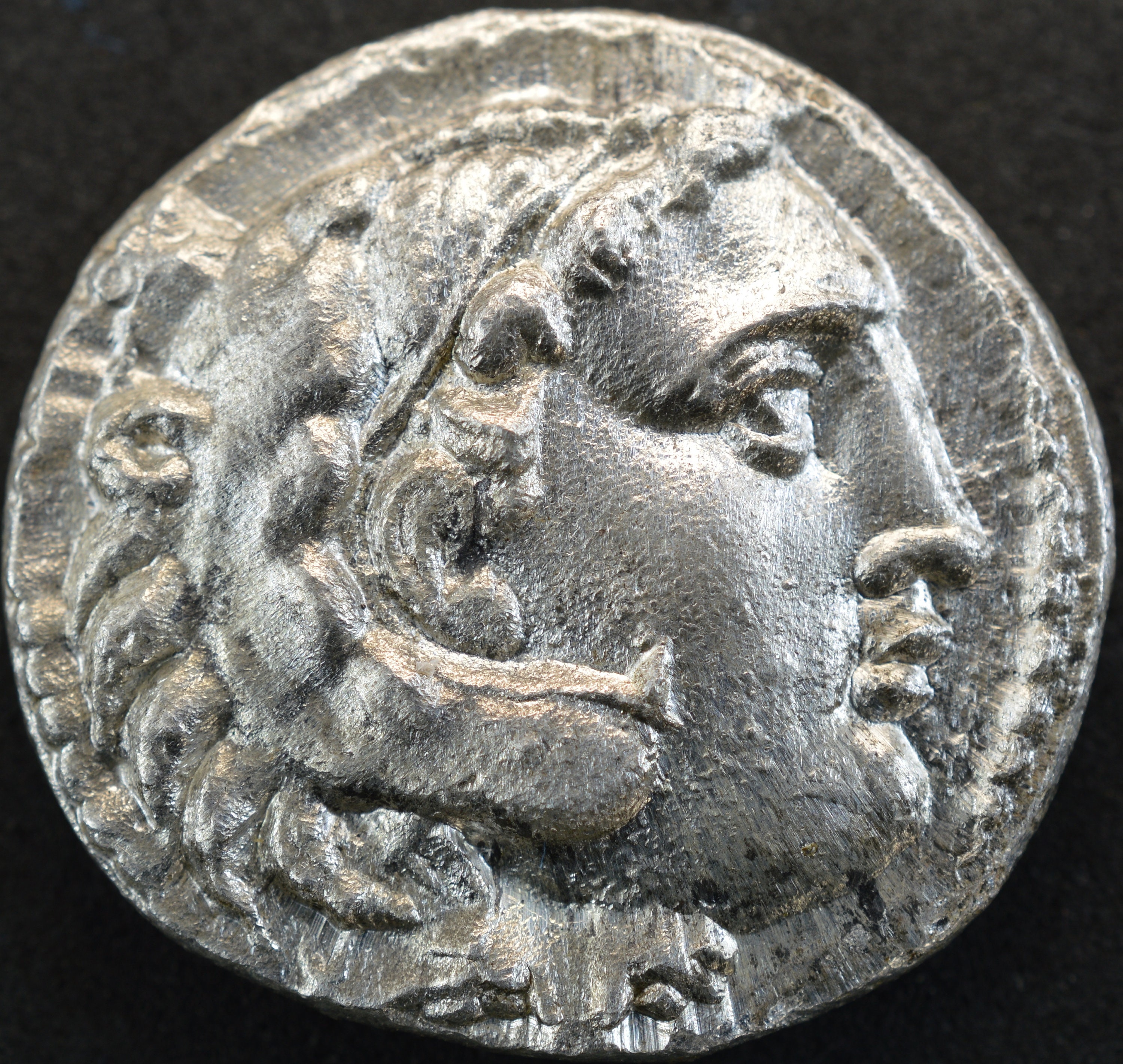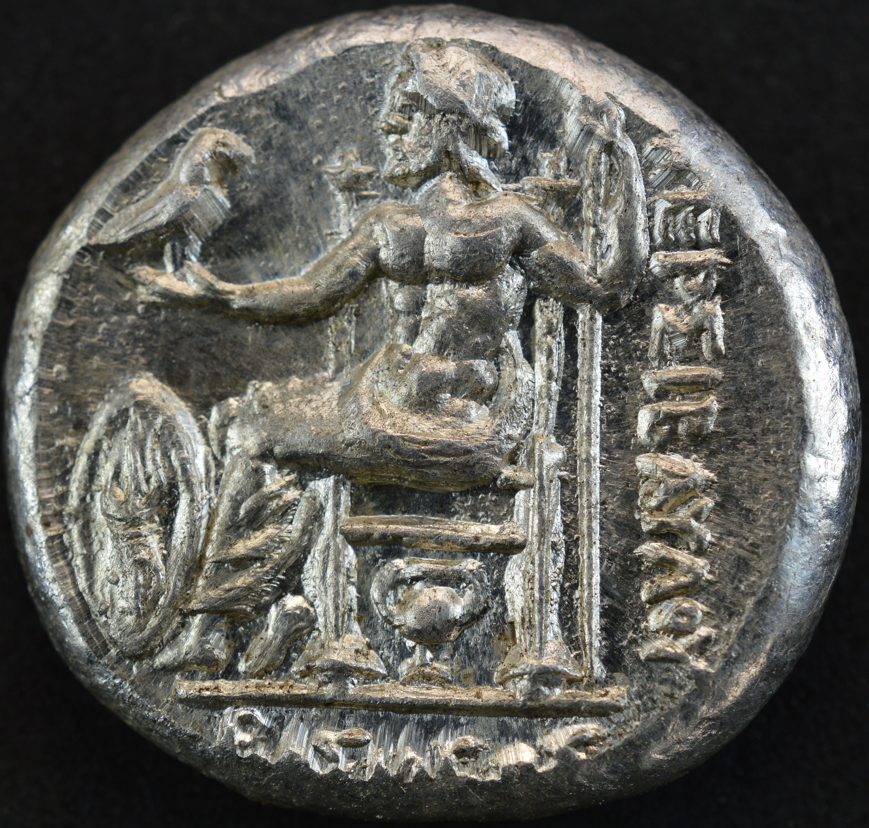 The obverse depicts Herakles (or Hercules to the Romans), the greatest hero of the Greeks. Herakles was Zeus’ son and was able to attain divine status as a demi-god by accomplishing the 12 Labors assigned to him. This coin represents the first of those labors, the slaying of the fierce Nemean Lion. Herakles is shown proudly wearing the lion’s skin, its open mouth covering most of his head and its paws tied together at his neck. Alexander the Great idolized Herakles, wanting to become a god himself, and his prominent use of the hero on his coins formalized this association, evangelizing it internationally. The reverse shows Zeus wearing a crown, likely a laurel wreath, atop his long hair. Zeus’ body changes depending on the coin, but this example shows him as very muscular, wearing a linen cloak (a himation) covering his lower body. He is seated on a decorated throne, holding a scepter which symbolizes the god’s strength and authority, and consequently, that of Alexander as well. This coin also shows him holding his symbolic bird, an eagle, in his outstretched right hand.
