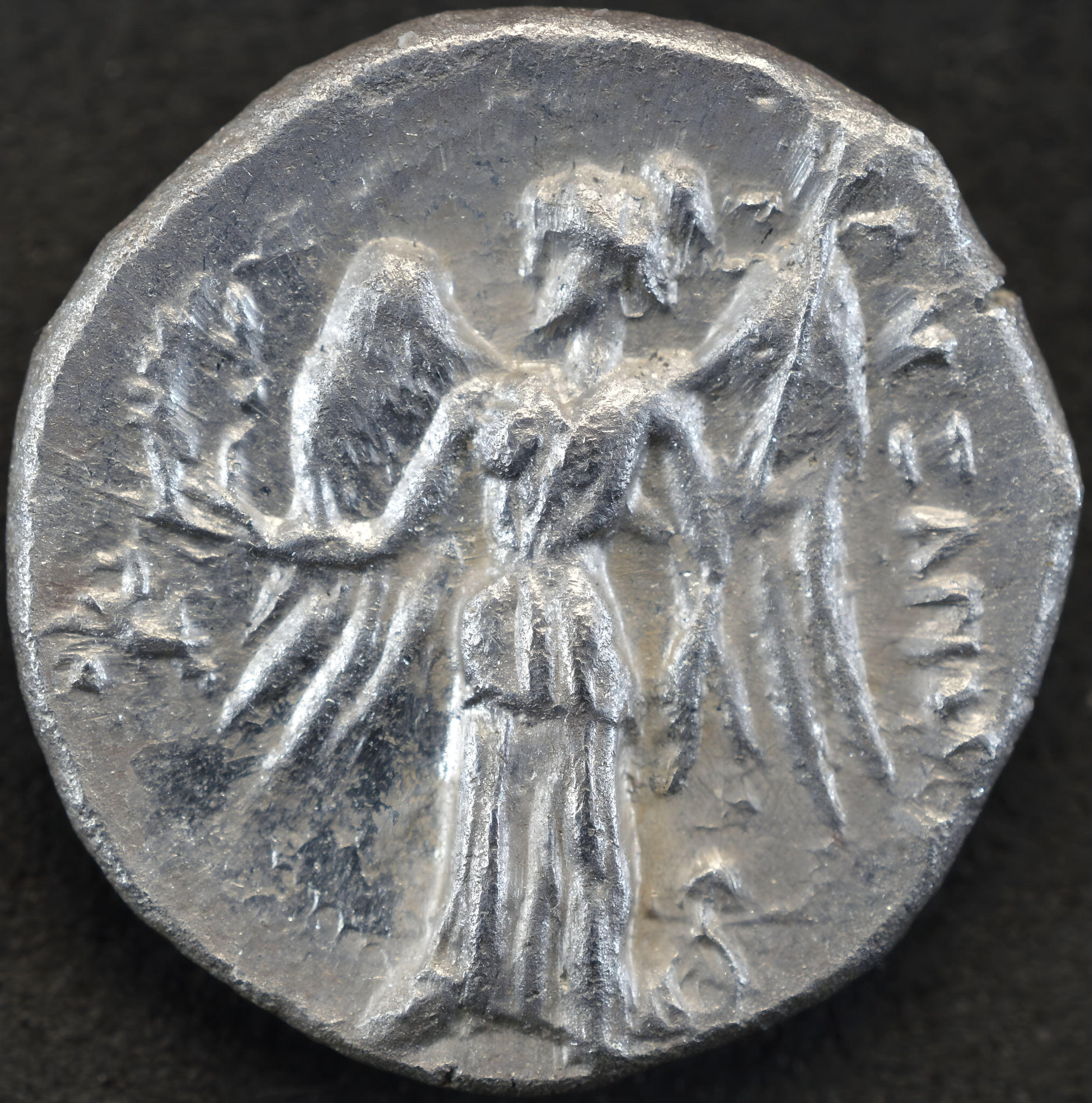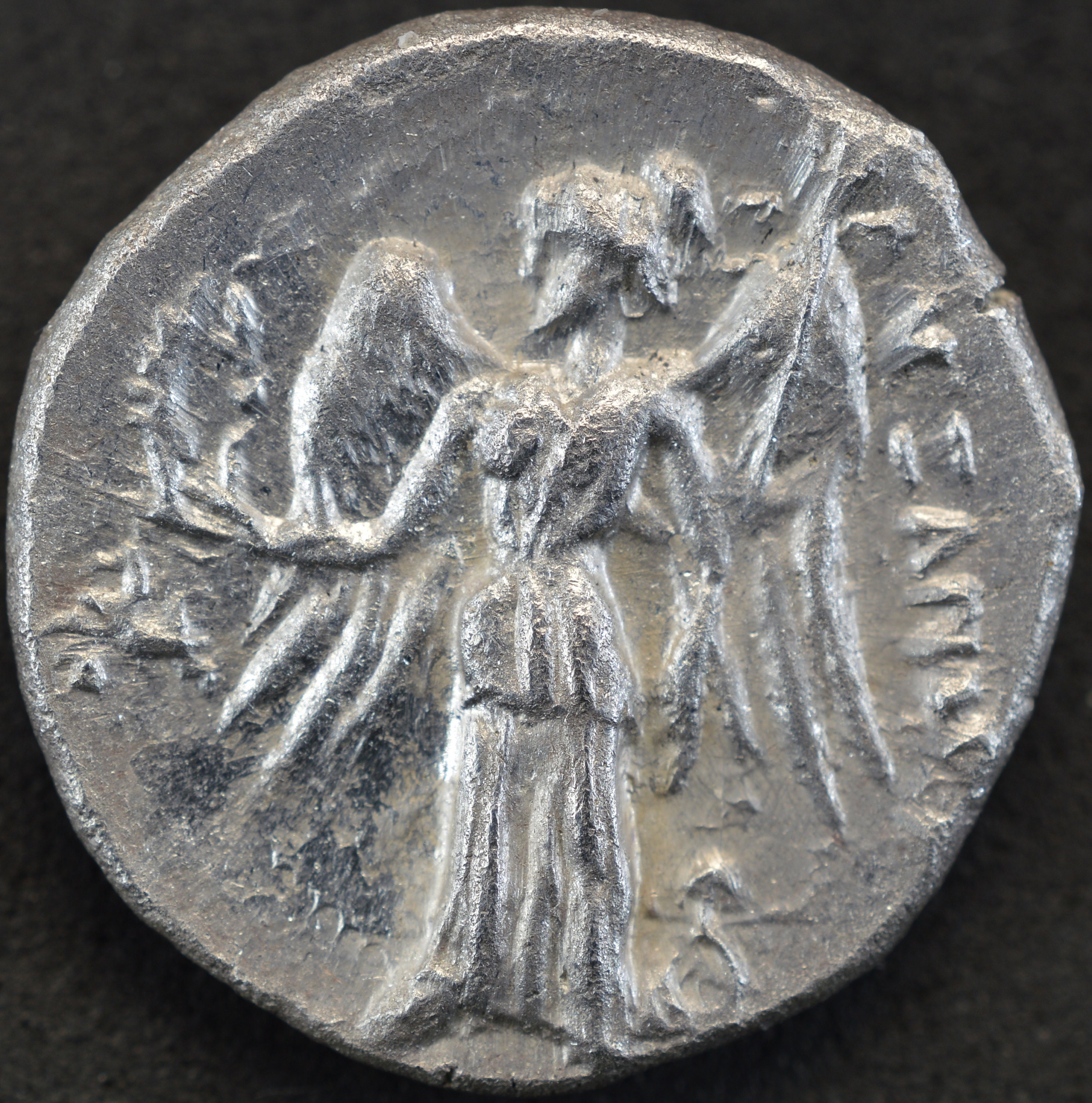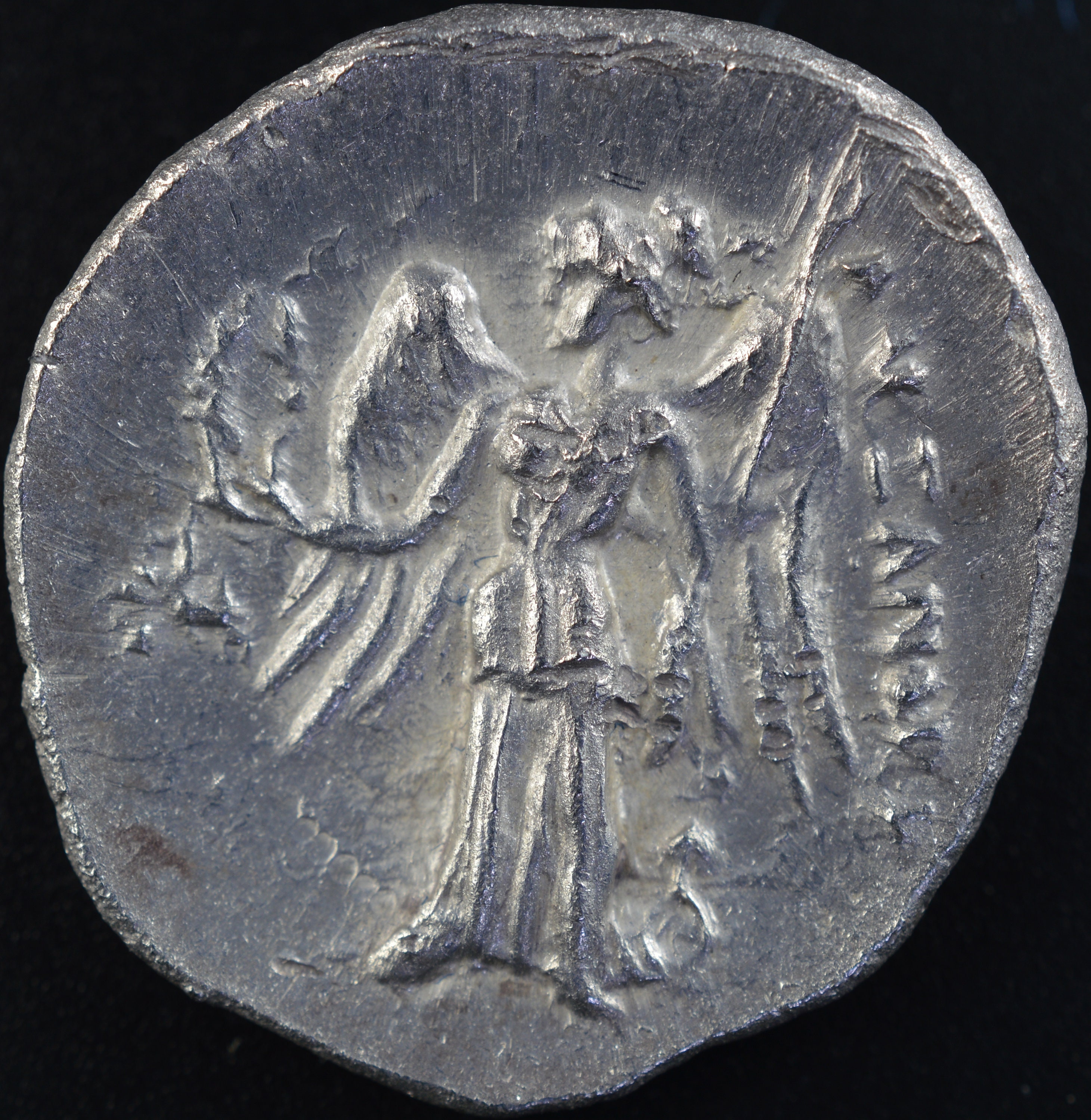 Reverse side: Nike standing facing, head left, holding wreath and stylis; two horse-foreparts conjoined in far left field ; below left wing, monogram, AΛEΞANΔP[OY]
