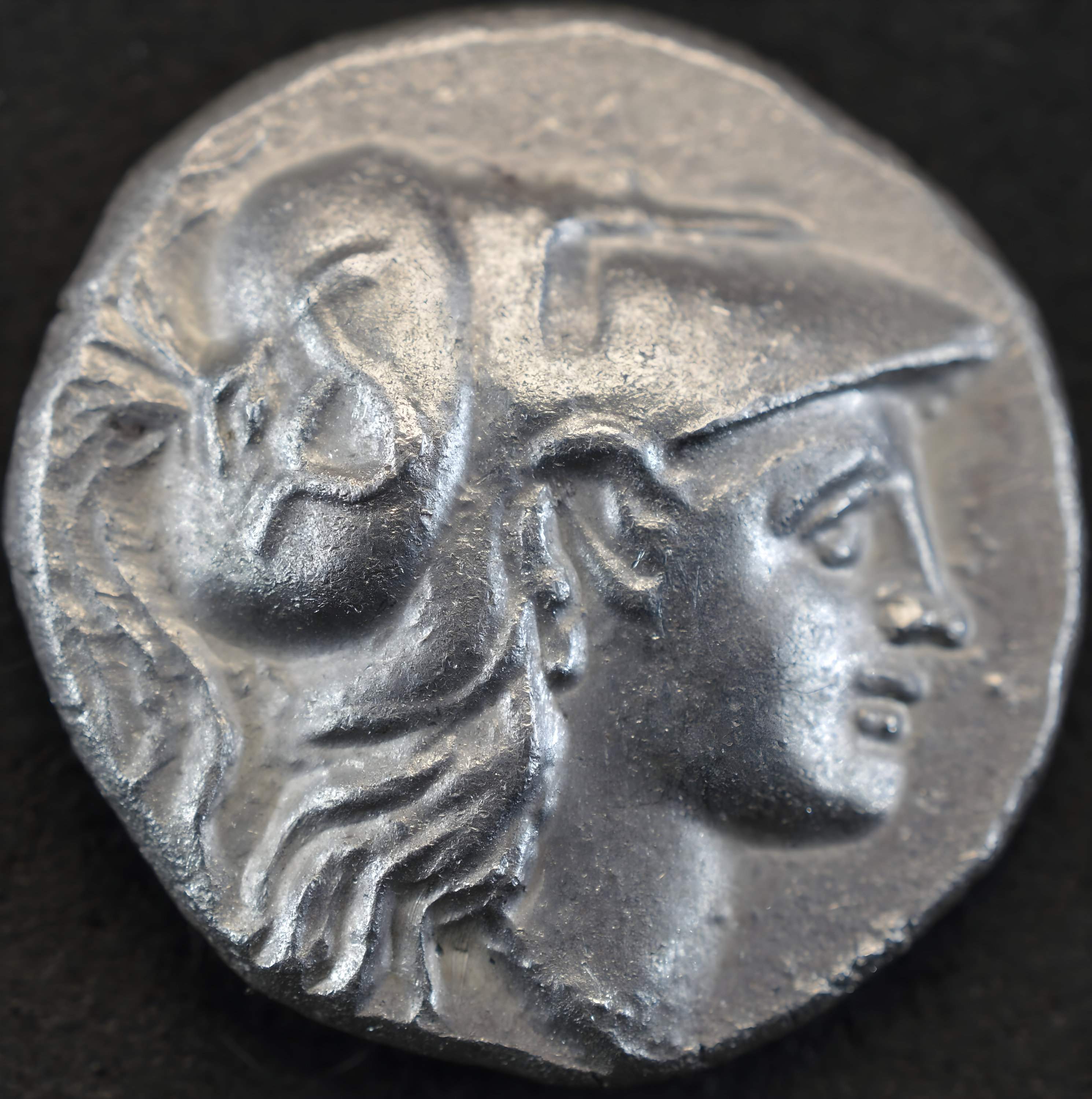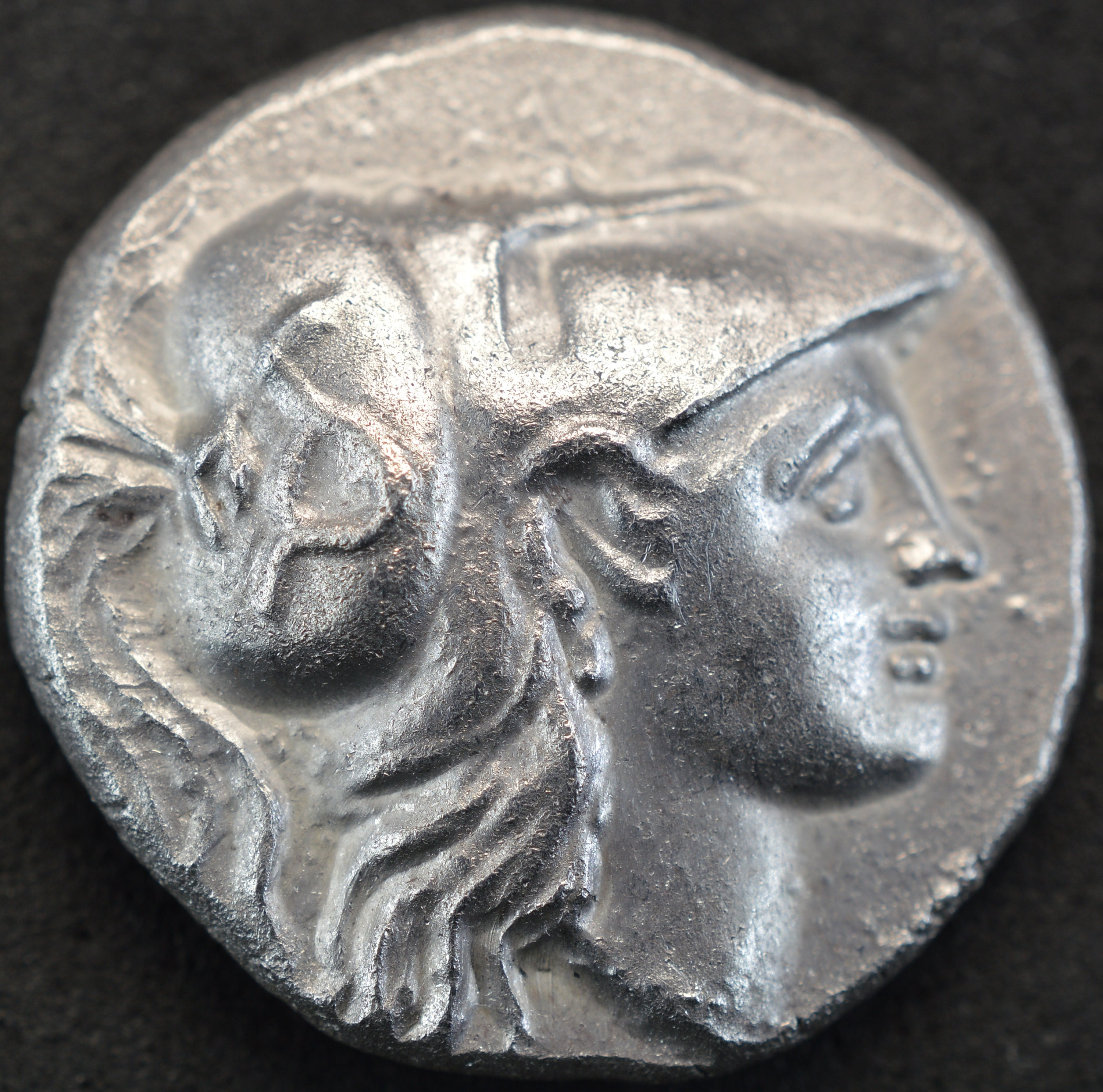 Obverse side: Head of Athena to right, wearing crested Corinthian helmet, the bowl of which is adorned with serpent coiled to right, Anepigraphic