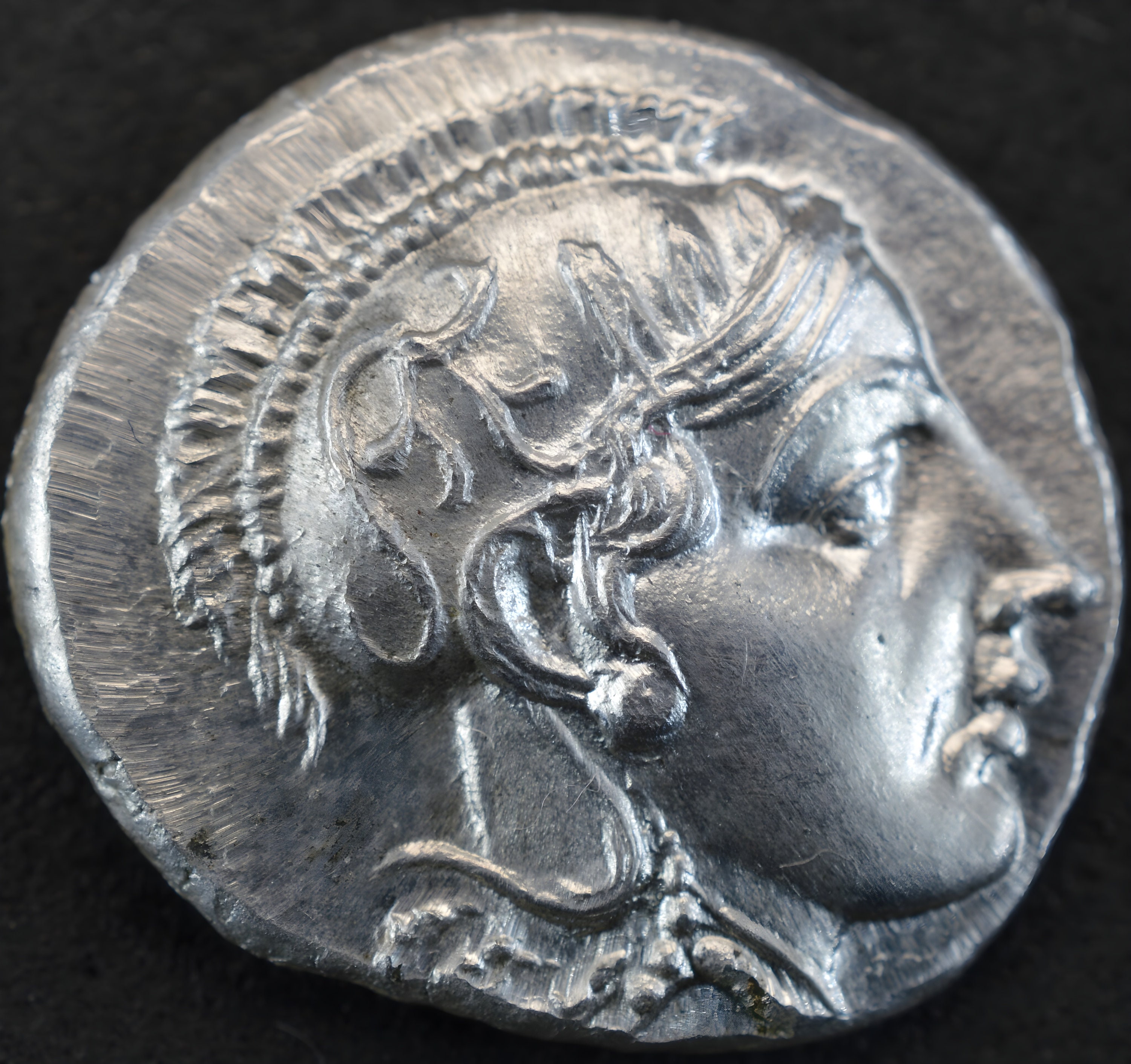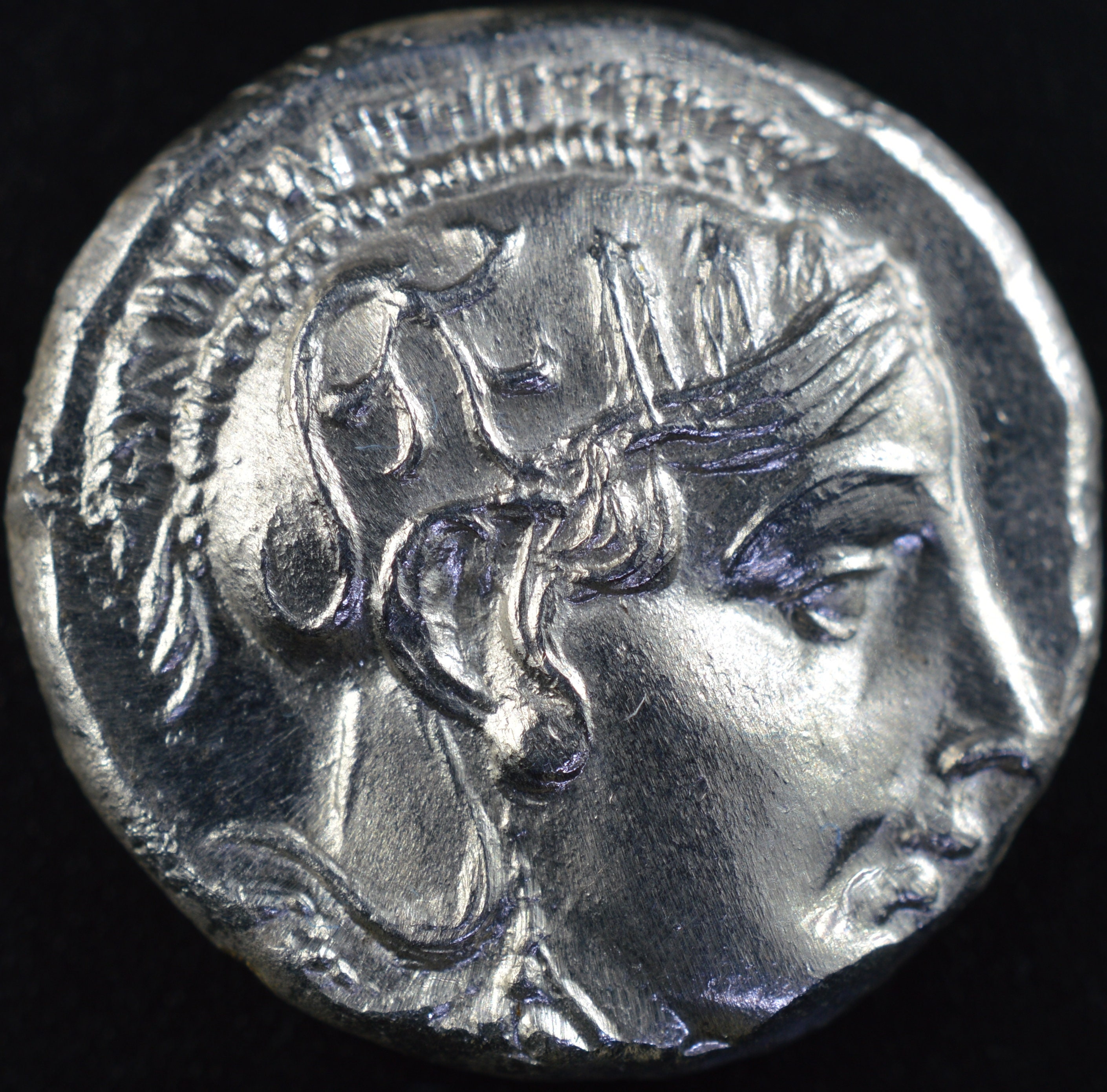 Obverse side: Head of Athena right, with profile eye, wearing crested Attic helmet decorated with a “pi-style” palmette, disk earring, and pearl necklace