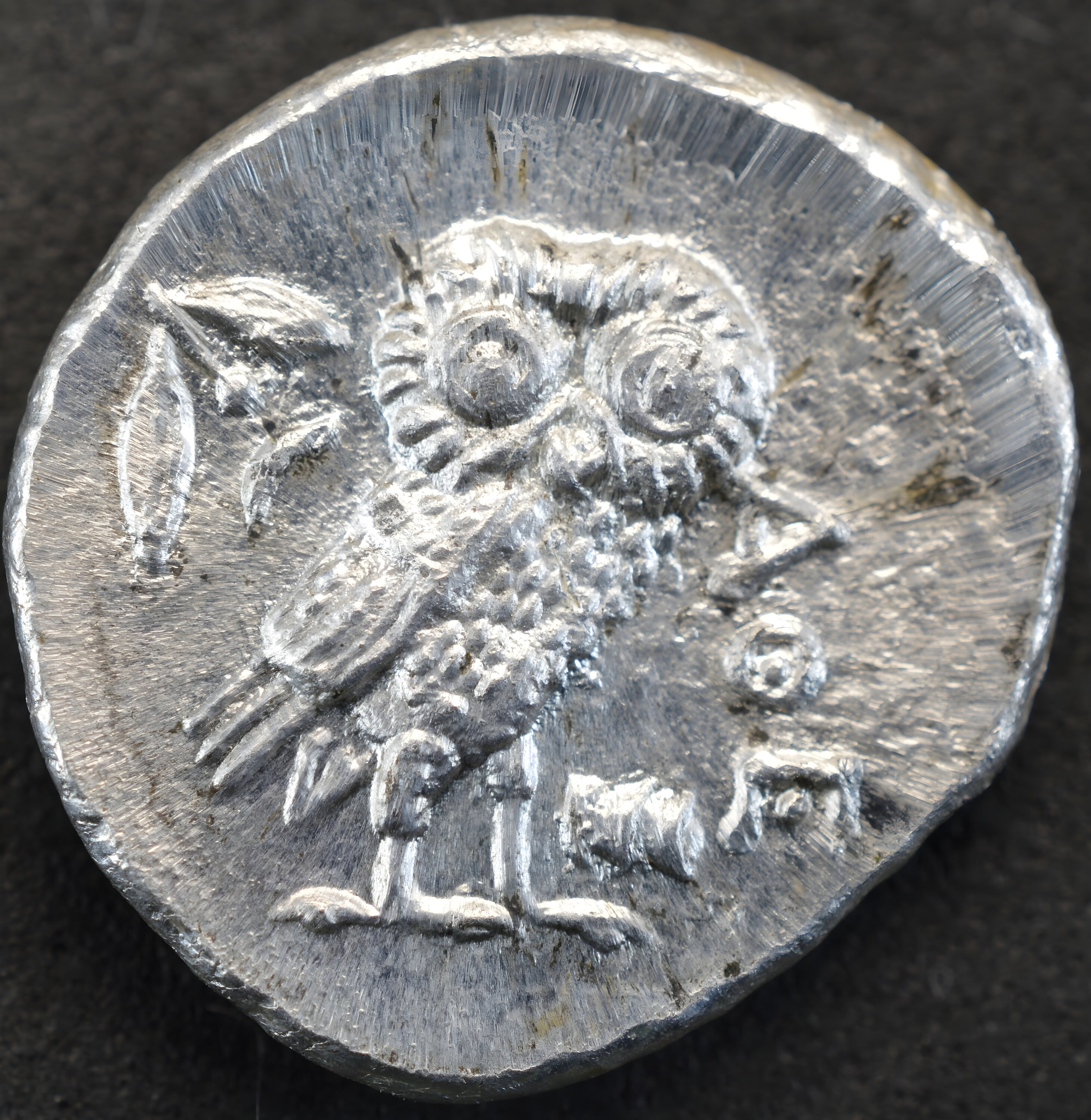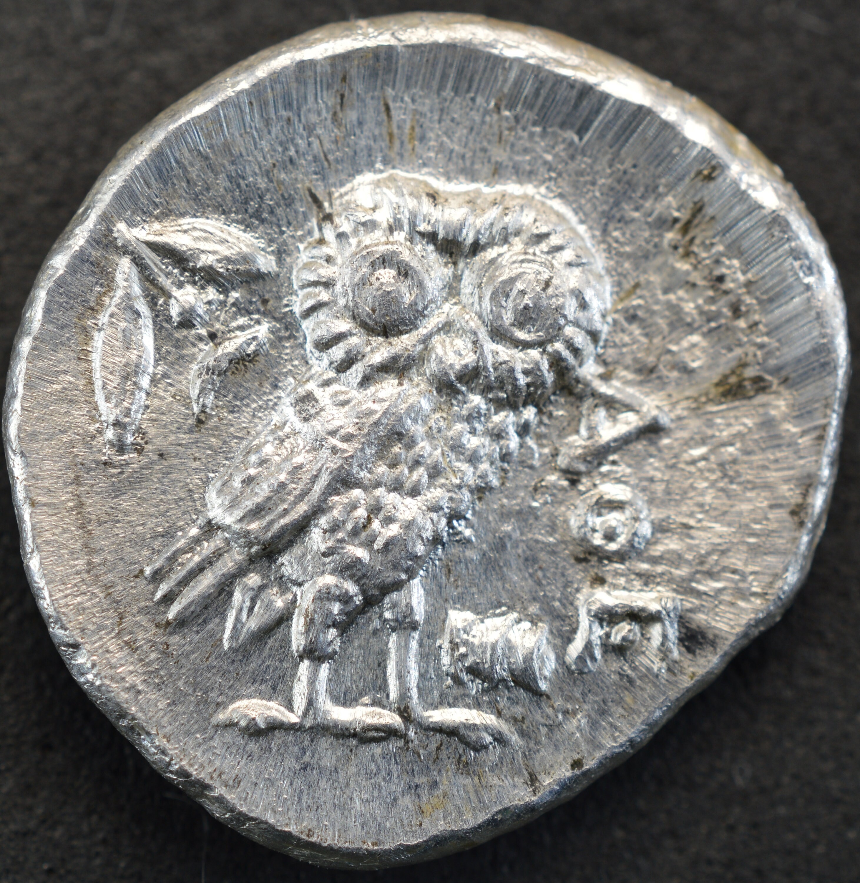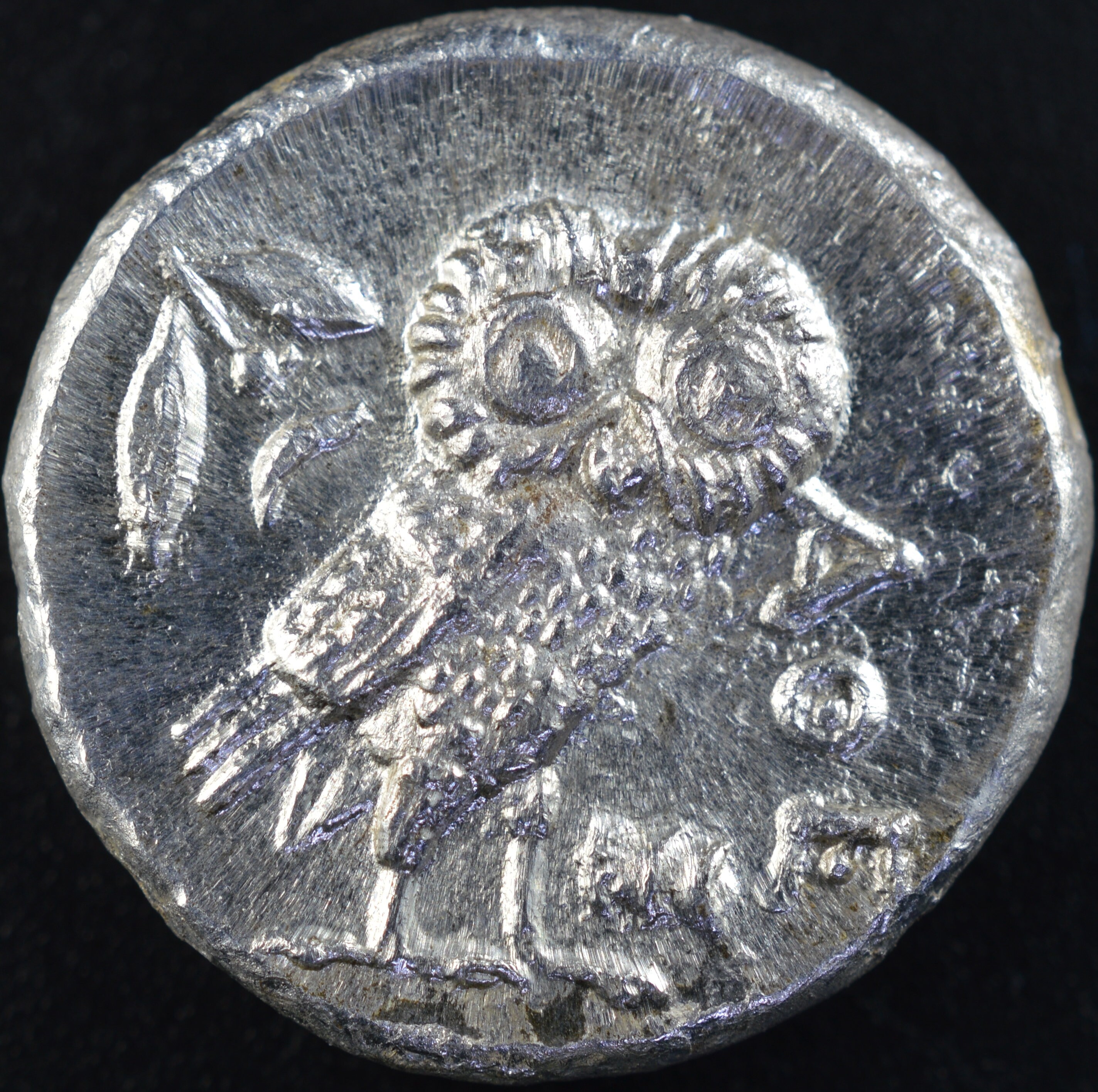 Owls were the first widely used international coin. They popularized the practice of putting a head on the obverse of a coin and a tail (animal) on the reverse. Owls were handled by Pythagoras, Xenophanes, Democritus, Hippocrates, Socrates, Plato, Aristotle, Euclid, Archimedes, and others whose thinking formed the very foundation of Western civilization. They remained thematically unchanged, Athena on the obverse, her owl on the reverse, for half a millennium, through great changes in the ancient world. Because of their centrality, they were known as “Owls” in ancient times as they are today despite many other ancient coins depicting owls in an equally prominent fashion. President Theodore Roosevelt used a Classical Owl as a pocket piece, which inspired him to order the redesign of U.S. coins early last century.