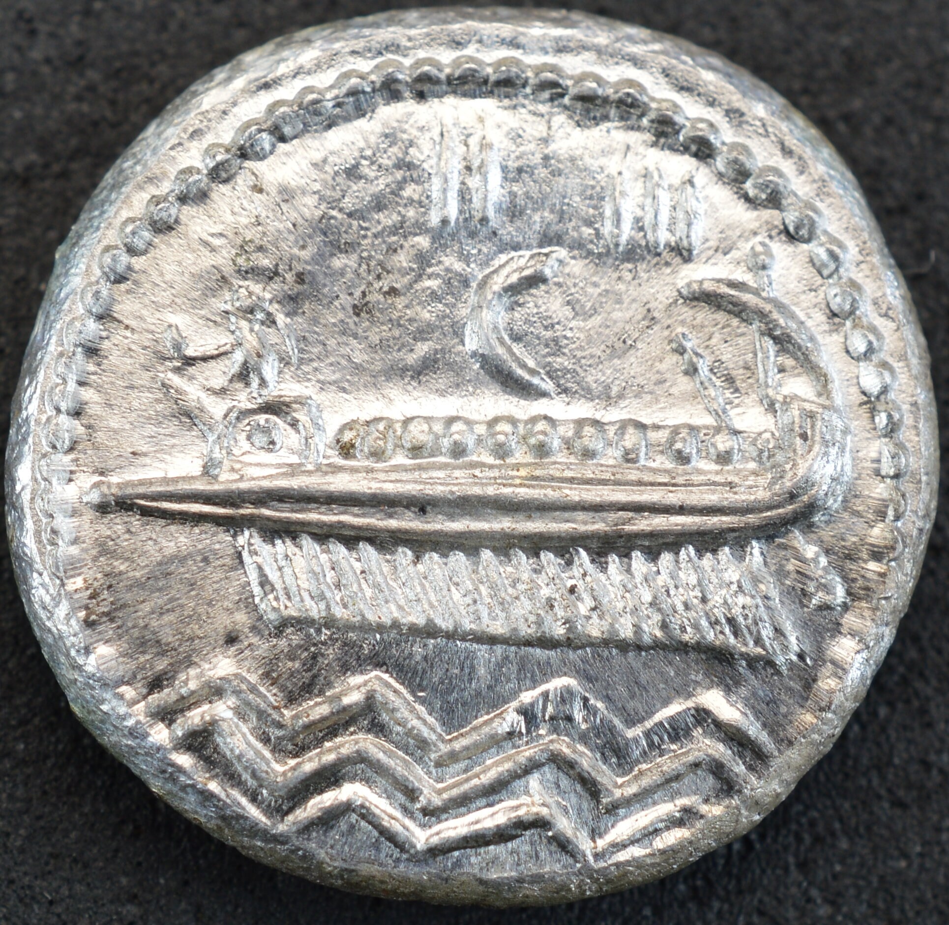 Obverse side: Phoenician penteconter left; figure standing left at prow, standard at stern; crescent above; || ||| (date) above crescent; three series of waves below
