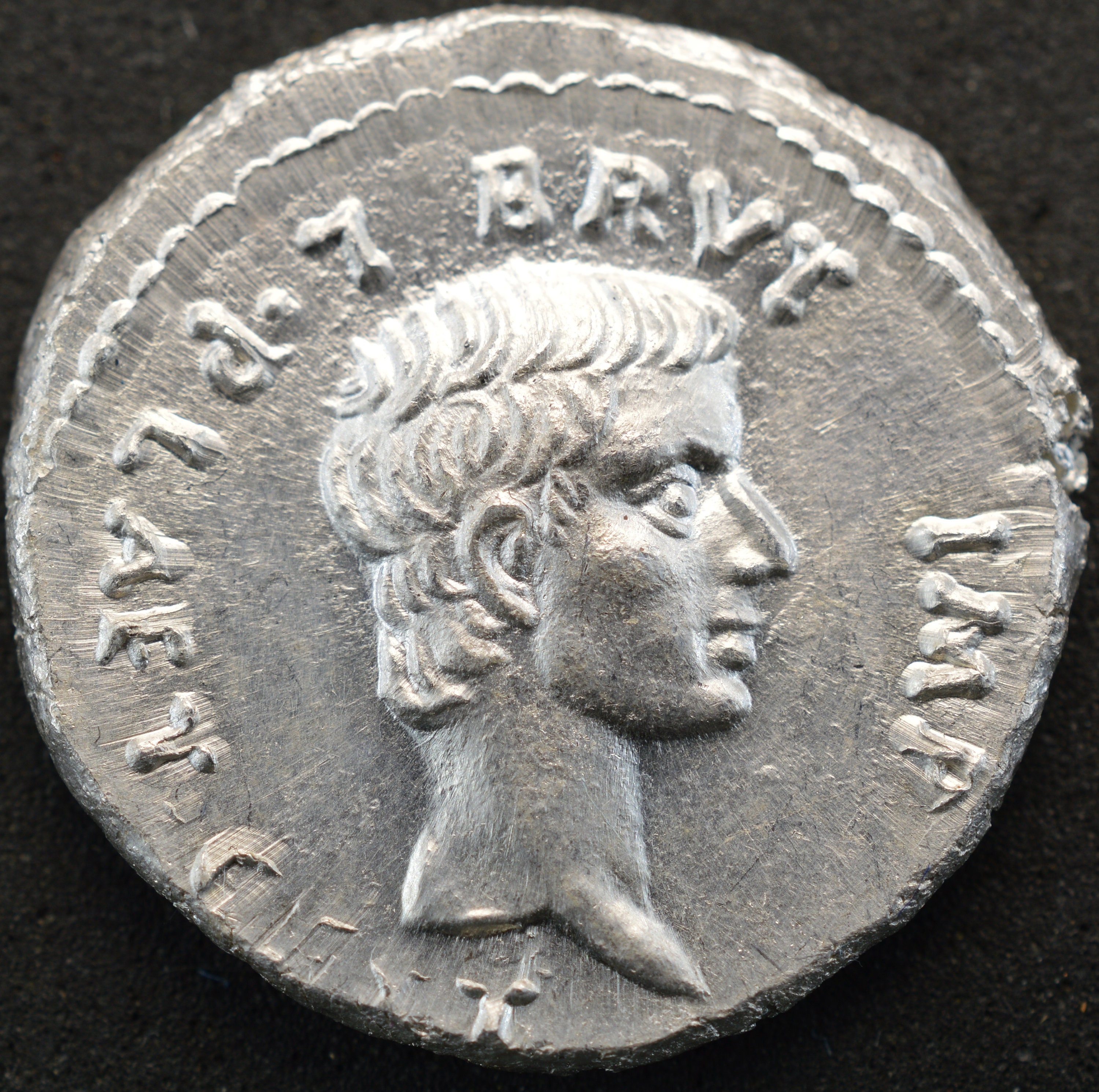 This extraordinary type is one of the few specific coin issues mentioned by a classical author, Dio Cassius, Roman History 47. 25, 3: “Brutus stamped upon the coins which were being minted his own likeness and a cap and two daggers, indicating by this and by the inscription that he and Cassius had liberated the fatherland.” The only securely identified portraits of Brutus occur on coins inscribed with his name; all others, whether on coins or other artifacts, are identified based on the three issues inscribed BRVTVS IMP (on aurei) or BRVT IMP (on denarii). A careful study of Brutus’ portraits by S. Nodelman segregates these inscribed portraits into three main categories: a ‘baroque’ style portrait on the aurei of Casca, a ‘neoclassical’ style on the aurei of Costa, and a ‘realistic’ style on the ‘EID MAR’ denarii, which Nodelman describes as “the soberest and most precise” of all.