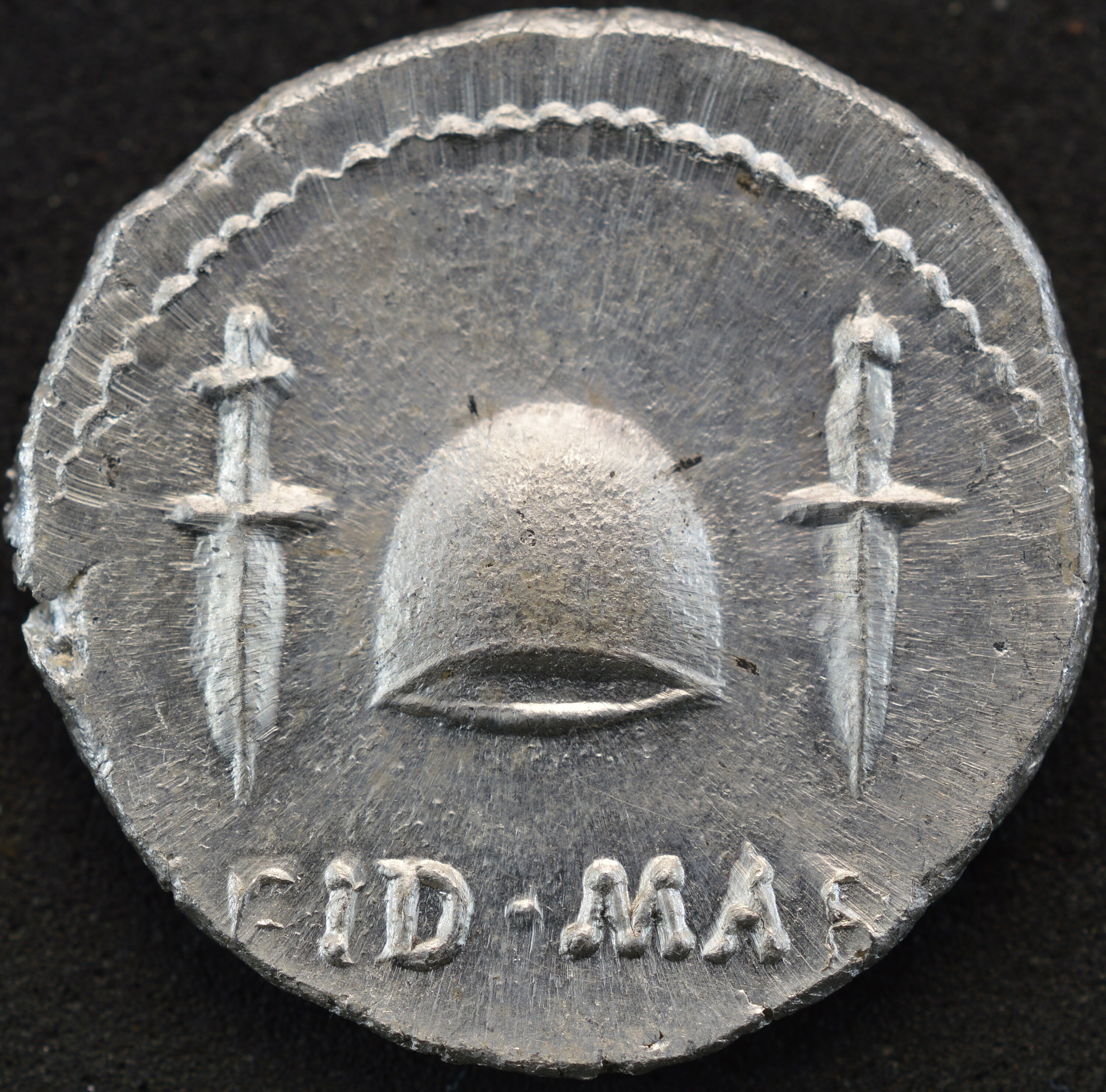 The EID-MAR or “Ides of March” is one of the most historically and politically significant coins in history. The Roman denarius commemorates the assassination of dictator Julius Caesar in 44 BC. EID-MAR signifies the date that Caesar was assassinated “March 15th”. the two daggers representing the two assassins, Brutus and Cassius. Between the daggers is a slave freedom cap, the cap was a symbol of liberty opposing dictators like Caesar.