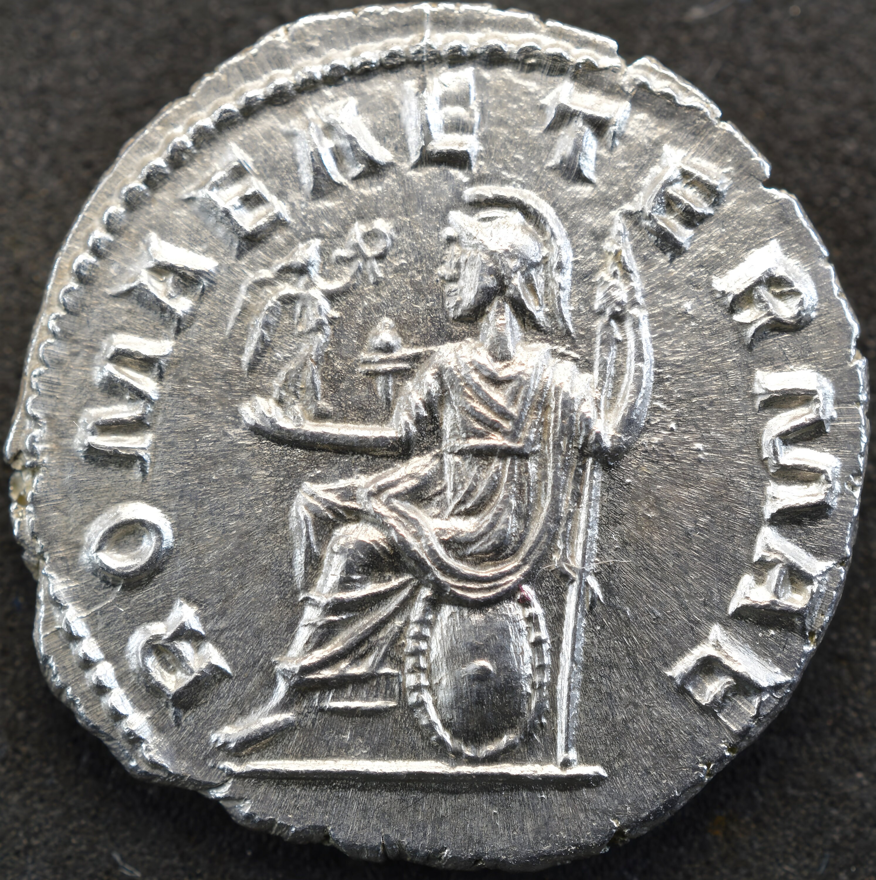 ROMAE AETERNAE – From the earliest age it was the presentiment of the Romans that their city would be Eternal; and to such a pitch of madness did their opinion of theirs proceed, that they paid divine honours to Rome, erected temples and altars to her honour, and instituted priests to perform sacrifices to this deity of their own creation. This legend, struck in each metal, with various types (but chiefly that of Roma Victrix seated, a shield by her side, a spear in her left hand, and a figure of Victory in her right), appears on coins of Antoninus Pius, Pescennius Niger, Gordian I, Gordian II, Severus Alexander (first brass), Philip I, Trebonianus Gallus, Hostilian, and others. A silver medal of Septimius Severus bears on its reverse ROMAE AETERNAE, with a temple of six columns, adorned with many statues, in the midst of which Rome is seated.