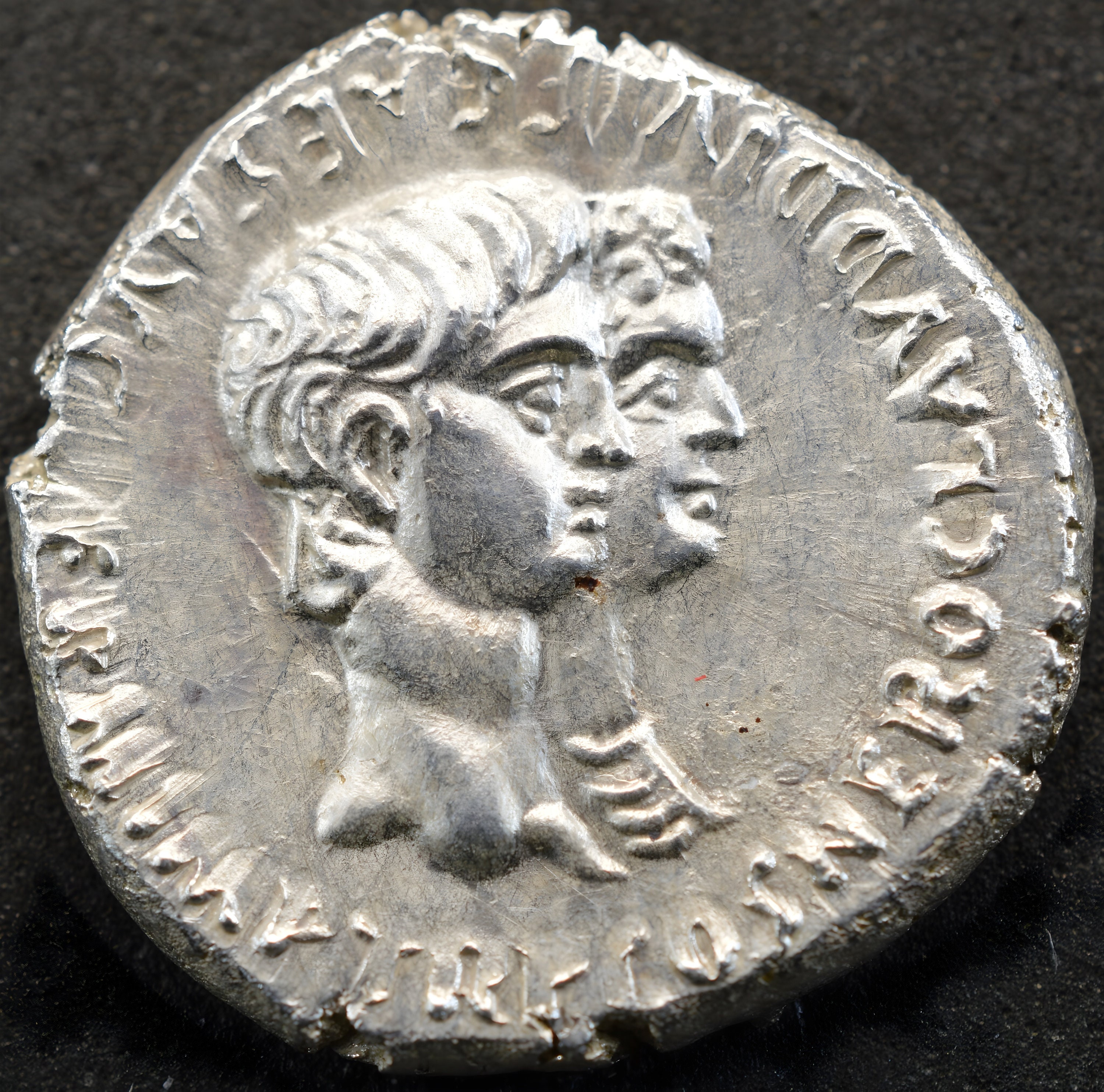 Agrippina’s rapid loss of influence after successfully engineering Claudius’ death and Nero’s accession to the throne, culminating in her expulsion from the palace by Nero, is reflected in the gold and silver coinage of Nero’s first regnal year. Agrippina is prominent in Nero’s first coin type as emperor: her titles occupy the obverse, relegating Nero’s titles to the reverse, and her portrait faces Nero’s, though in the subordinate right-hand position. In the second type (shown by our denarius), the titles changed places, Nero’s now occupying the obverse, and the portraits became jugate, with Agrippina behind Nero. Thereafter, Agrippina was entirely excluded from the coinage.