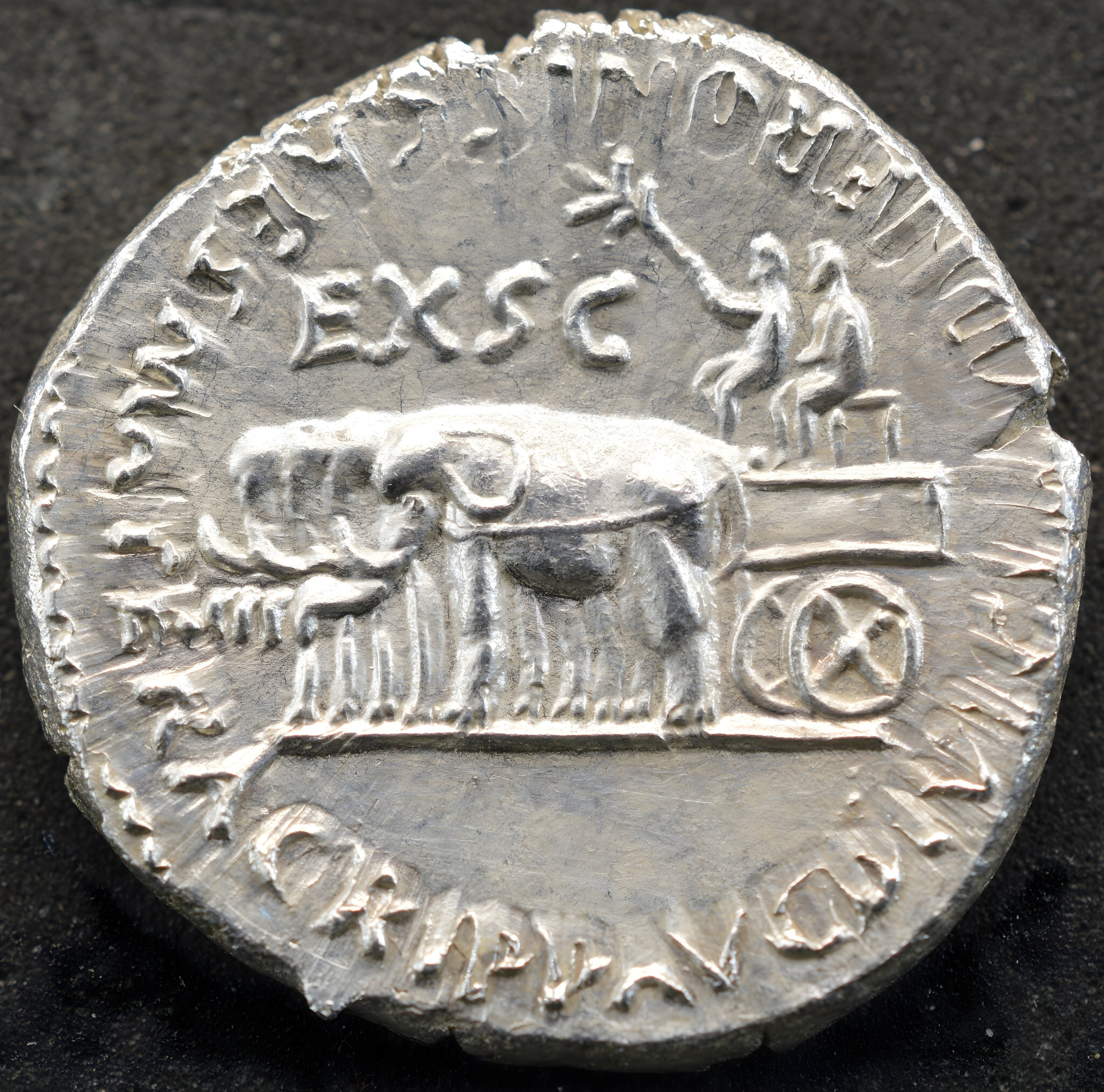 Reverse side: Quadriga of elephants left, bearing two chairs on which are seated the Divus Claudius and Divus Augustus