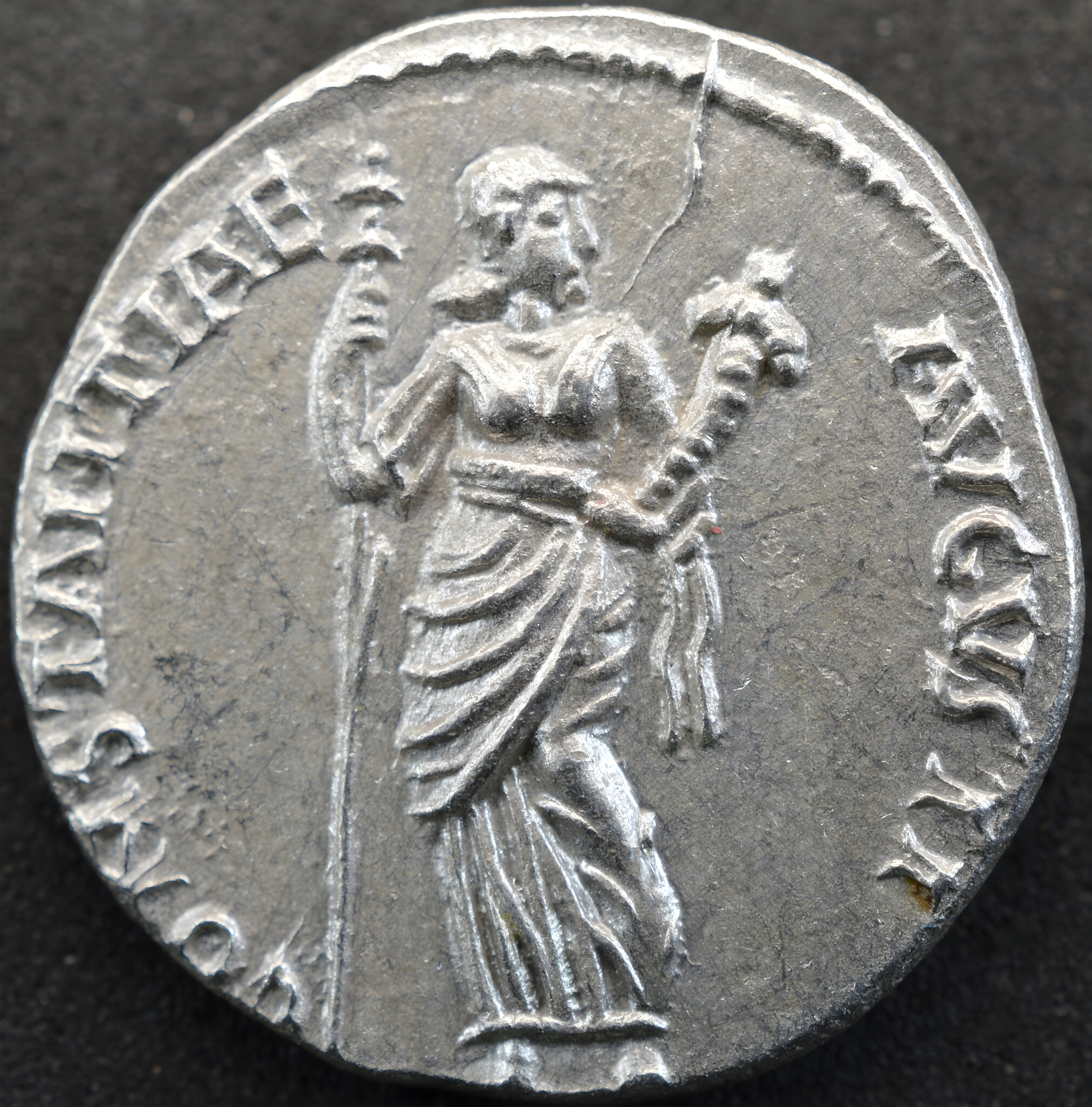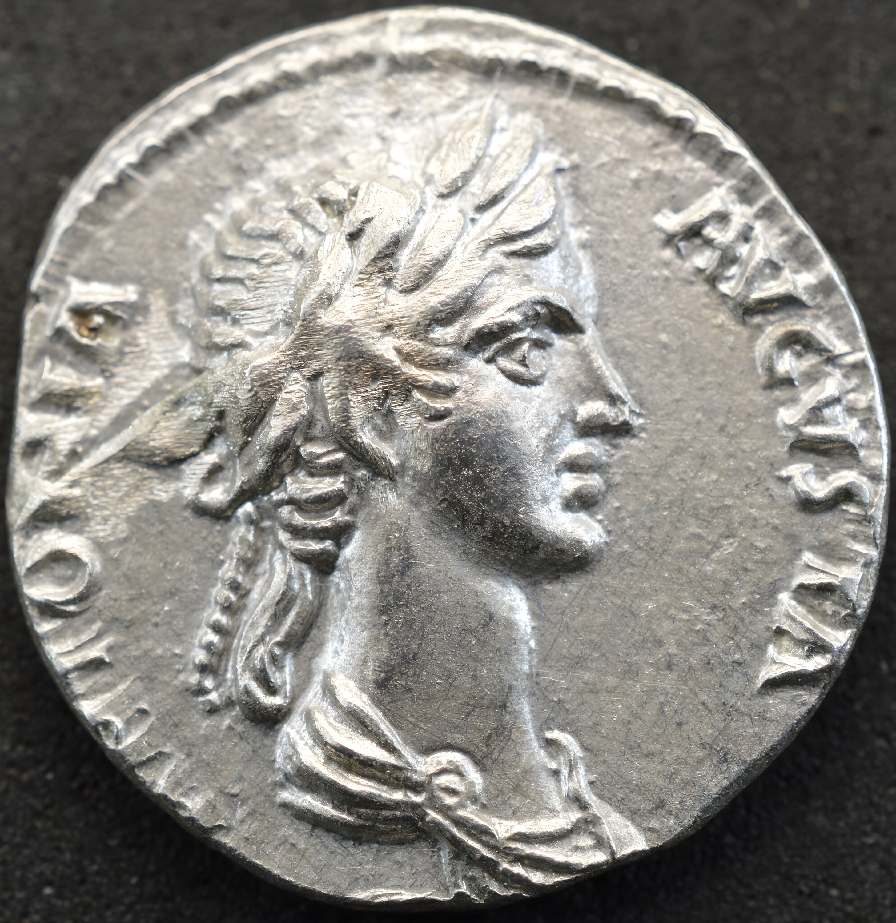 Antonia was the younger daughter of Mark Antony and Octavia in 36 BC. In either 18 or 16 BC, she married Nero Claudius Drusus, to whom she bore three children: Germanicus, Livilla and Claudius. Although initially honored with the title of Augusta by her grandson, Caligula, she eventually fell out of favor with him, committing suicide in AD 37 possibly as a result. Her son Claudius reconfirmed the title on her posthumously in AD 41. RIC notes that the reverse of this type emphasizes Antonia “as the model for Claudius’ Constantia and also as the priestess of Divus Augustus, from whom imperial auctoritas ultimately flowed.”