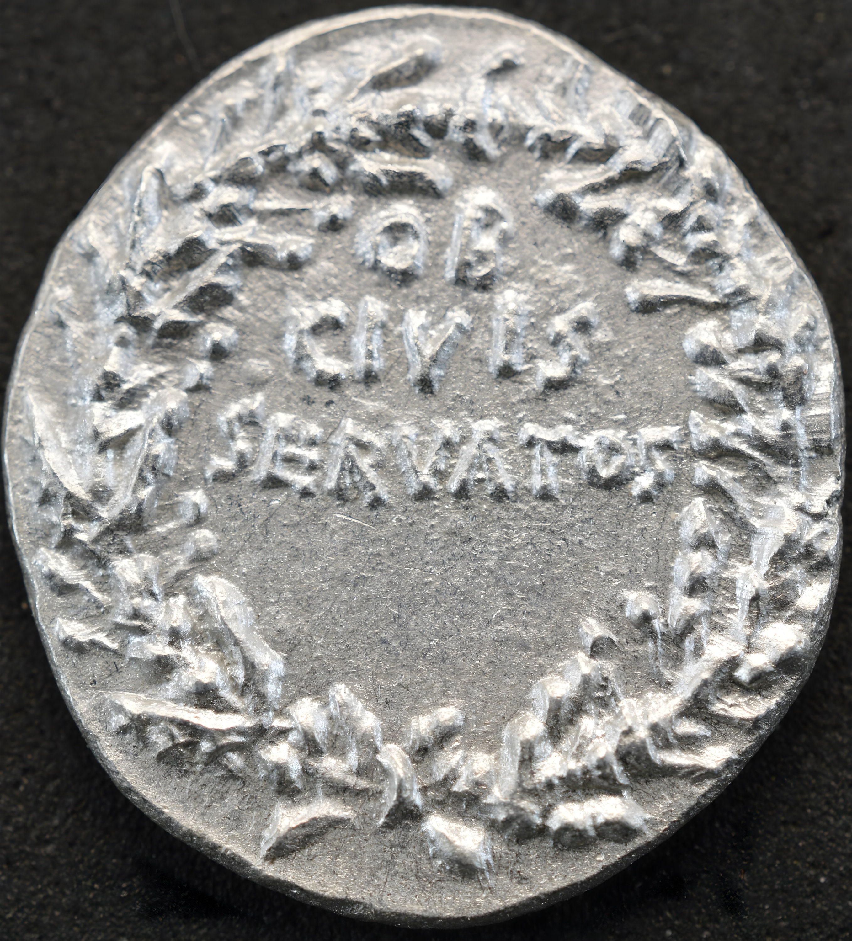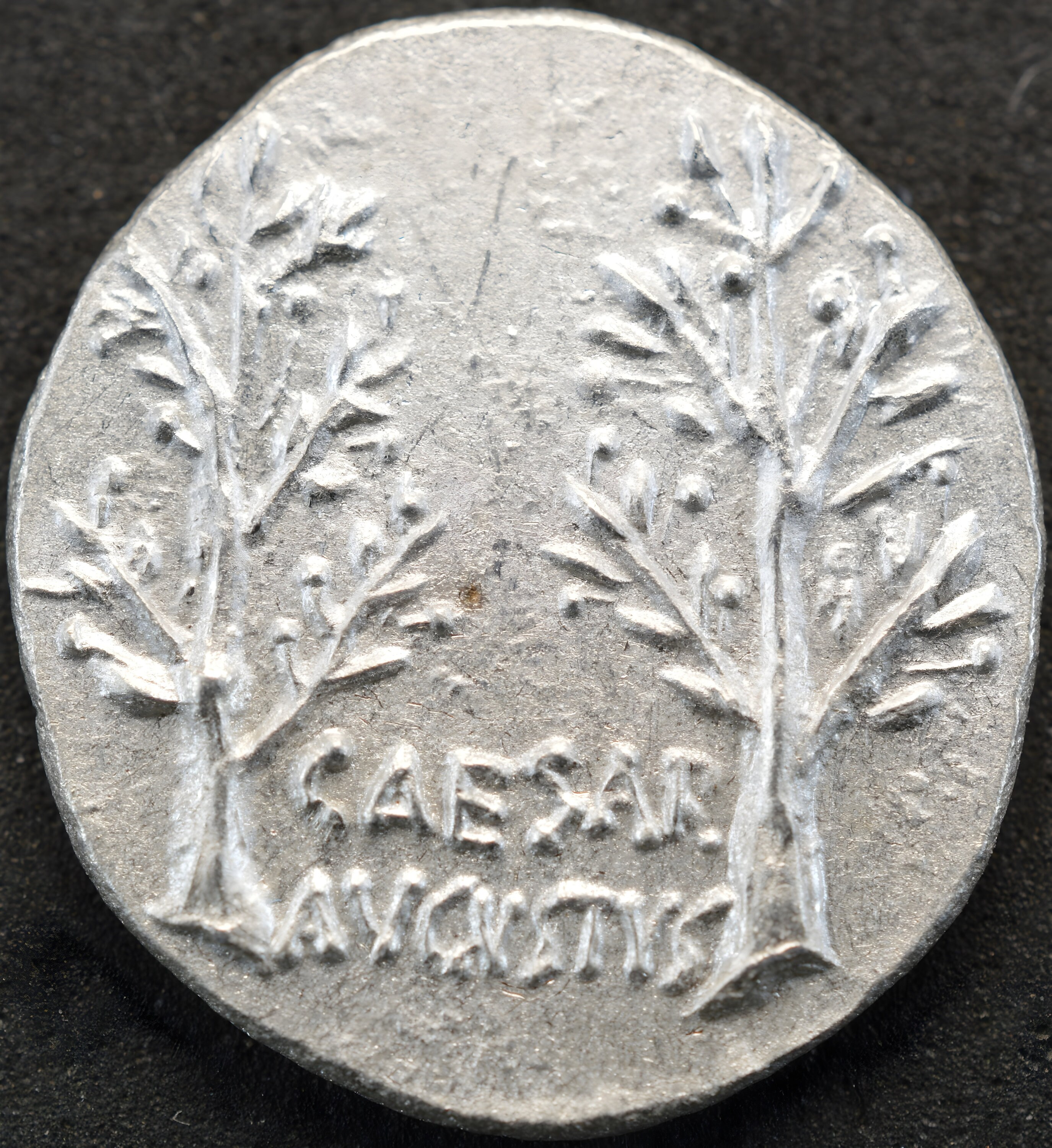 The Iberic city of Salduie (today called Zaragoza) had been populated by an ancient Iberian tribe named the Sedetani. Around 20-15 BC, in order to settle army veterans from the Cantabrian wars, the emperor founded in its place a Roman colony which was called Colonia Caesar Augusta in his honour, and it is certainly for the same soldiers that this coin was struck. The existence of this mint, as different from that of Colonia Patricia (Cordova), was defended by both L. Laffranchi and H. Mattingly, but contested by R. Prideaux – who considered that this young colony was too close to Tarraco (Tarragona). Prideaux also contested J.-B. Giard’s suggestion of another mint at Nemausus (Nîmes), even though a die had been found in the fountain of the city. He admitted that, when Agrippa arrived in Spain in 19 BC to fight the Cantabrians, there was an immediate need of coins to pay the legions, and then of money to purchase land to found colonies for retiring veterans – such as Colonia Caesar Augusta, but he assumed that established mints and their experienced workers would have been used, and he suggested the mint of Emerita Augusta (Mérida). In any case, whilst the obverse of this coin shows two laurel-trees, the reverse instead shows a wreath of oak-leaves, around the legend OB CIVIS SERVATOS – which refers to an award (for saving the life of a fellow Roman) that had been bestowed upon him by the Roman senate after he obtained in 20 BC from Phraates IV the liberation of thousands of Roman citizens that had been made prisoners in Parthia (it was a great success for Octavian, notably because he also obtained the standards which Crassus had lost in the battle of Carrhae – standards, which figure on the ‘Augustus of Prima Porta’ statue and which were stored in the Temple of Mars Ultor). This title was undoubtedly precious to Augustus’s eyes, as he chose the legend CAESAR COS VII CIVIBVS SERVATEIS – AVGVSTVS for what seems to be his first emission in gold (ref. Calicó 173). In the words of Cassius Dio, “Octavian had even before received many honours when the questions of declining the sovereignty and of allotting the provinces were being discussed. At that time, the privilege of placing the laurel trees in front of the royal residence, and of hanging the wreath of oak leaves [corona civica] above them, was voted in his honour to recognize in perpetuity his status as victor over his enemies and the savior of the citizens”. Recipients of the corona civica were entitled to various honours, one of which was having spectators rise as they entered a public theatre. The laurel branches were a sign of martial victory, that invoked his victory over Mark Antony and Cleopatra at Actium.