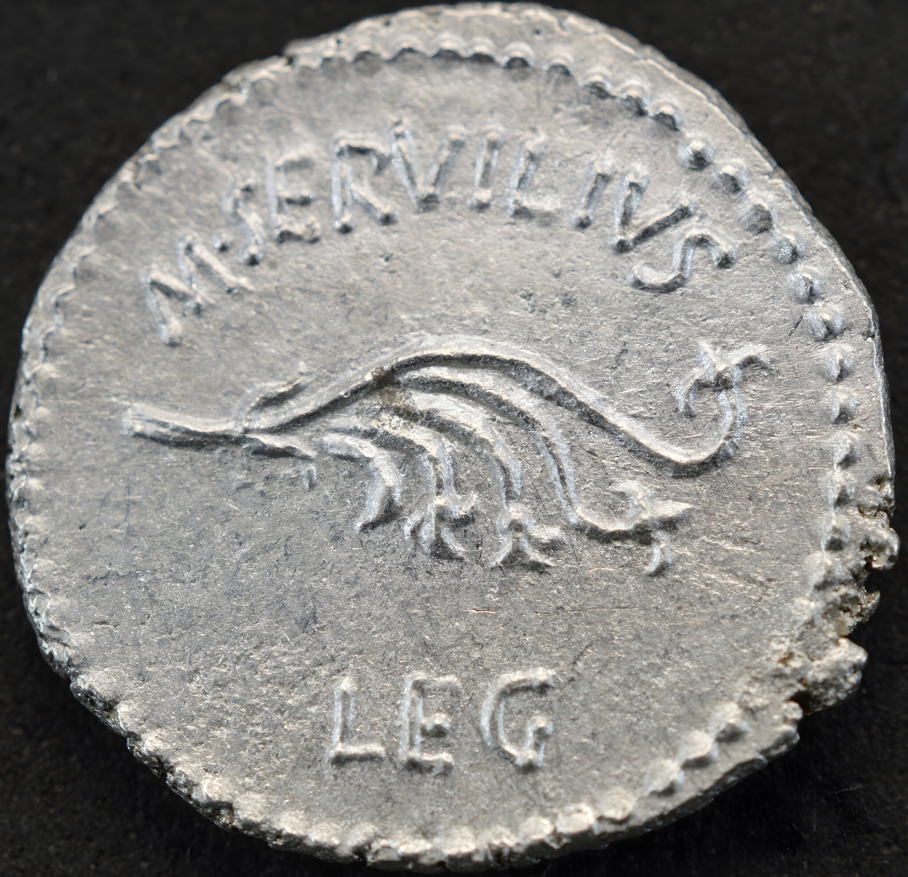 This rare and remarkable denarius was struck for Cassius by his lieutenant Marcus Servilius, most likely at Sardis in Asia Minor. The head of Liberty on the obverse reflects the Republican party line against supporters of the dead tyrant Caesar, while the naval pennant, or aplustre, refers to Cassius’ victory at Rhodes.