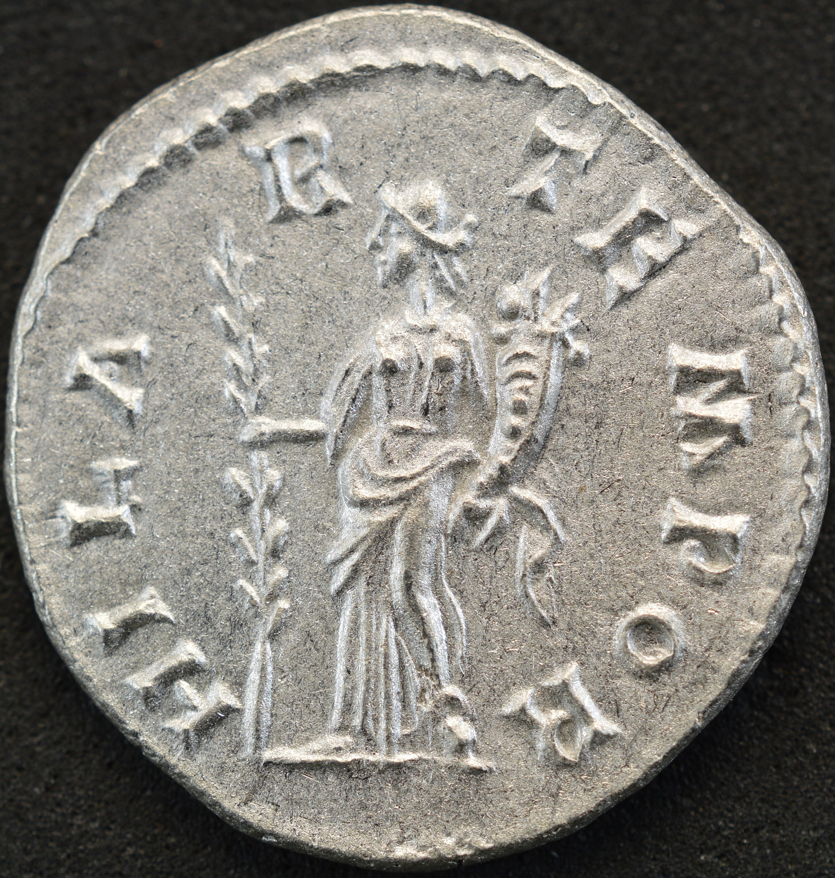 Hilaritas on reverse is an allegorical goddess of cheerfulness, good-humor, rejoicing. She is similar to eudaemonia, the Aristotelian concept of happiness. She is represented on Roman imperial coins as a standing female figure, holding a palm branch in her right hand and a cornucopia in her left. On some coins she is flanked by a child.