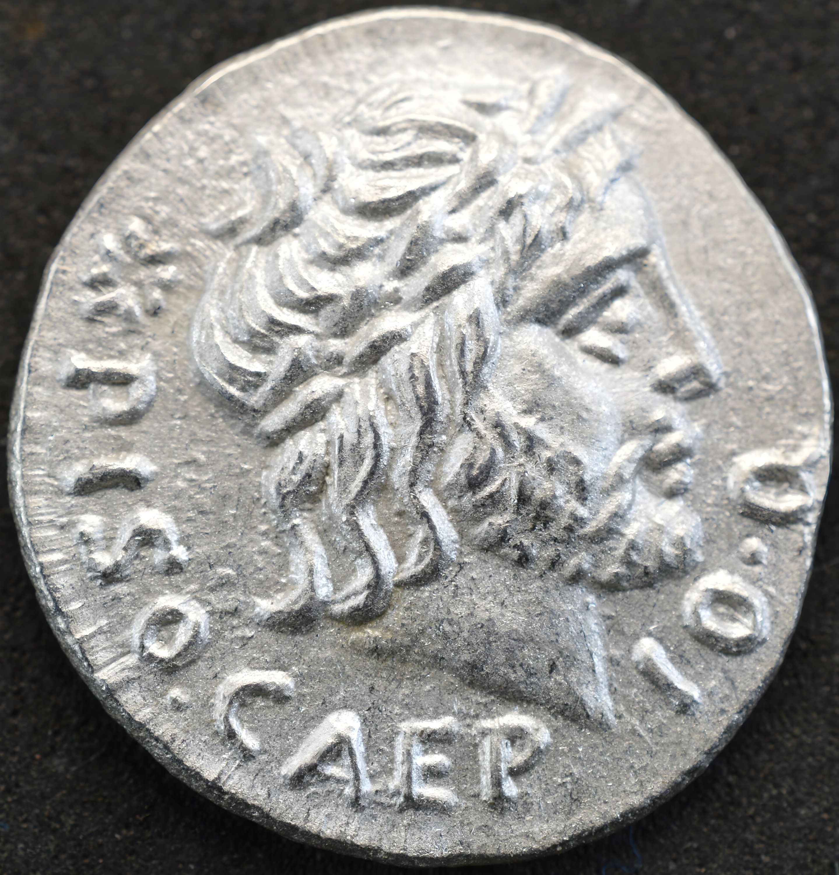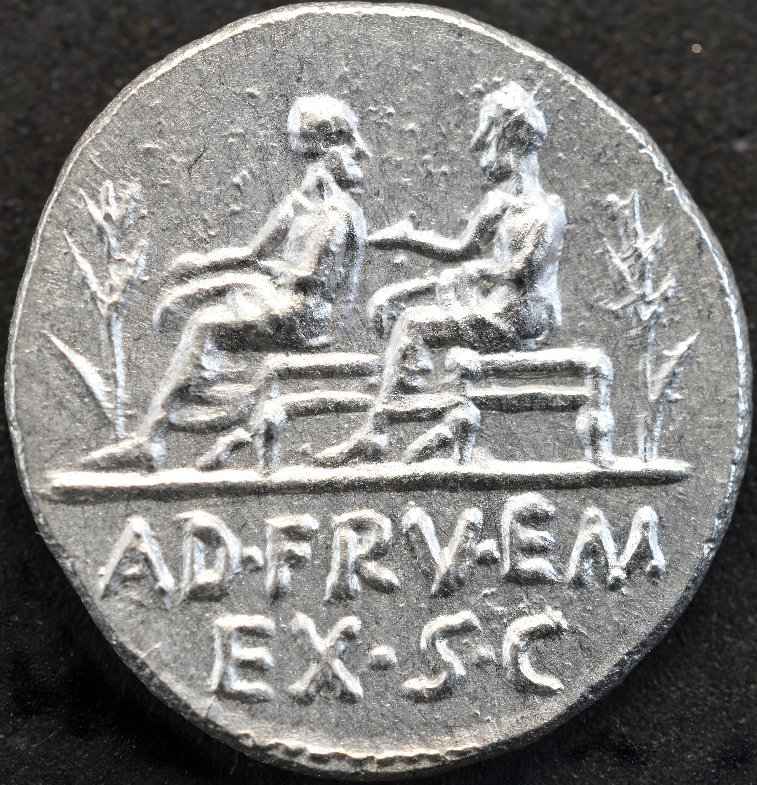 Silver Roman Republic Denarius L. Calpurnius Piso Caesoninus and Q. Servilius Caepio. This type was a joint issue of the Quaestor Urbanus (Caepio) and the Quaestor Ostiensis (Piso), produced for the purchase of grain by special decree of the Senate (Ad frumentum emundun, ex senatus consulto).