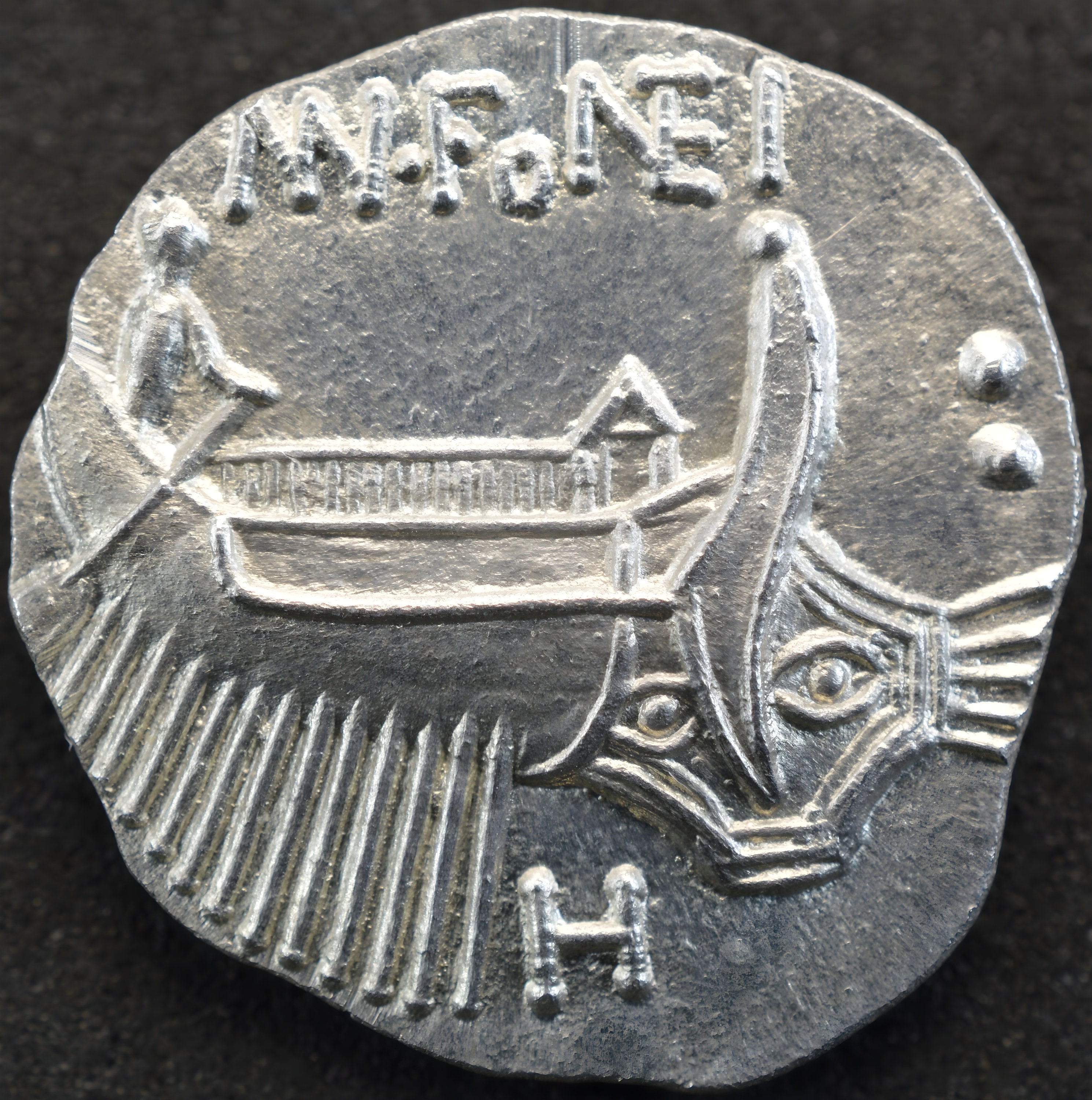 Reverse side: Galley under oar, facing right, with eyes painted on prow; in stern,helmsman; below, control letter H
