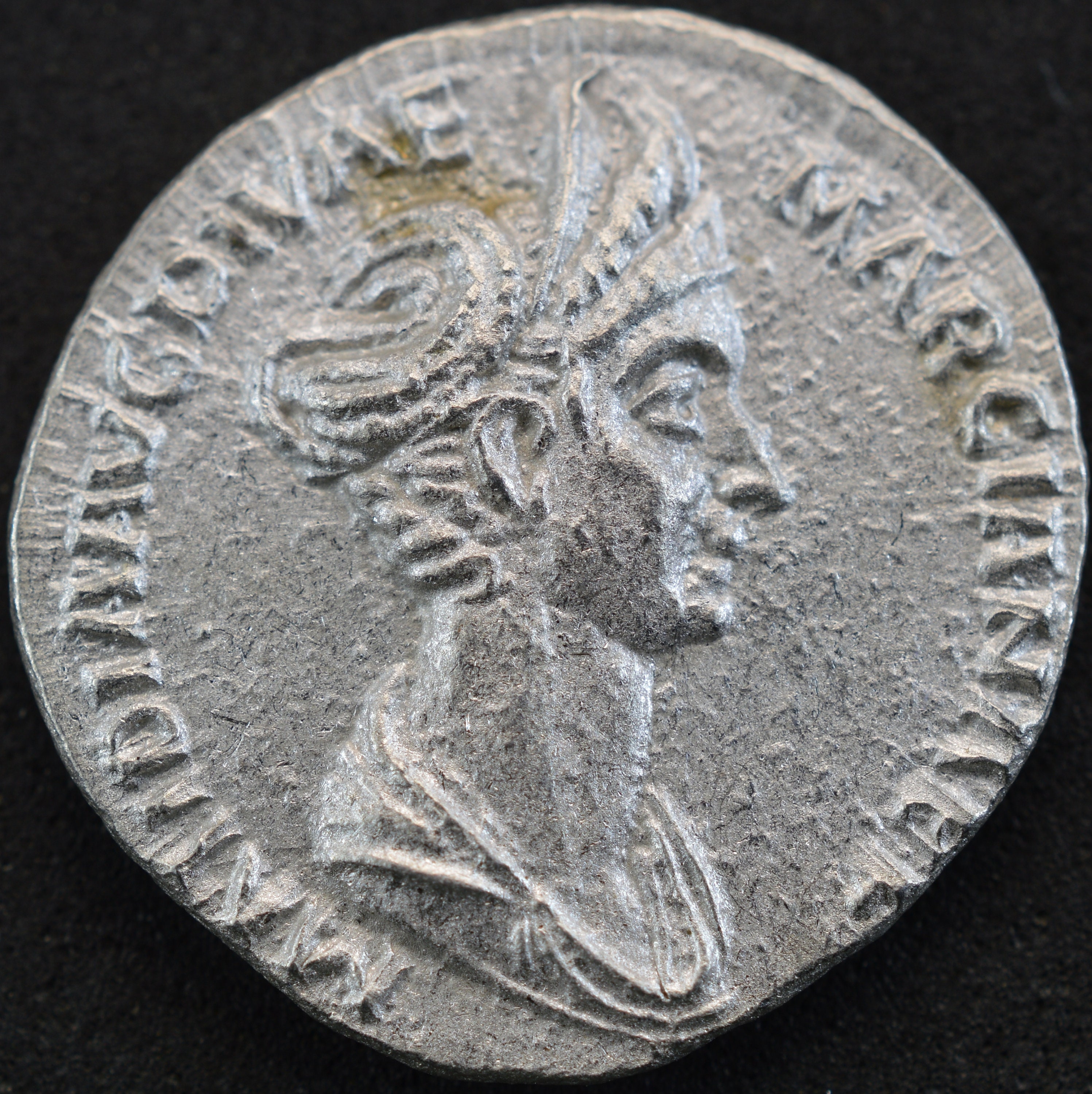 Matidia the daughter of Marciana and niece of Trajan; she was the mother of Sabina, who became the wife of Hadrian. She was declared Augusta along with Plotina, by a decree of the Senate about 113. Possessing all the virtues of her mother, she equally received with her the honors of the apotheosis, under the reign of Hadrian, some say of Antoninus Pius. The coins of Matidia, like those of Plotina and Marciana, are in each metal of the highest degree of rarity. On these she is styled MATIDIA AVG F – MATIDIA AVG DIVAE MARCIANAE Filia – also DIVA MATIDIA SOCRVS.