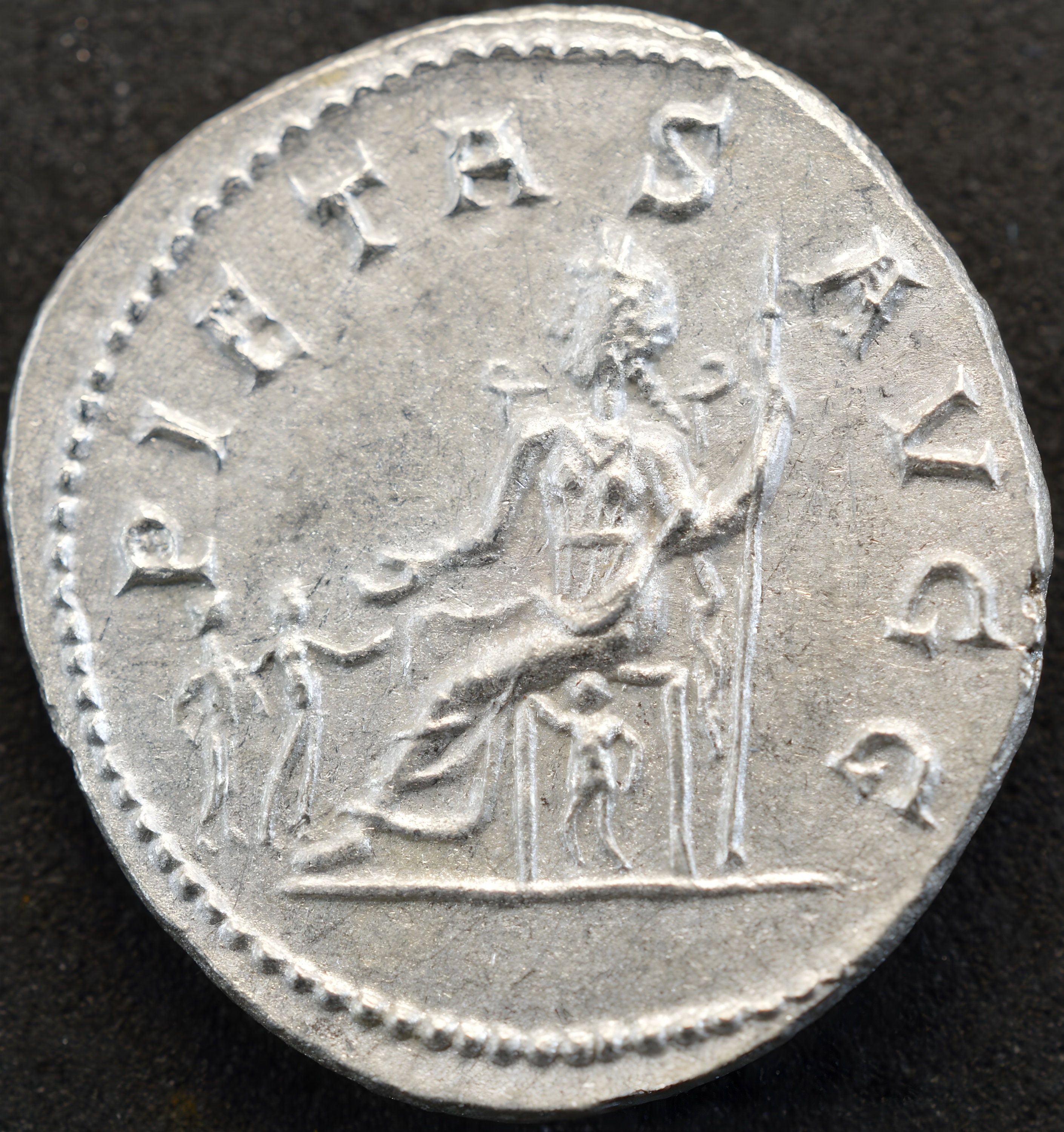 Reverse side: Pietas seated left, holding sceptre in left hand and extending right to two children standing right at her side, another child beneath chair
