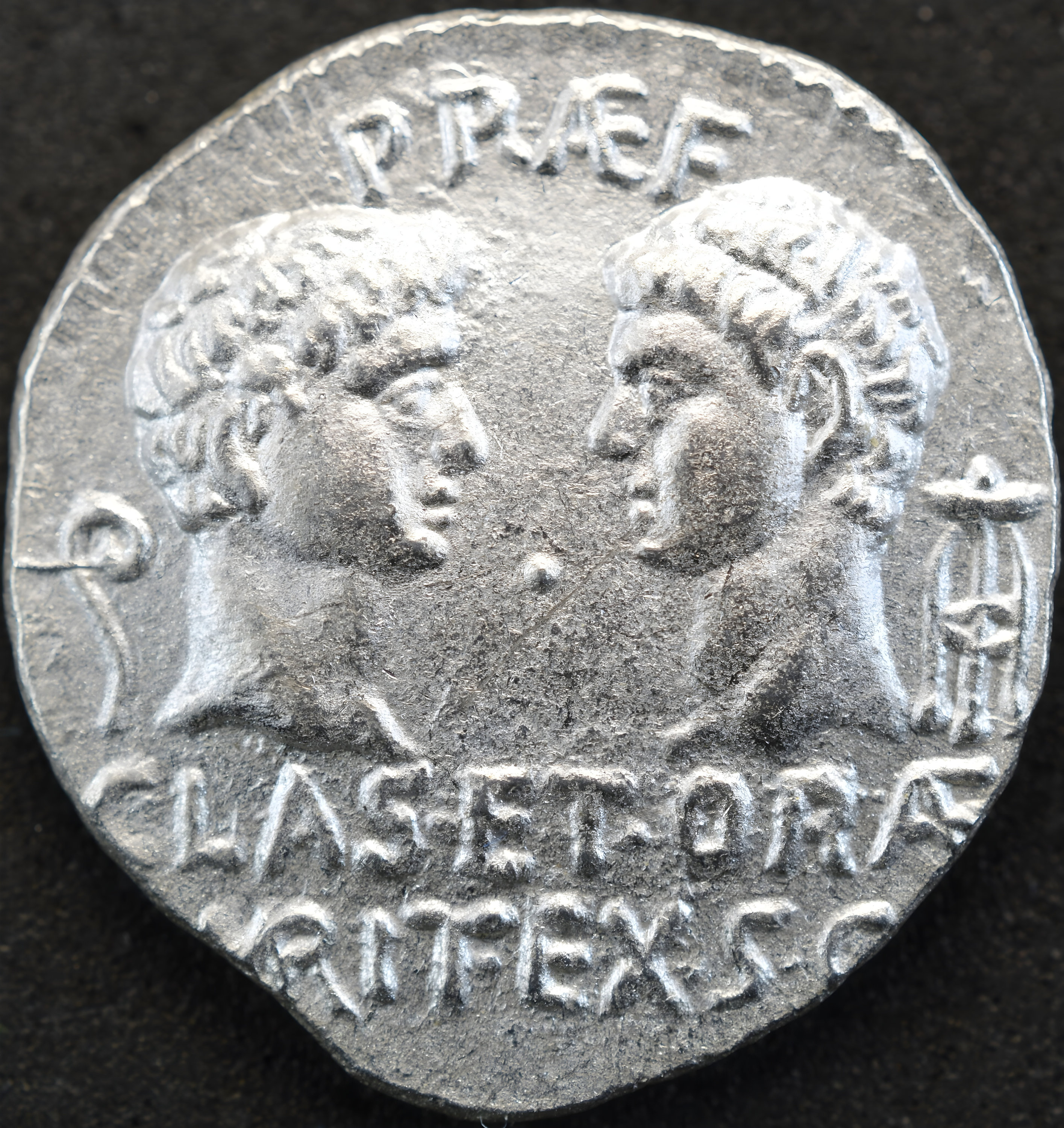 Reverse side: Confronted bare heads of Pompey the Great & Pompey the Younger, lituus & tripod to left & right