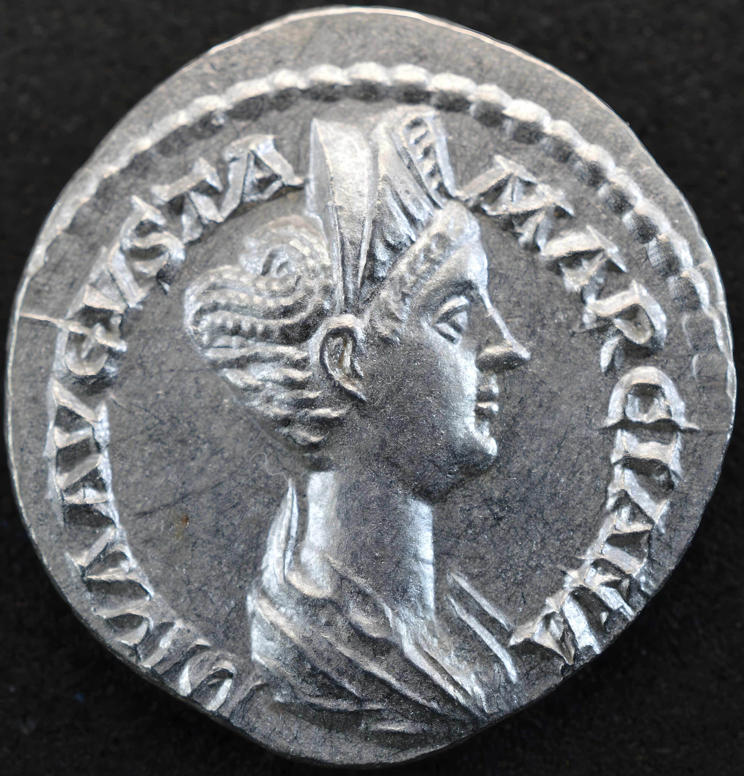 Obverse side: Bust of Ulpia Marciana, diademed, draped, right; hair elaborately arranged and bound into tight bun high at back of head