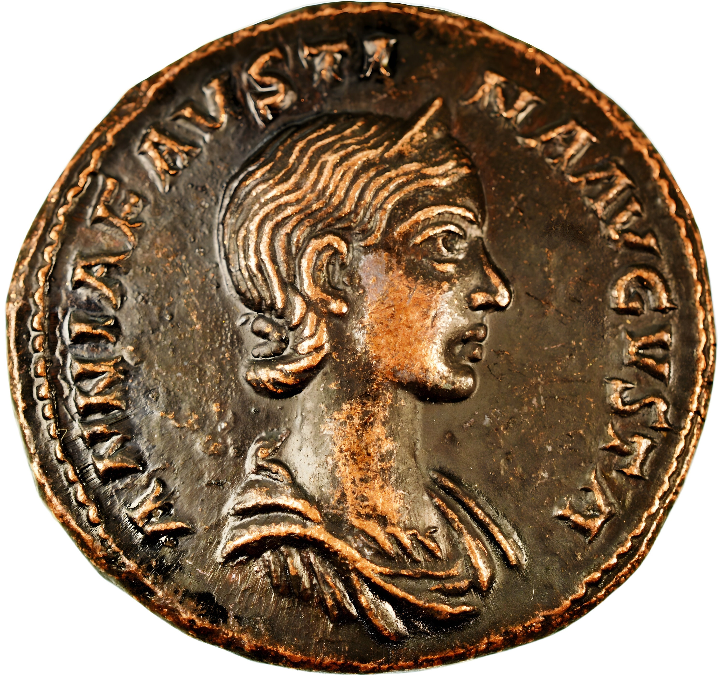 Sestertius of Annia Faustina, third wife of Elagabalus and great-granddaughter of Marcus Aurelius. Her brief marriage to Elagabalus accounts for the extreme rarity of coin bearing her name. It is unclear when she died and under what circumstances as the divorce, although no fault of her own, sent her into obscurity, if not a worse fate. If Julia Paulas and Aquilia Severas are hard to find then you might as well give up all hope on an Annia Faustina. This is one of those truly impossible empresses to acquire… at least insofar as getting a Rome-made coin of hers. Things improve a bit if you ‘re willing to “settle” for a provincial with her name in Greek. These are still difficult to locate and the few that are out there nearly always in very poor shape but at least it provides a reasonable shot at getting one of her coins.