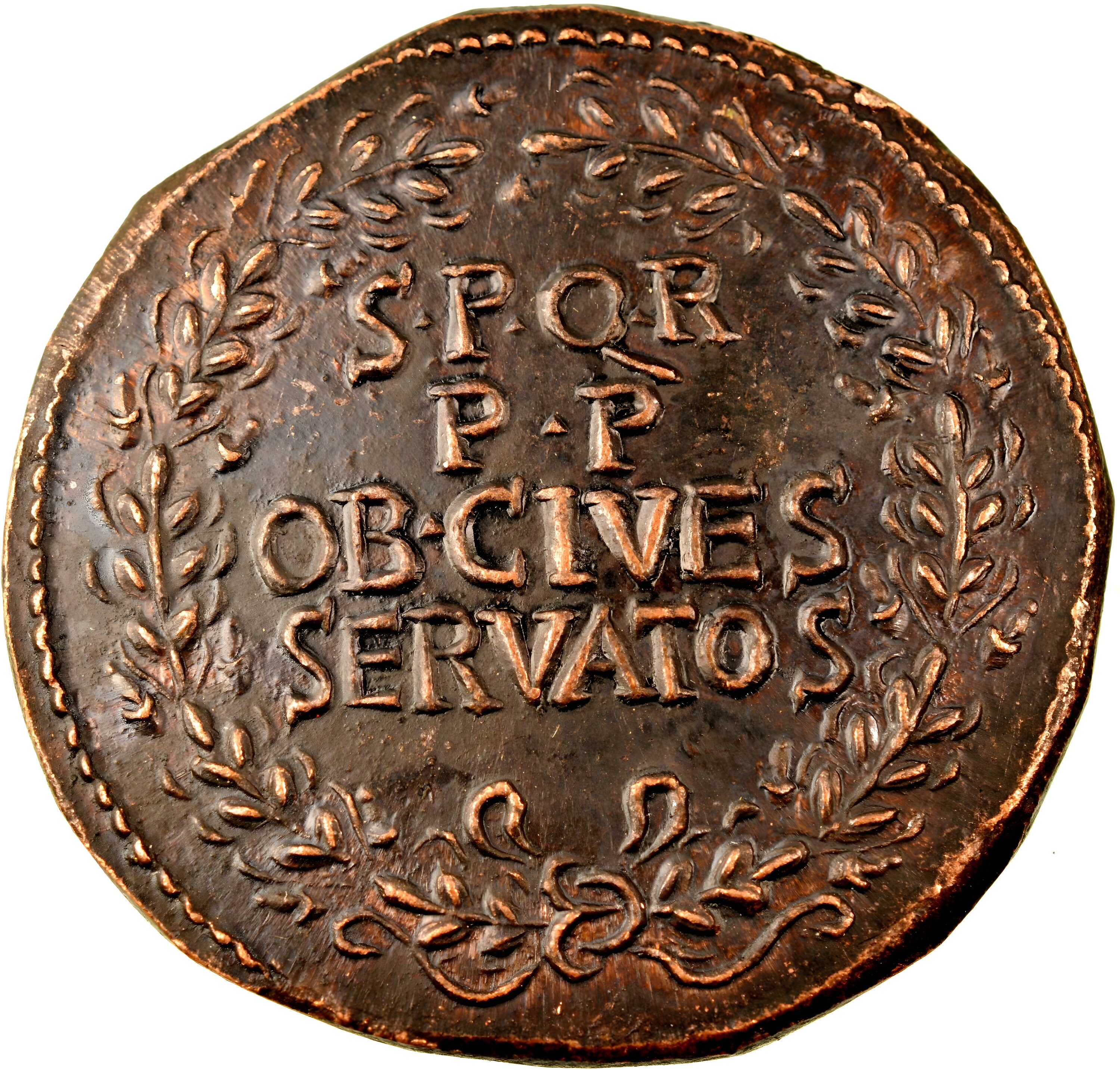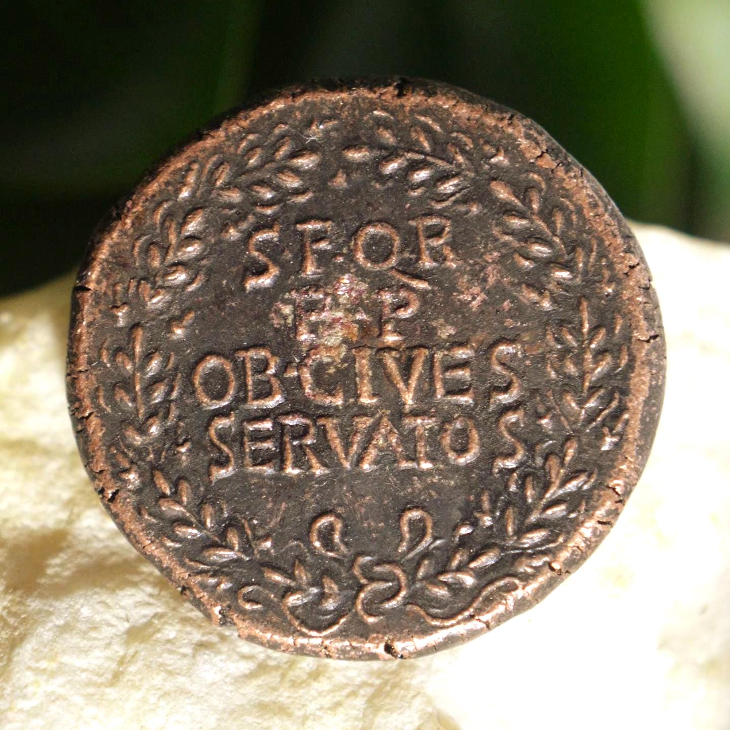 The legend OB CIVIS SERVATOS ″for having saved the citizens″ refers to Corona Civica, a civic crown of oak-leaf. It was a simple honor, in the Roman tradition, awarded by the senate for rescuing a comrade in battle and was placed over the door of the awarded citizen. This honor is rooted in military tradition. The senate awarded it to Octavian ″ob cives servatos″, for rescuing all his fellow citizens. Additionally, oak is associated with Jupiter. The letters S C (Senato Consulto | ″by decree of the senate″, is omitted on this coin. Reason was probably to avoid reference to two different decrees of the Senate on the same coin. We see this also on Corona Civica sestertii of Claudius and Caligula′s Carpentum sestertius for his mother, with reverse legend SPQR MEMORIAE AGRIPPINAE.
