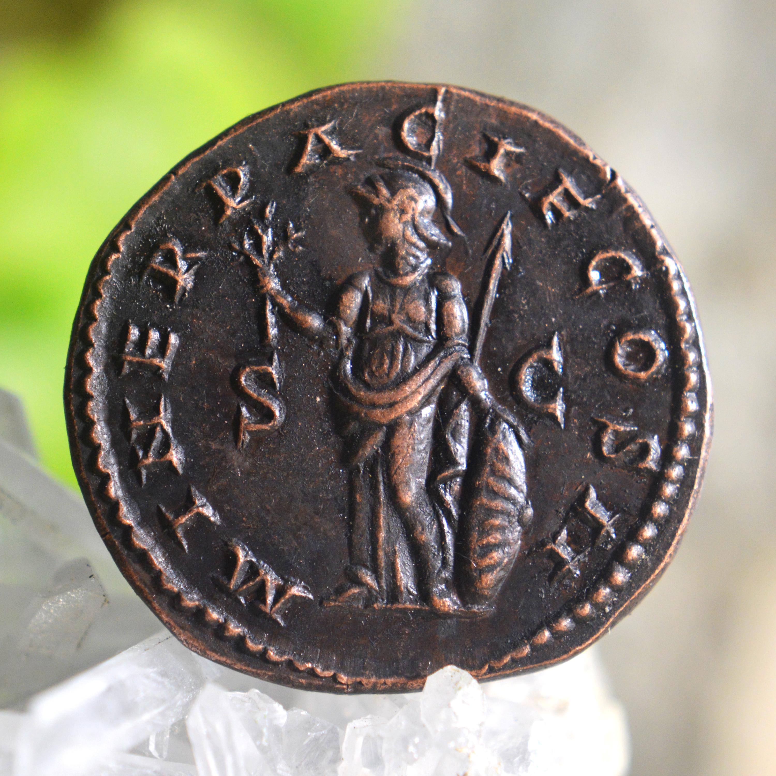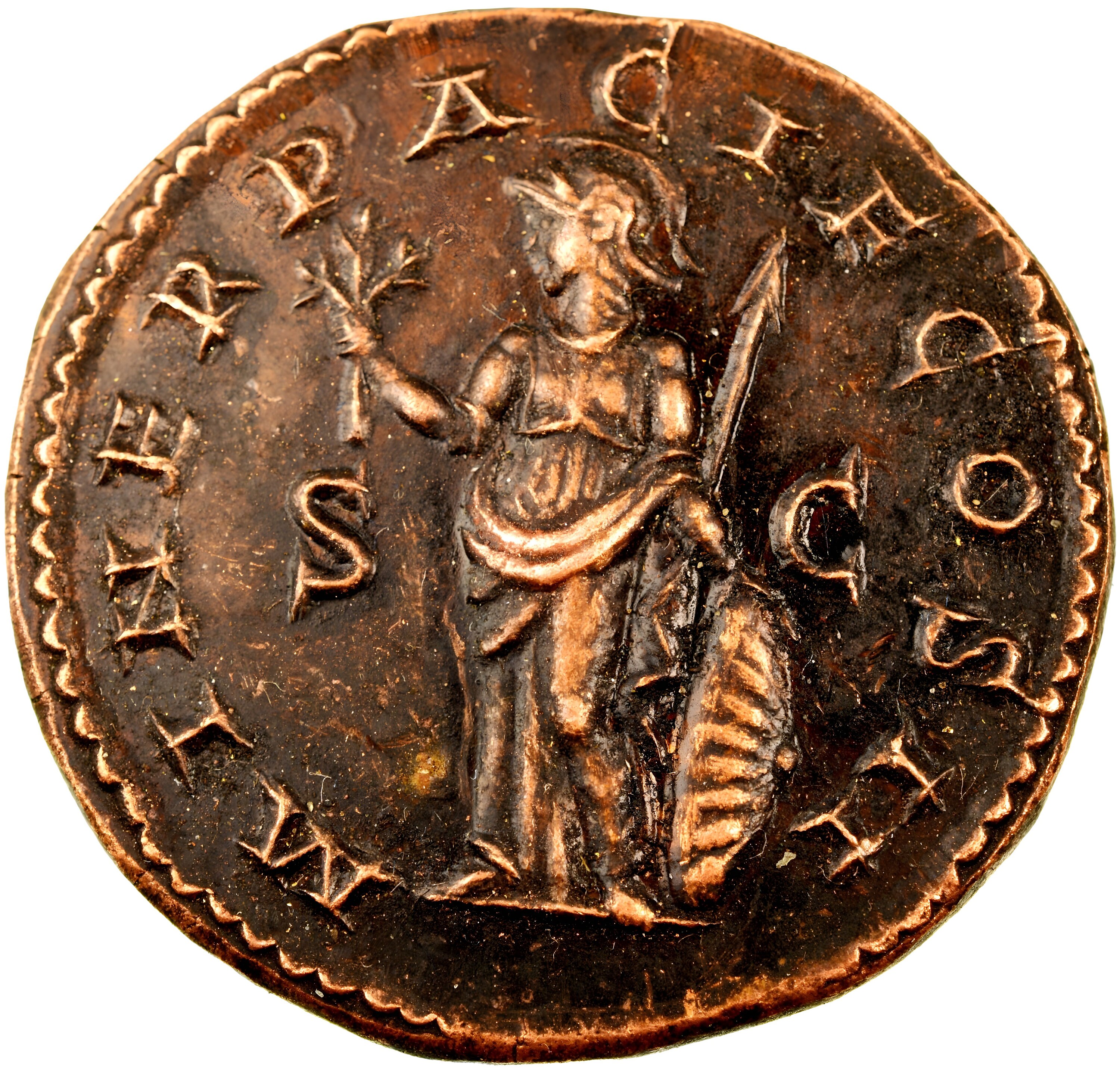 Reverse side: Minerva standing left, holding branch, spear & shield