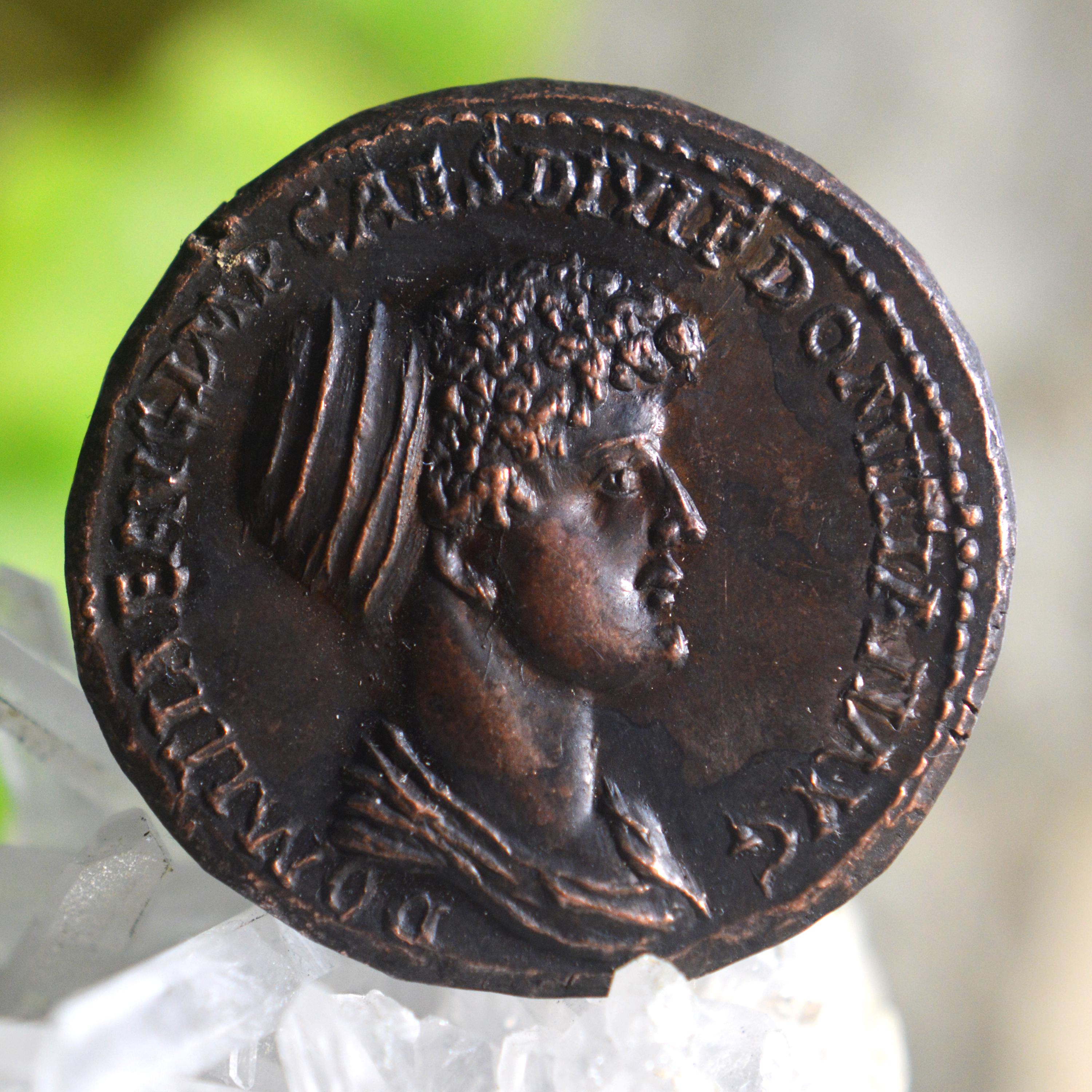 Domitia Longina, the daughter of Nero’s famed general Corbulo and a woman who possessed a rather shady reputation, was the mistress of Domitian before the two were married sometime after 70 AD. The union produced two children, a girl first and a boy the following year, though the dates of their births are not secure, and who dashed any dynastic hopes with their early deaths. In 82 AD, since Domitia was hailed as Augusta, she had apparently given birth to the girl. The boy was born in 83 AD, though he seems to have died shortly thereafter and been subject to almost-immediate apotheosis, as the legend DIVI CAESAR(IS) MATRI shows. While the figure of Pietas represents Domitia, the small figure before her, designed to represent the boy, seems clearly not to conform to the new-born depicted elsewhere on his coinage. Moreover, scholars have assigned Domitian’s subsequent exile of Domitia to the same year. Our coin shows she remained in favor long enough for the boy’s deification, though that period was quite brief, given Domitian’s mercurial nature.