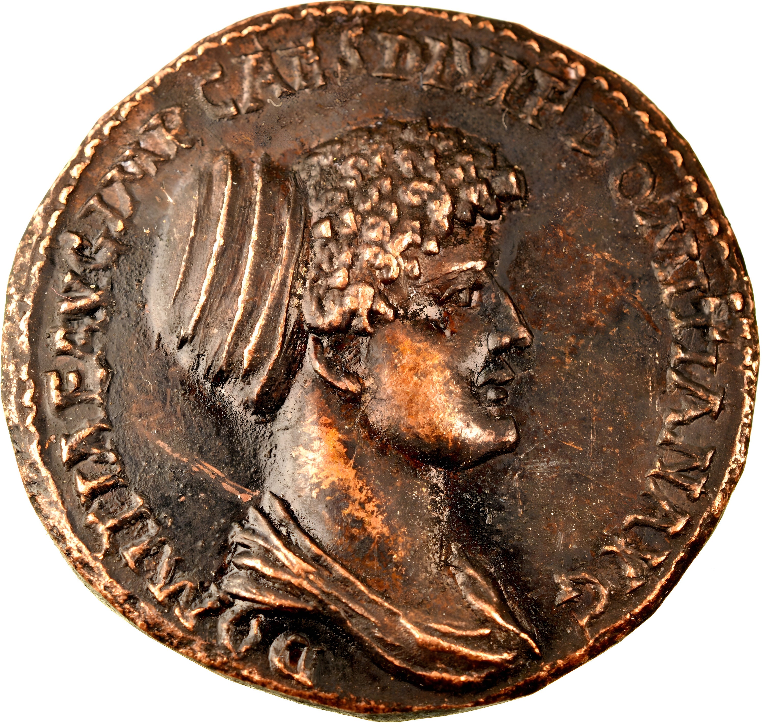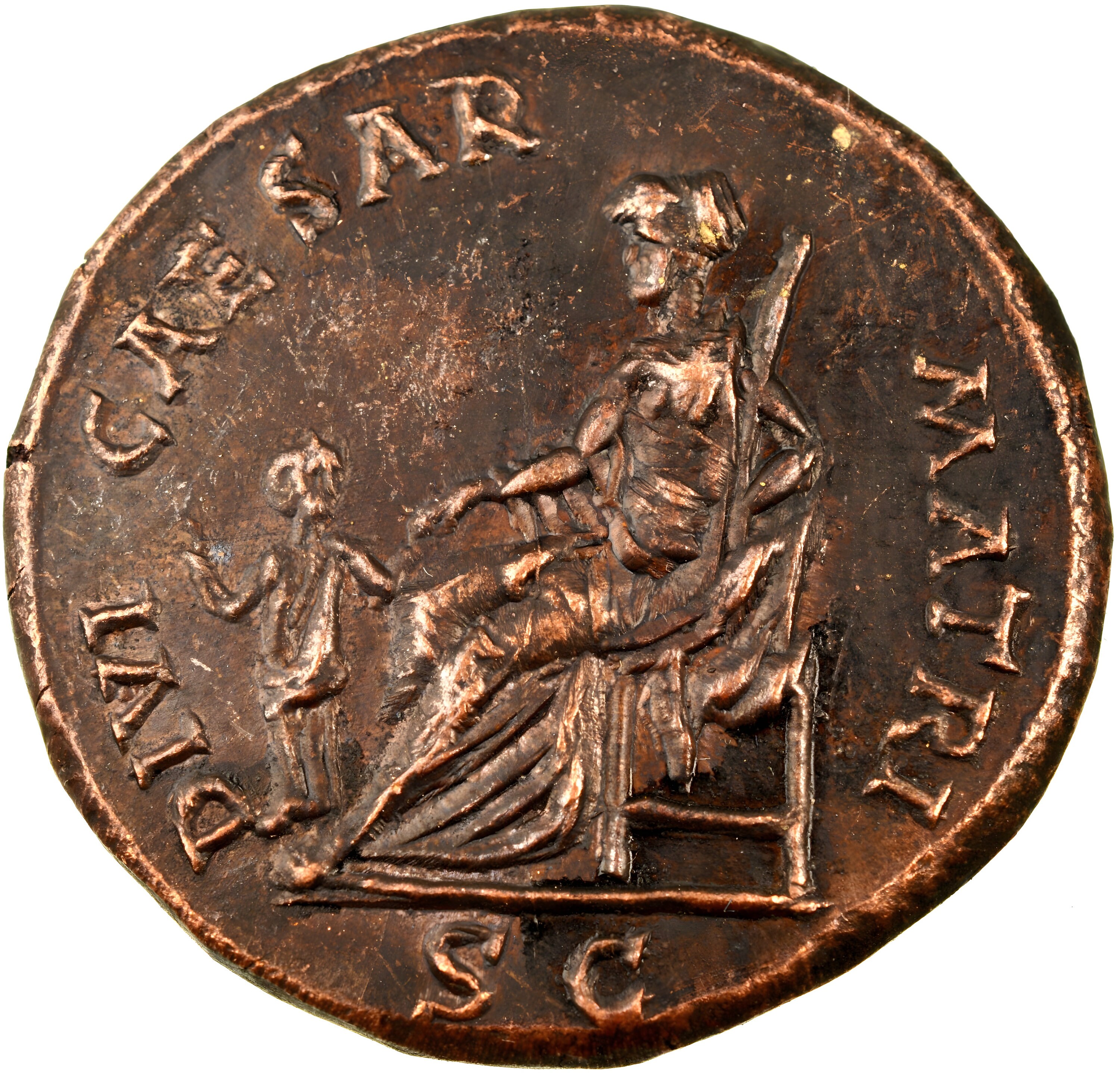 Reverse side: Domitia seated left, holding sceptre, extending hand to child standing facing before her
