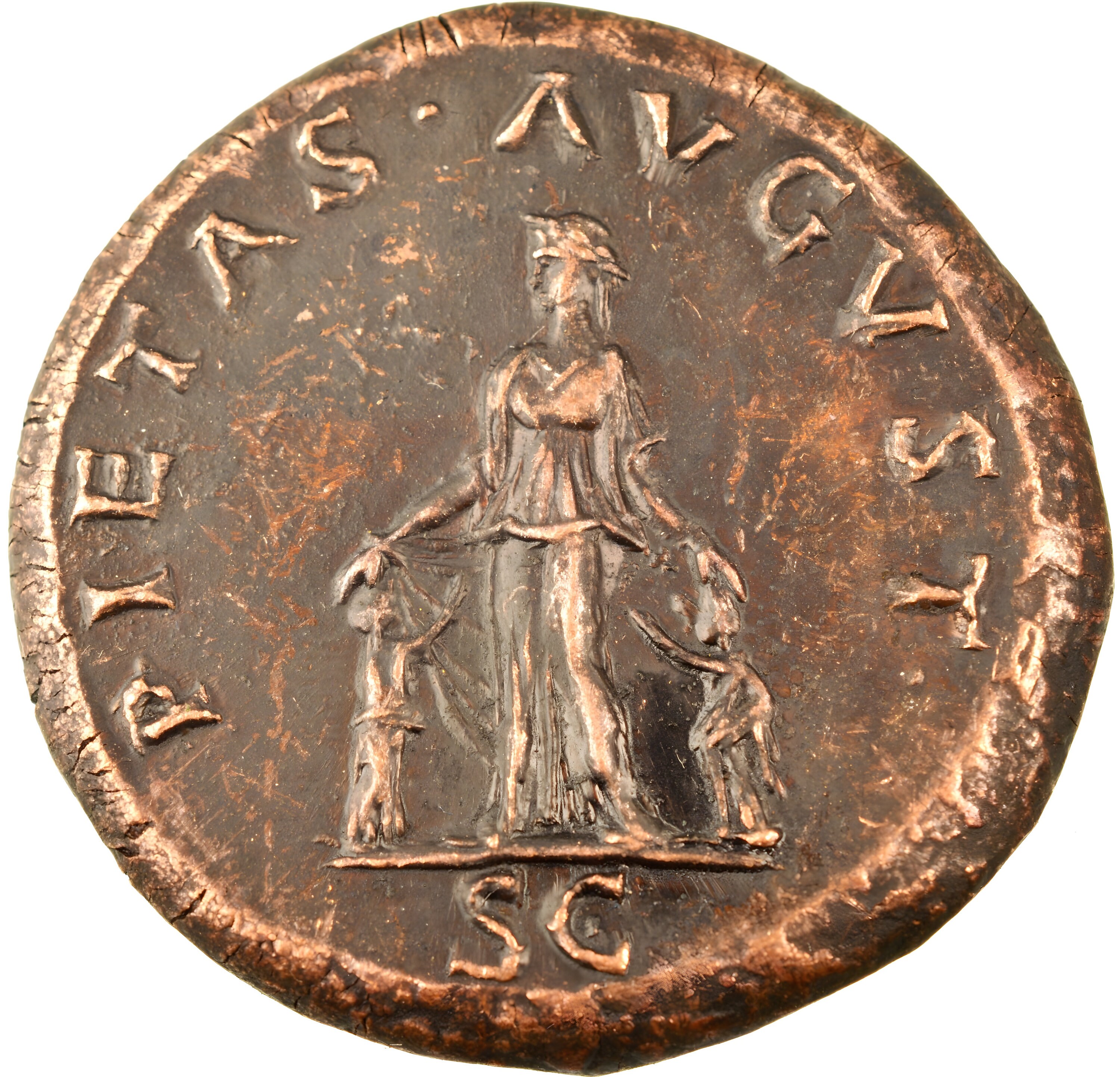 Matidia the daughter of Marciana and niece of Trajan; she was the mother of Sabina, who became the wife of Hadrian. She was declared Augusta along with Plotina, by a decree of the Senate about 113. Possessing all the virtues of her mother, she equally received with her the honors of the apotheosis, under the reign of Hadrian, some say of Antoninus Pius. The coins of Matidia, like those of Plotina and Marciana, are in each metal of the highest degree of rarity, especially the sestertius. On these she is styled MATIDIA AVG F – MATIDIA AVG DIVAE MARCIANAE Filia – also DIVA MATIDIA SOCRVS.