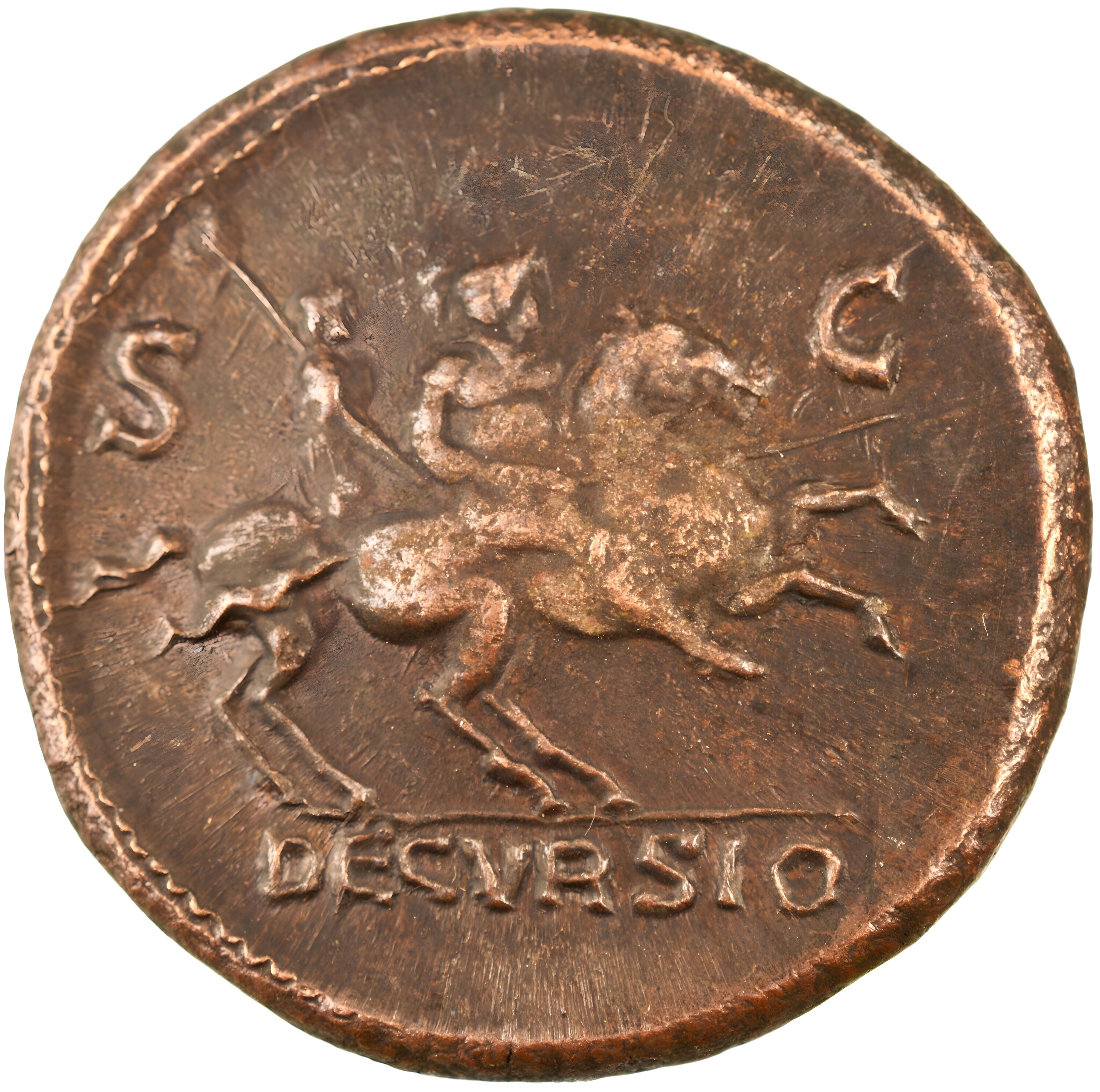 Reverse side: Nero, bare-headed, cuirassed, cloak flying behind, prancing right on horseback, holding spear; in front and behind, mounted soldier riding left holding vexillum over shoulder