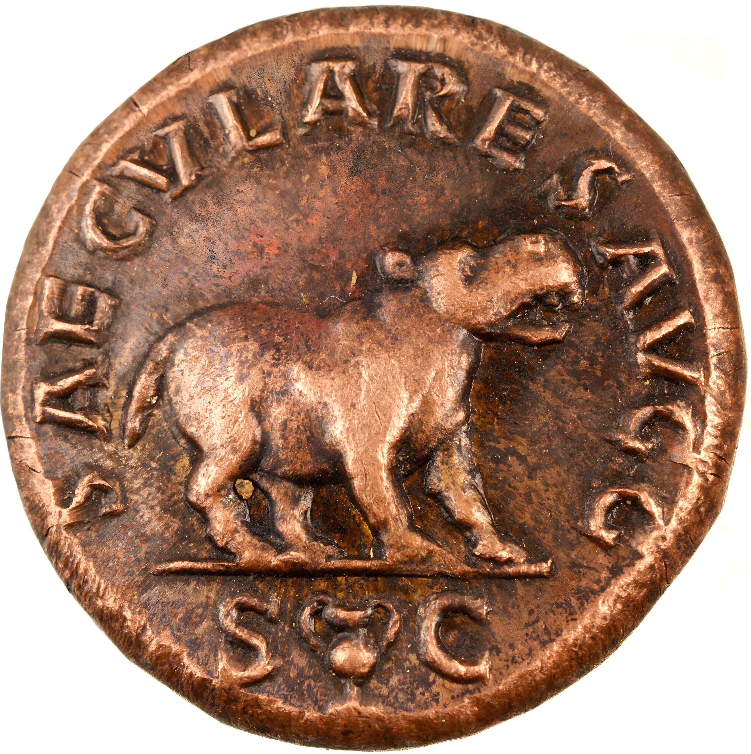 Rev.: Hippopotamus advancing right, head raised. Text around SAECVLARES AVGG, exergue SC